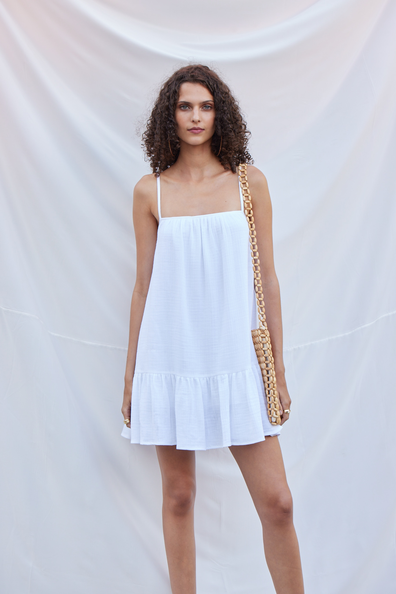 İnce ayarlanabilir askılı,Sırtı lastikli, Askılı mini fırfırlı elbise beyaz.