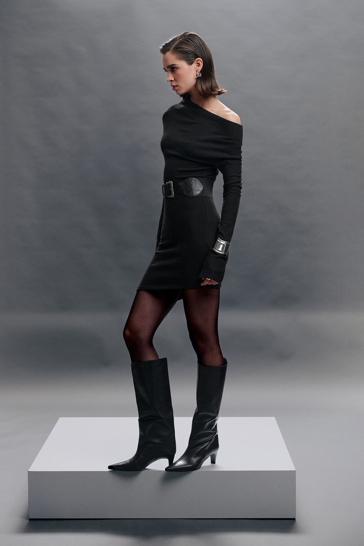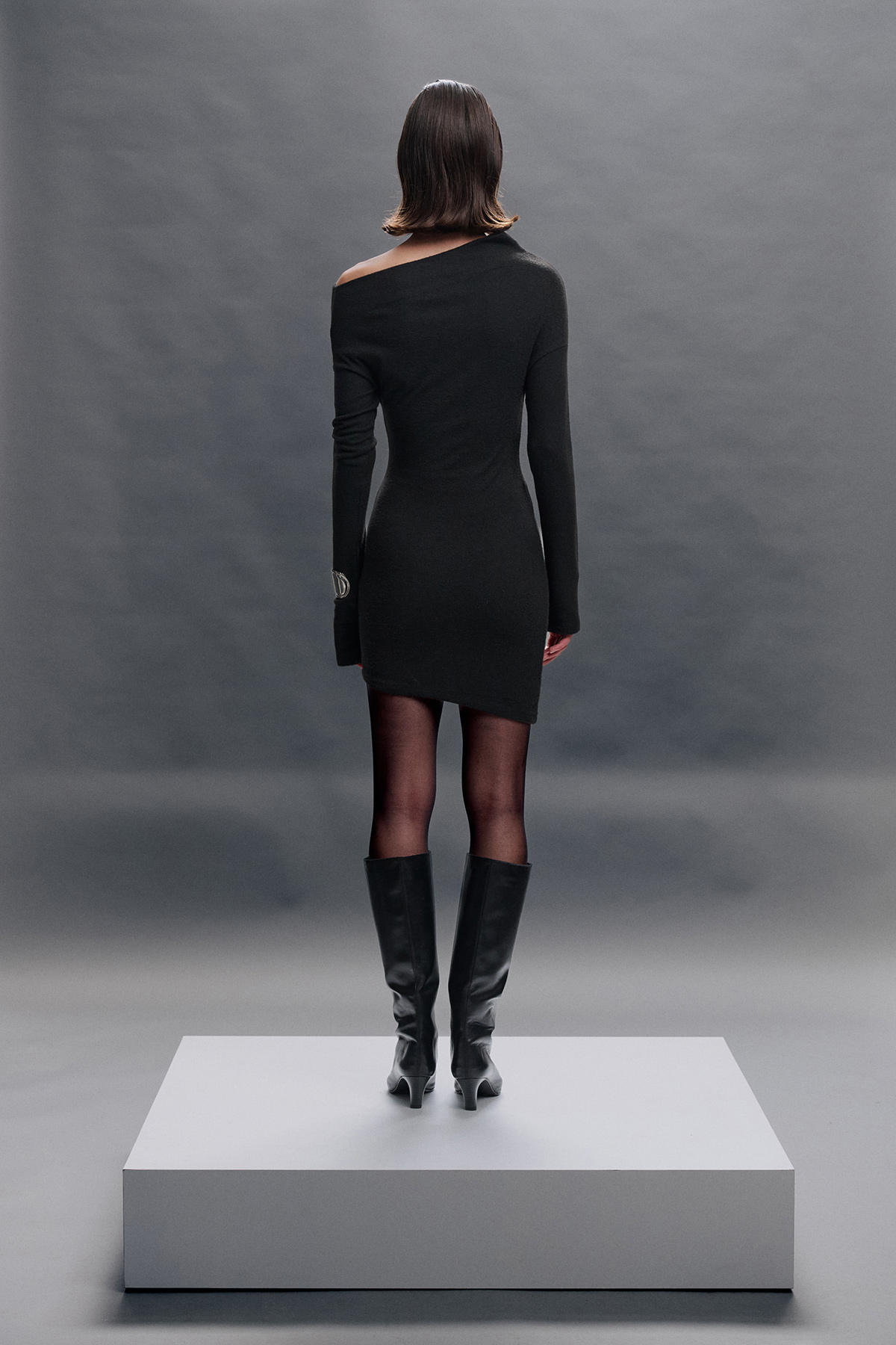Asimetrik yaka , vücuda oturan, örme kumaş, mini elbise.