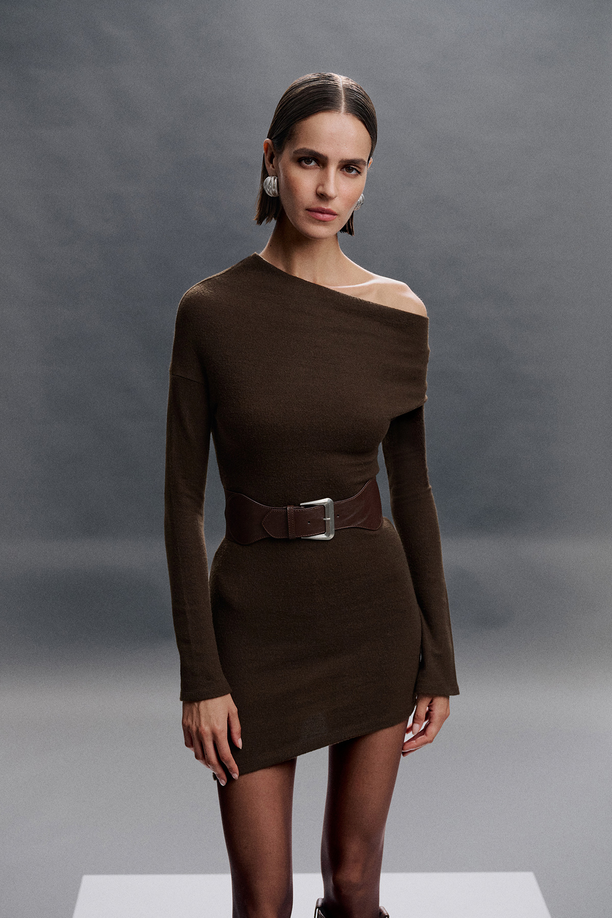 Asimetrik yaka , vücuda oturan, örme kumaş, mini elbise.