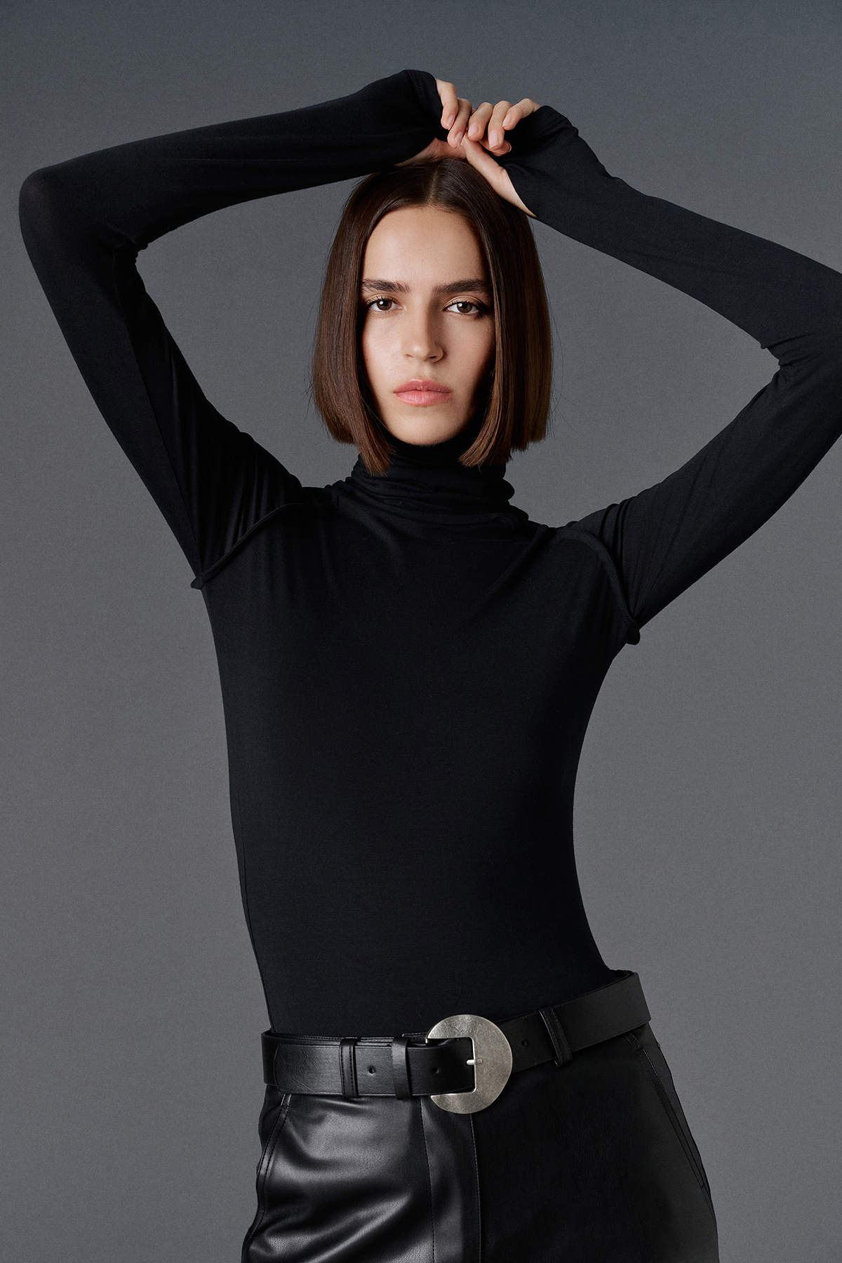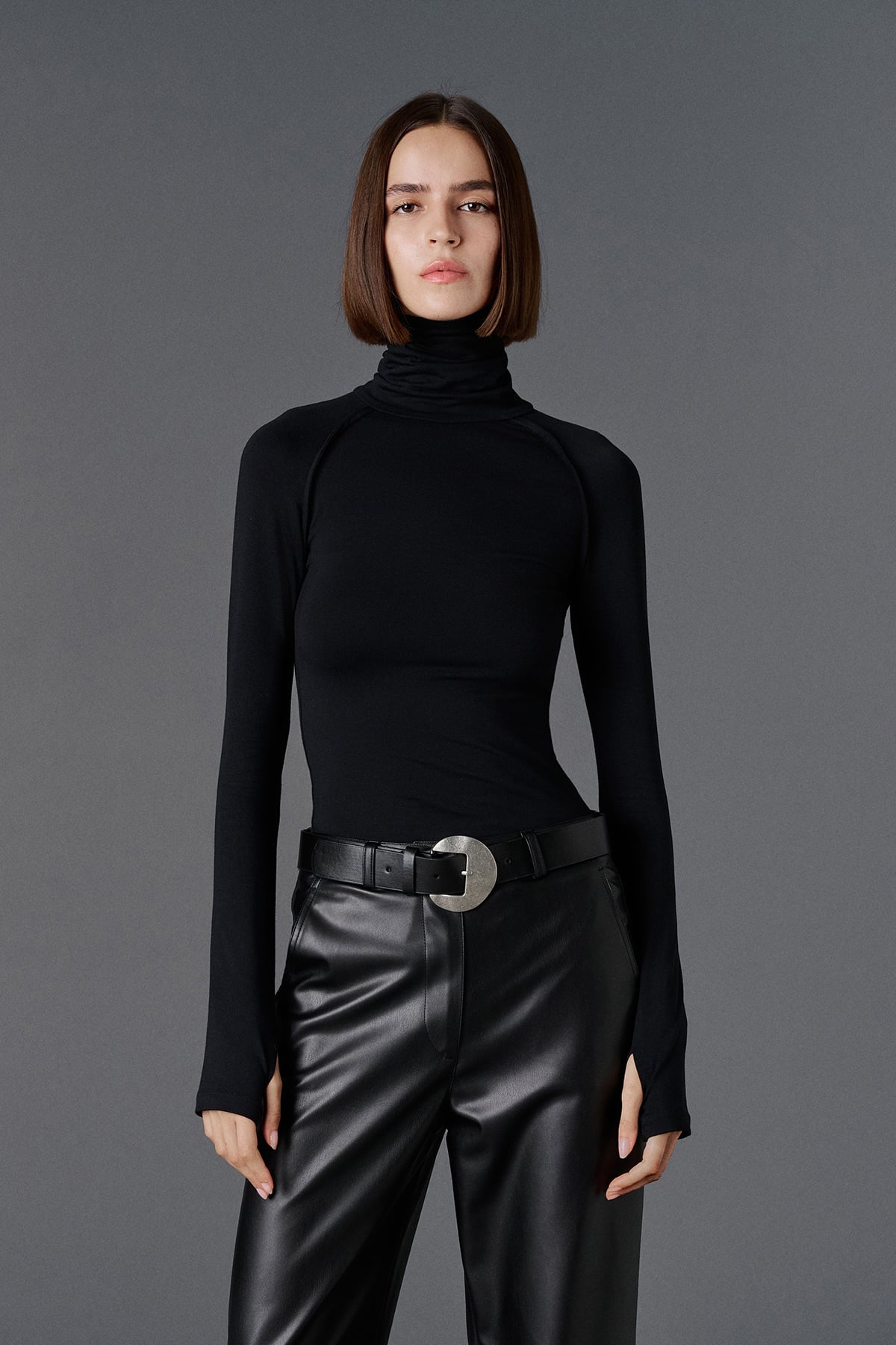 Balıkçı yaka, esnek kumaş, kol ucundan parmak geçirme detaylı, raglan kol detaylı, örme, tam kalıp, basic bluz.