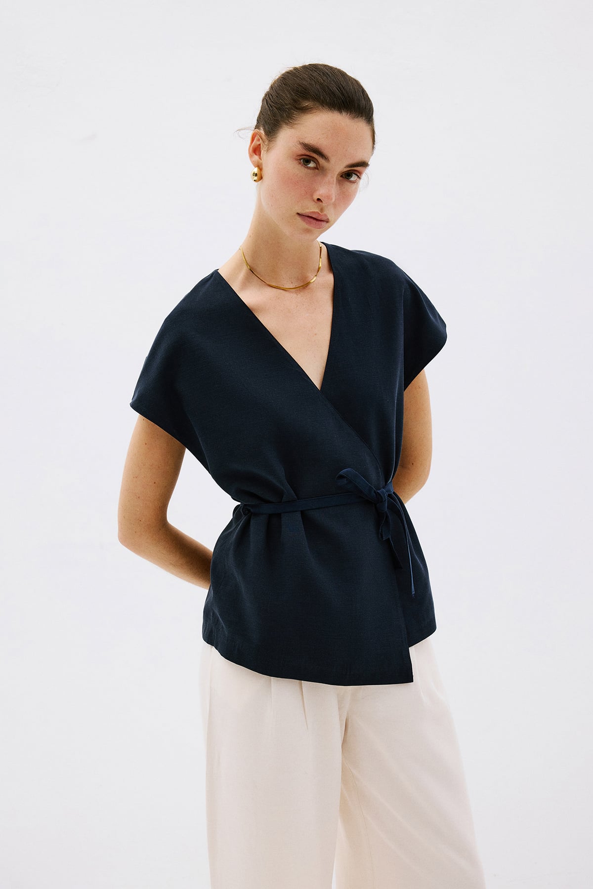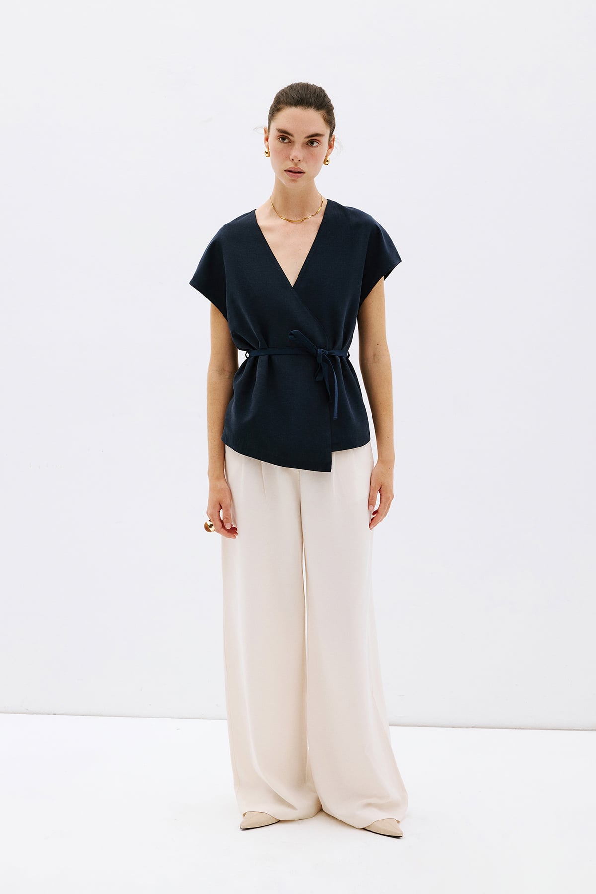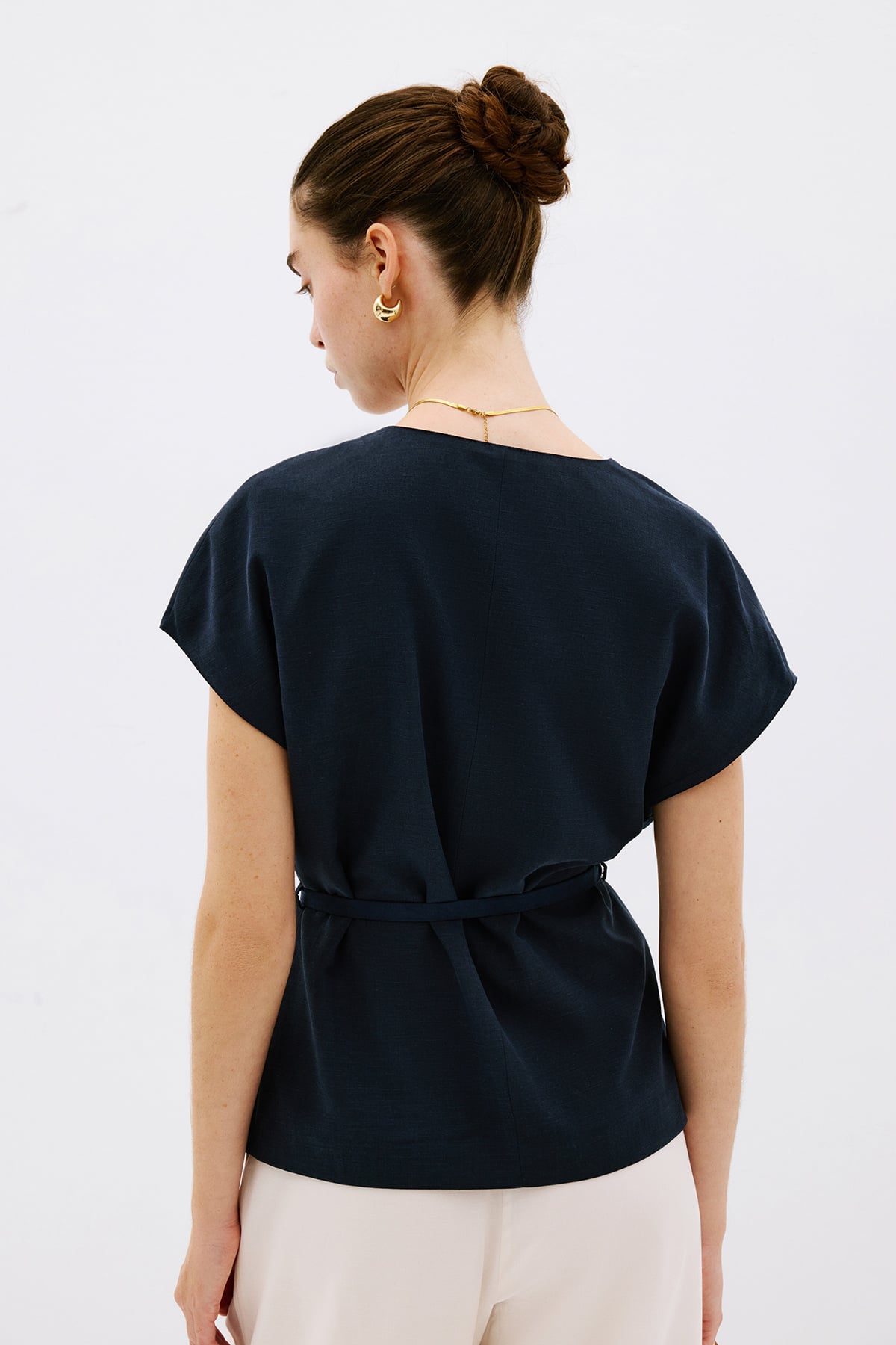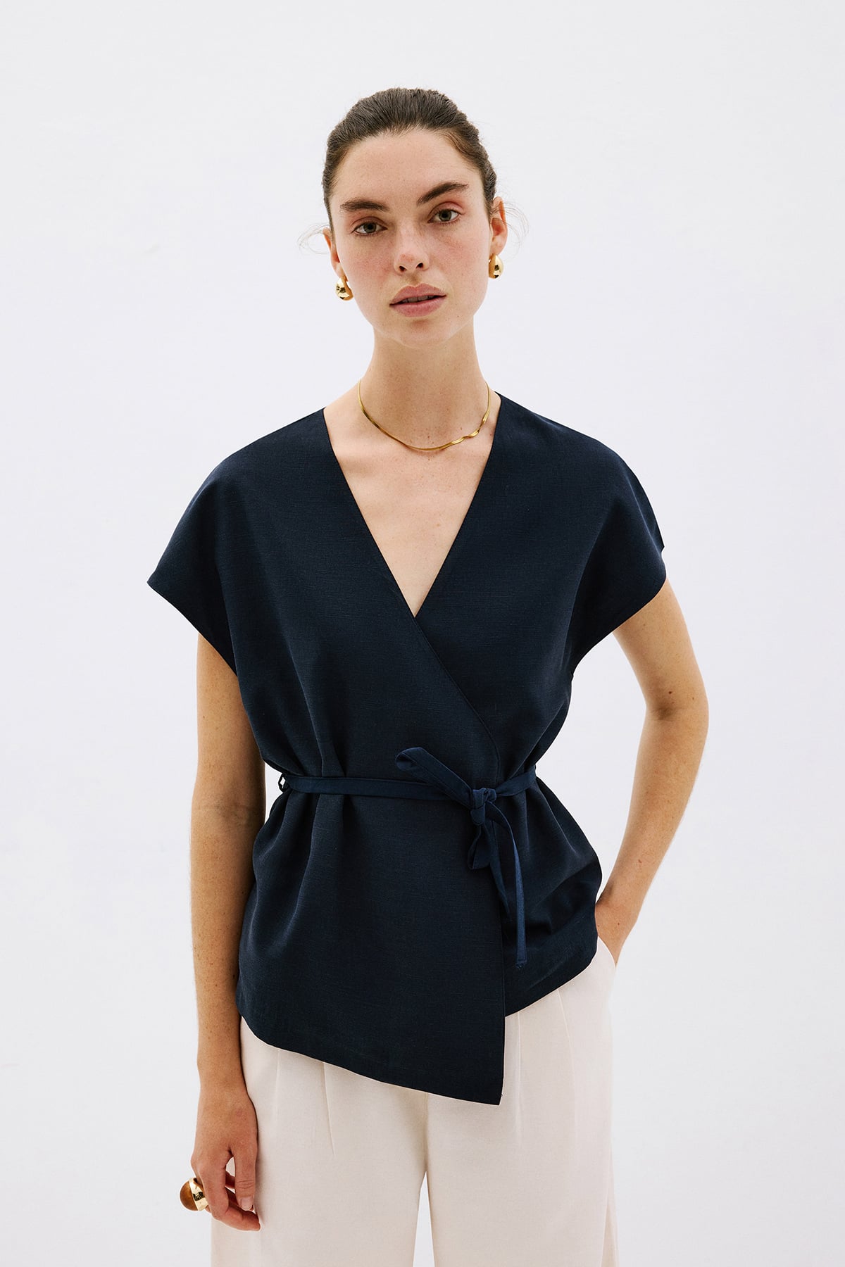 V yaka, kısa kollu, beli bağlamalı yelek bluz