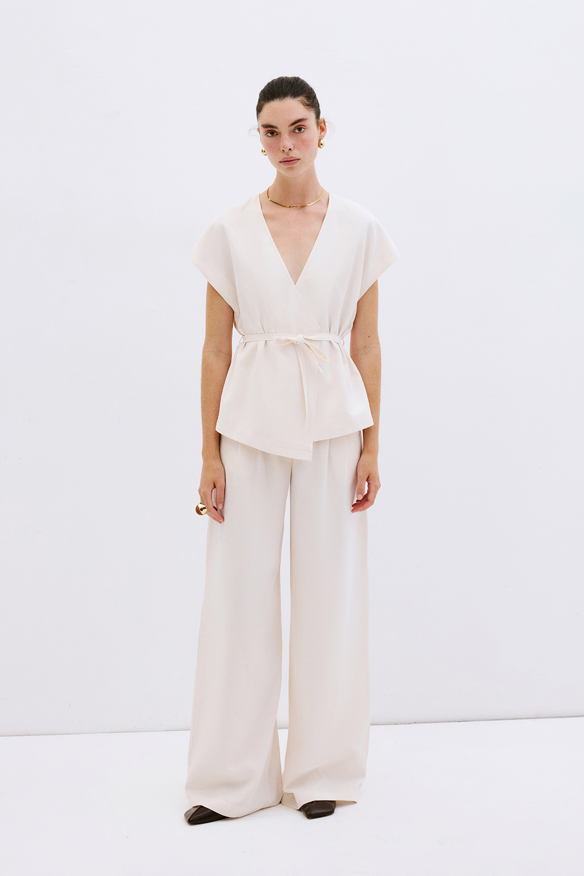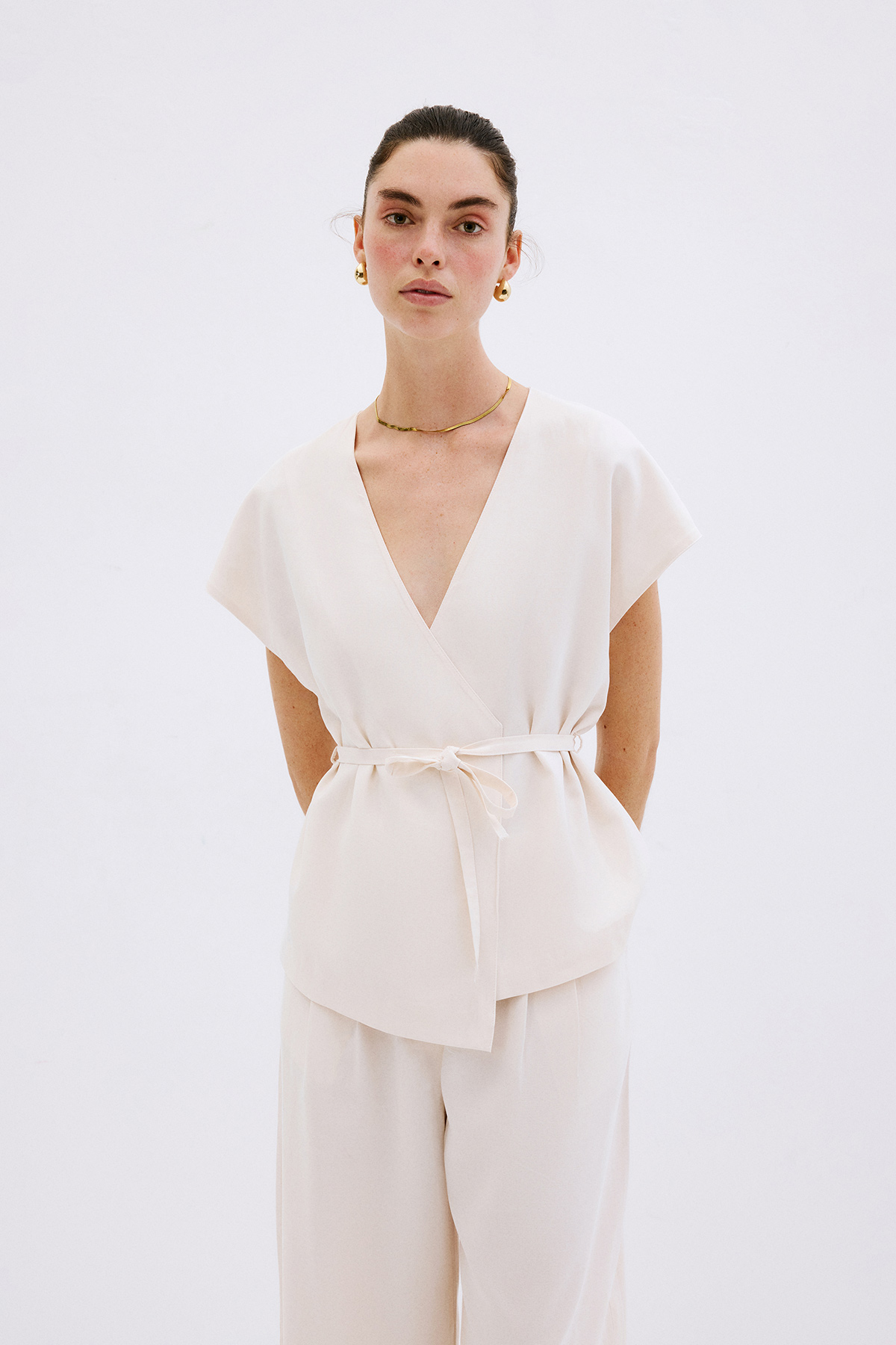 V yaka, kısa kollu, beli bağlamalı yelek bluz