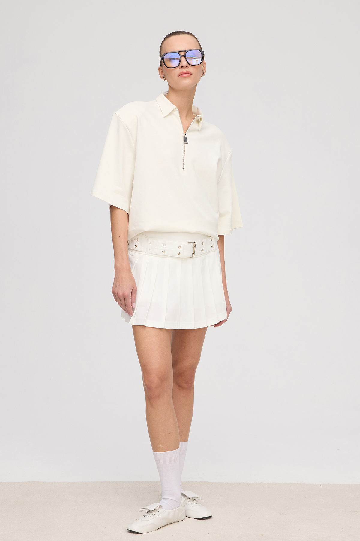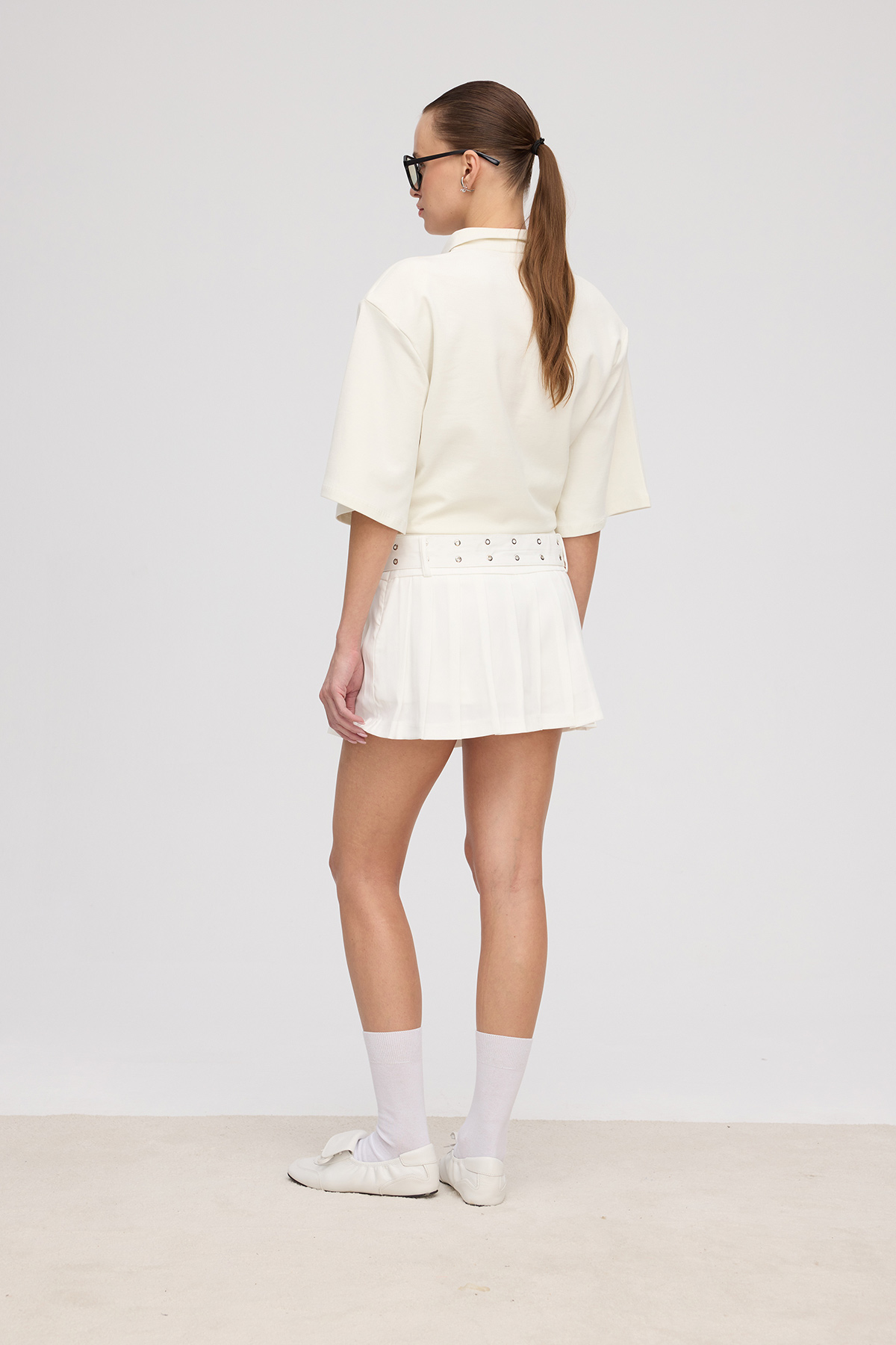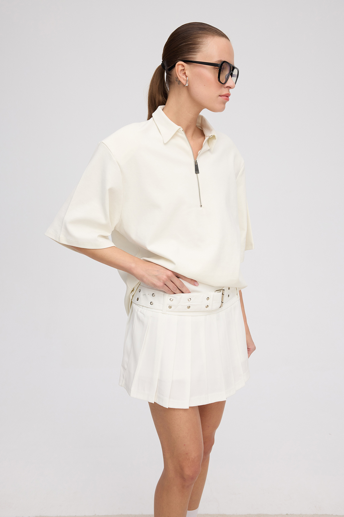 Yüksek bel, pilili, astarlı, kemerli, iç göstermeyen mini etek