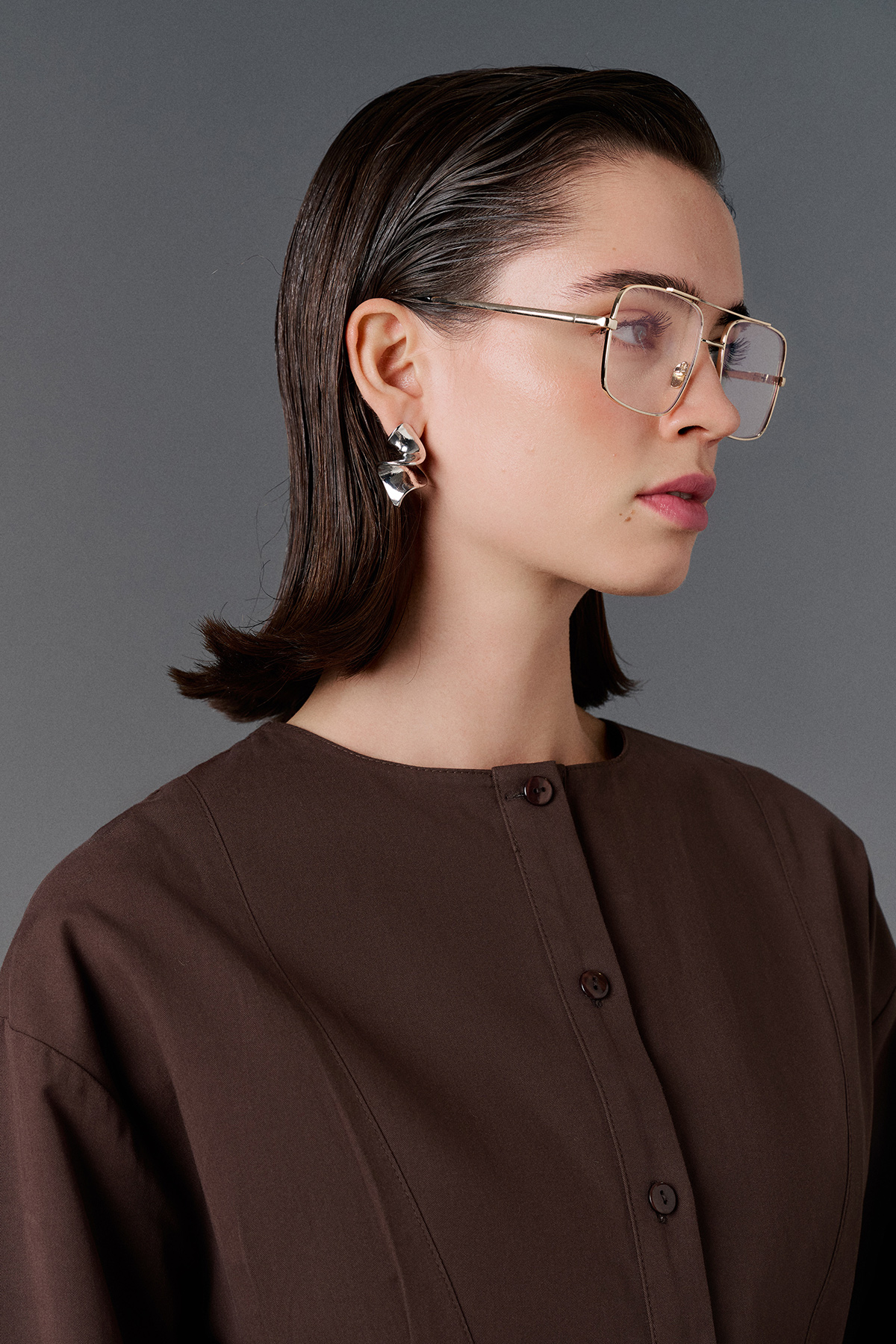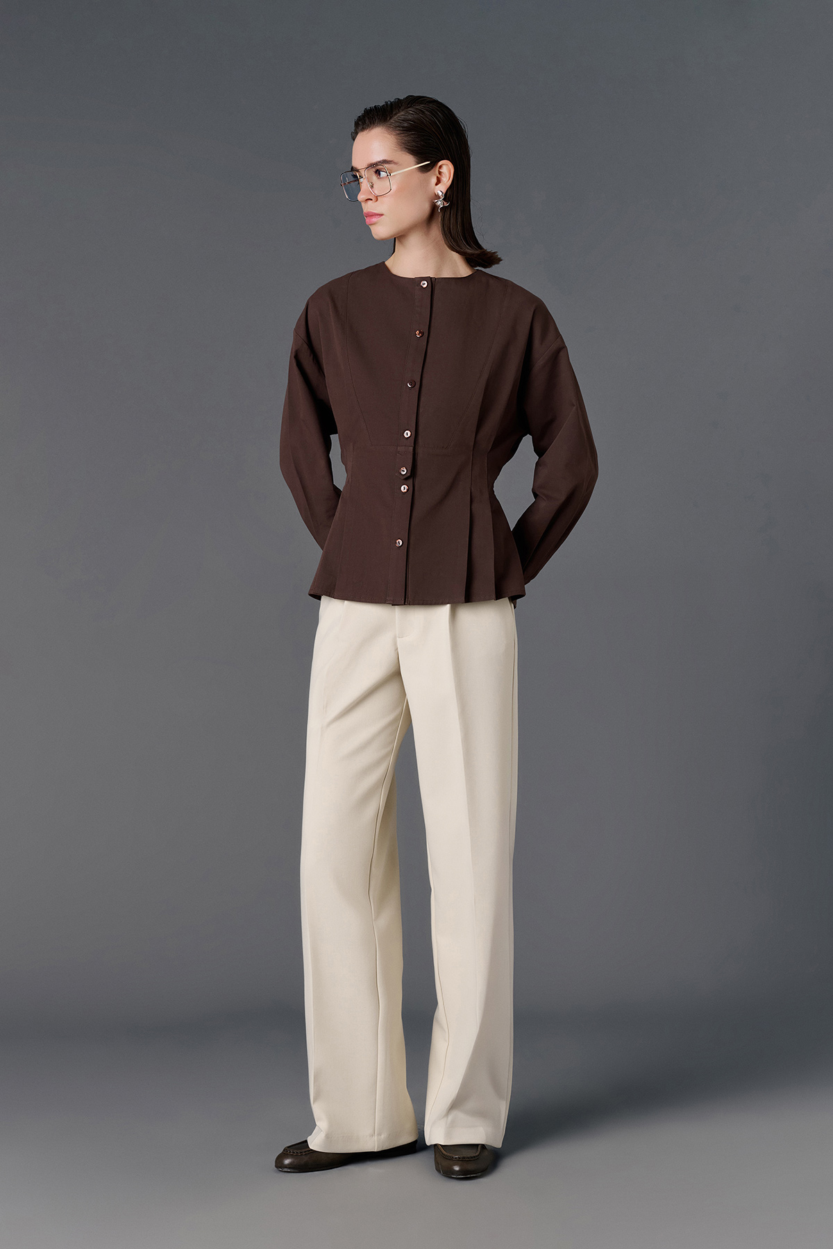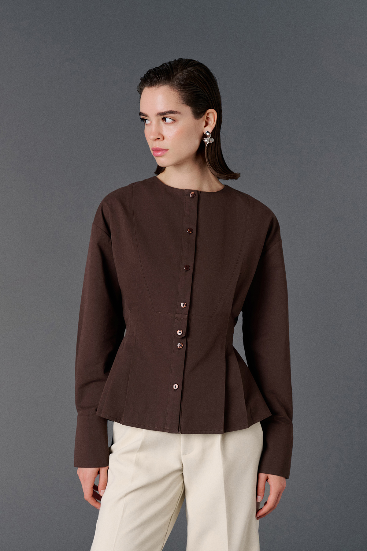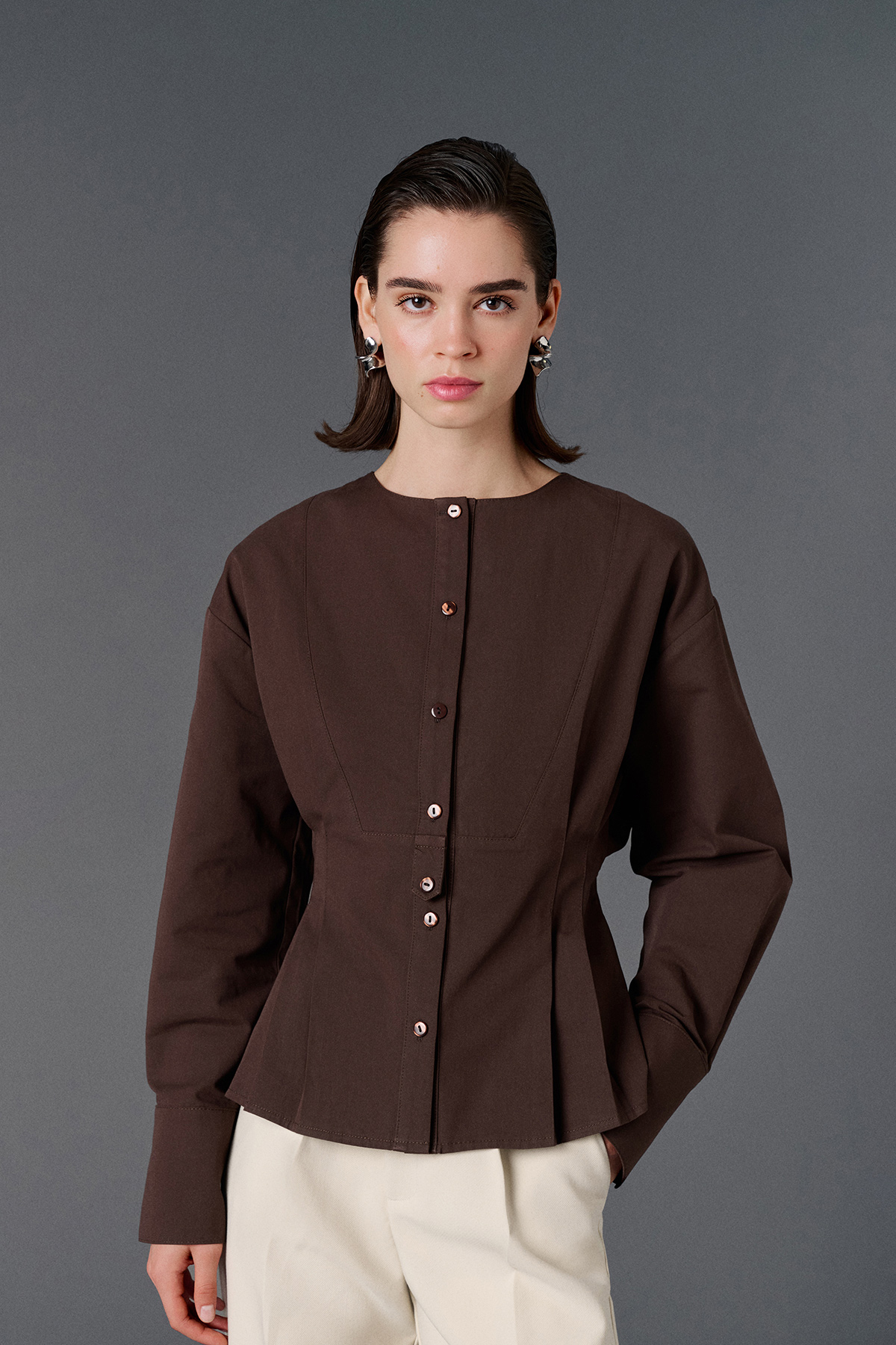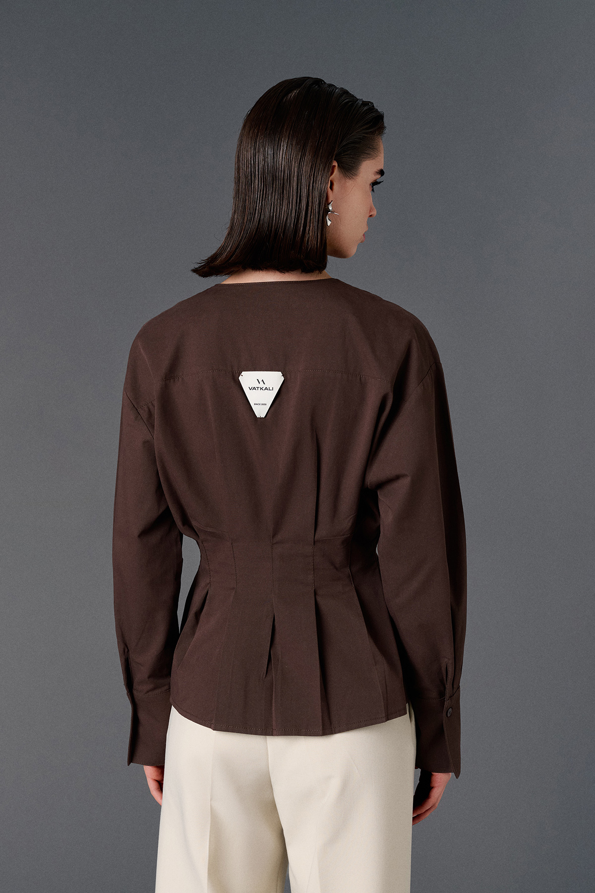 Bisiklet yaka, astarsız, bele oturan, düğme kapamalı, arka logo detaylı, geniş manşetli gömlek.