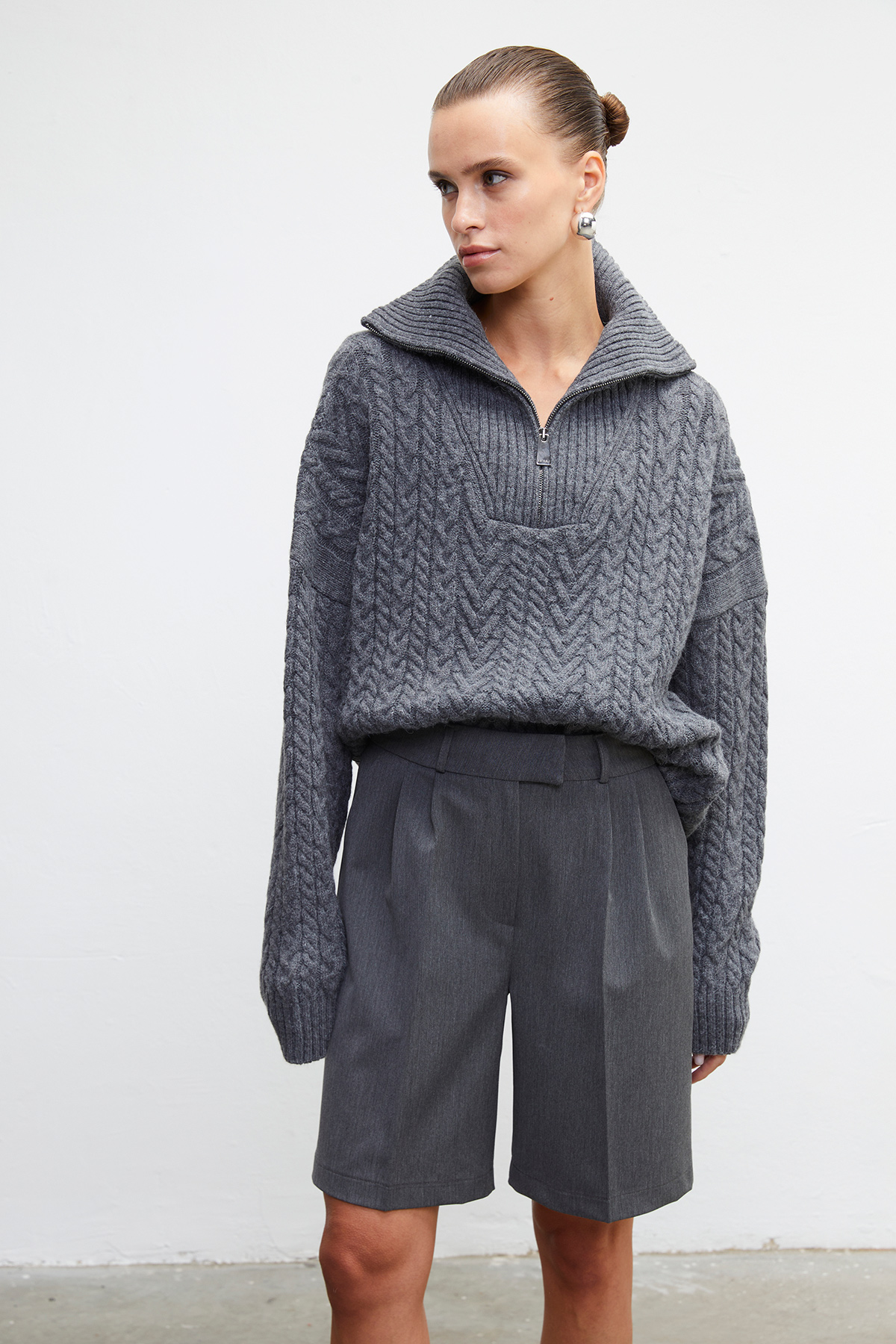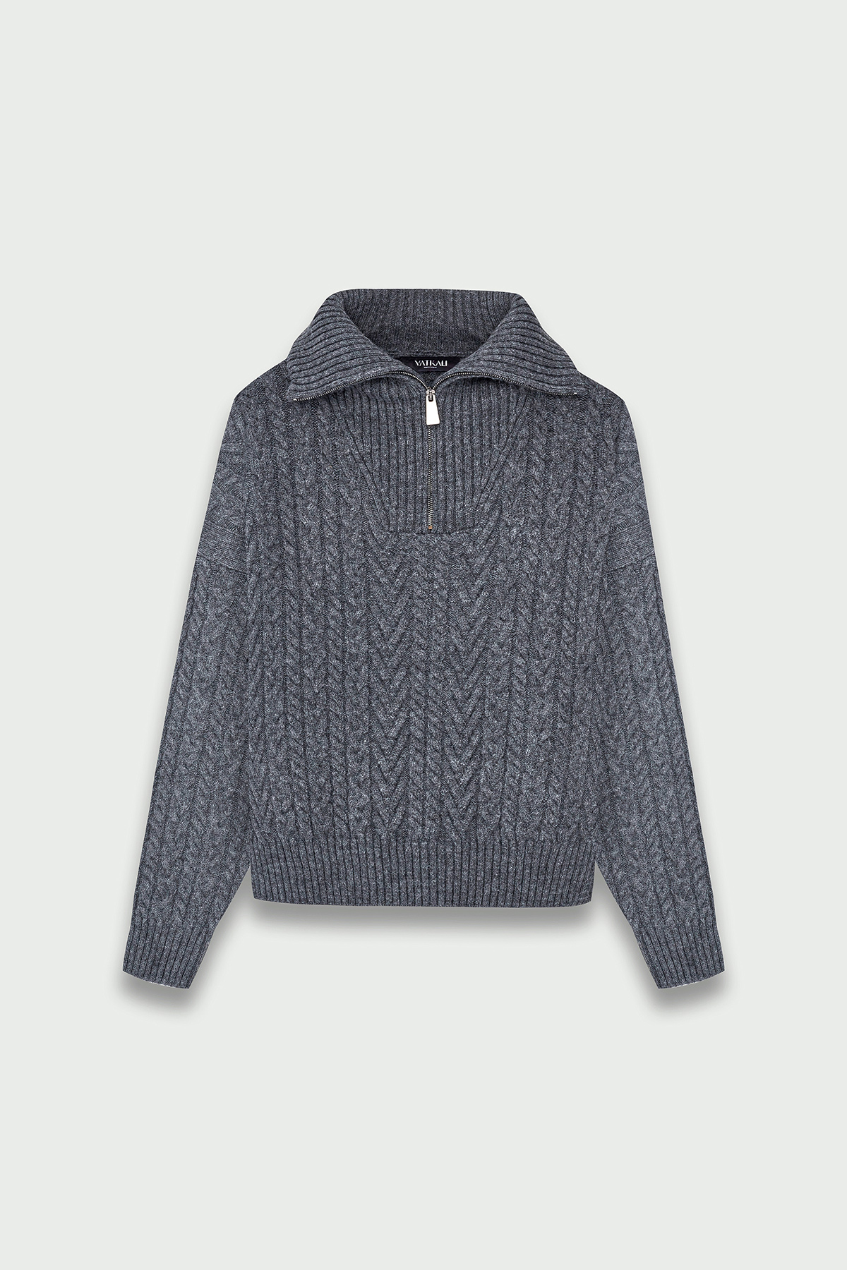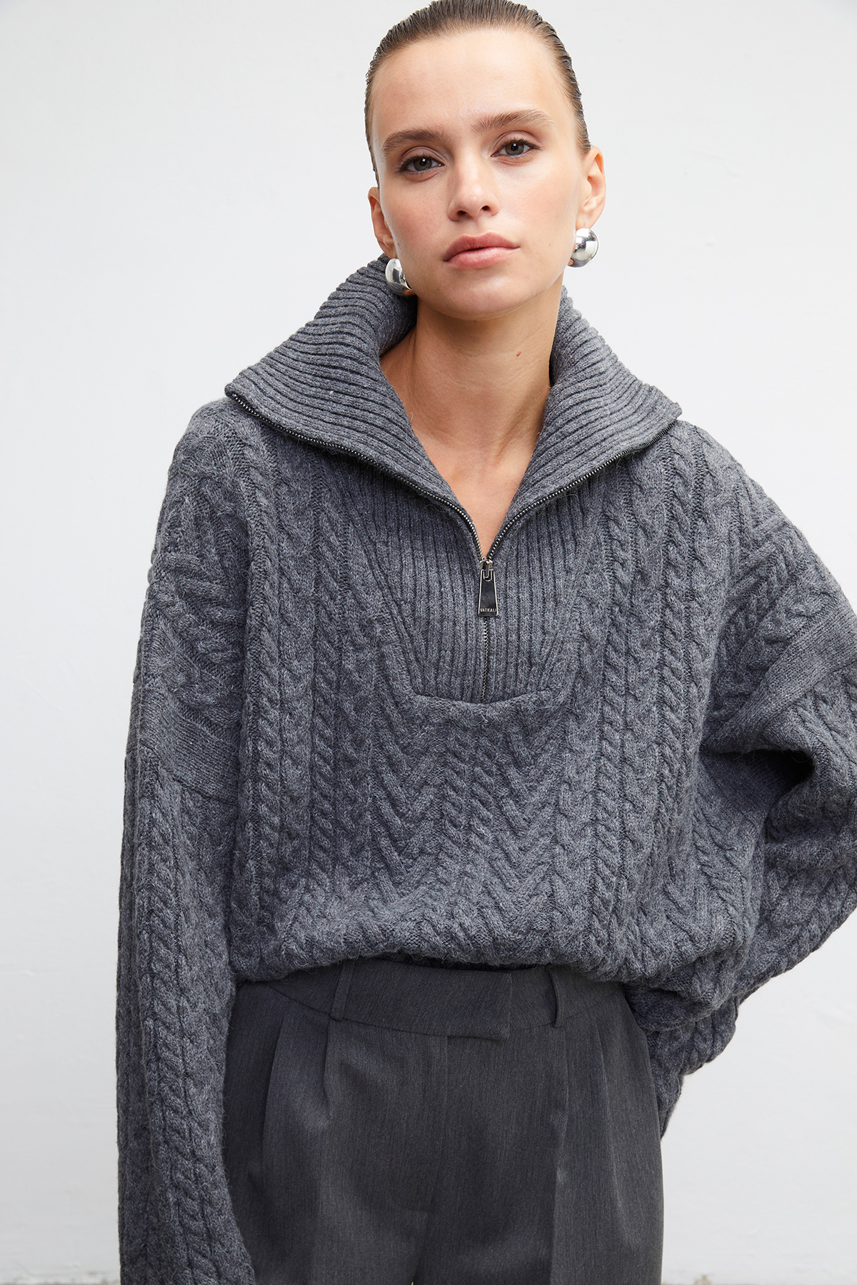 Boğazlı, önü fermuar detaylı, kalın örgü kumaşlı ve örgü desenli, yumuşak dokulu, kadın kazak