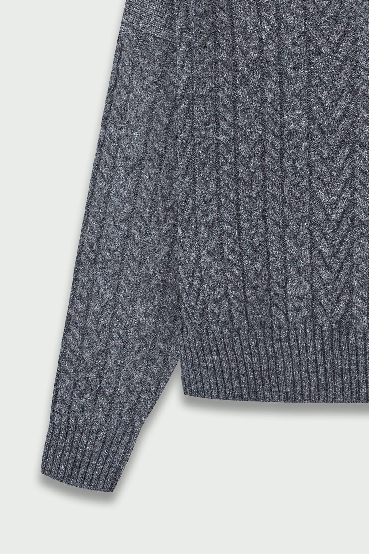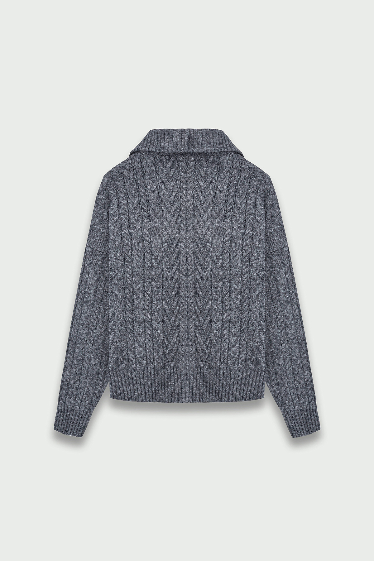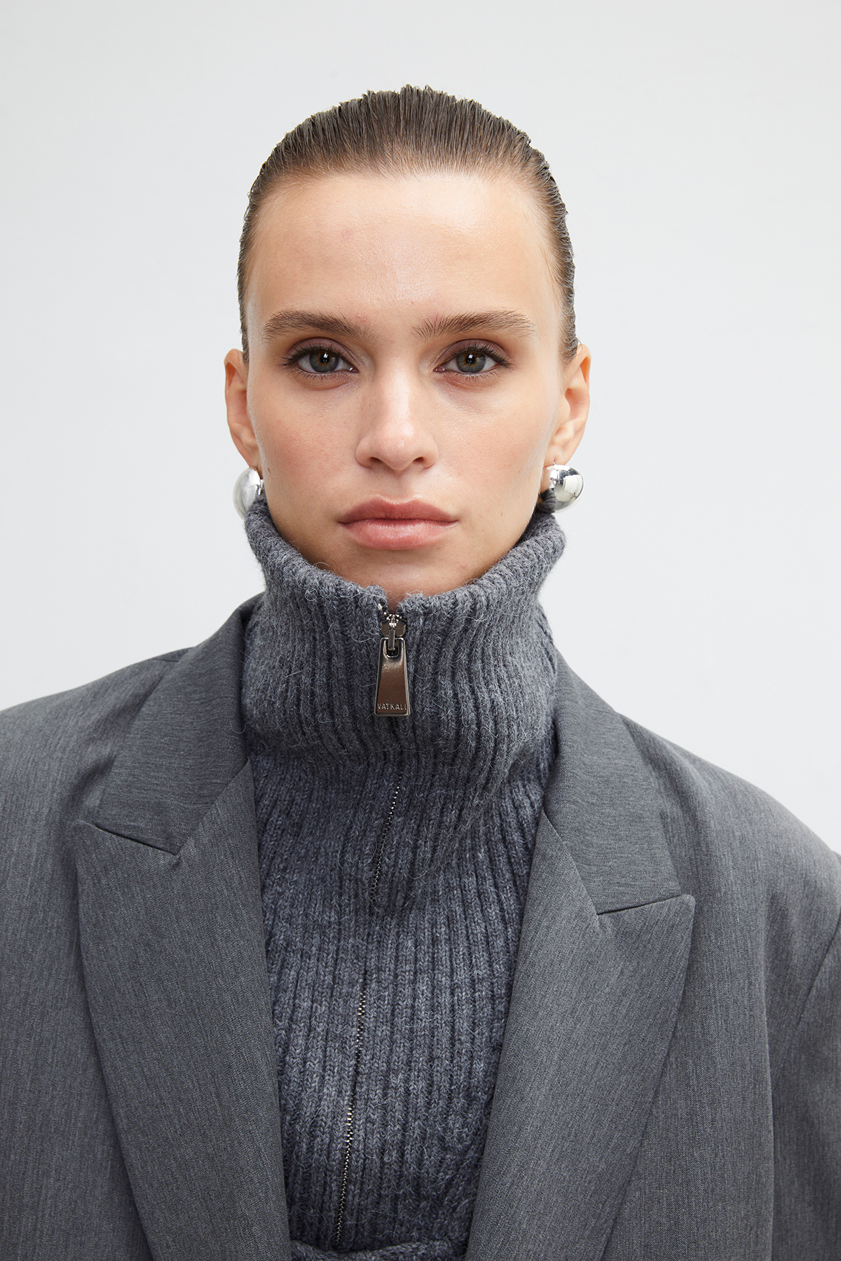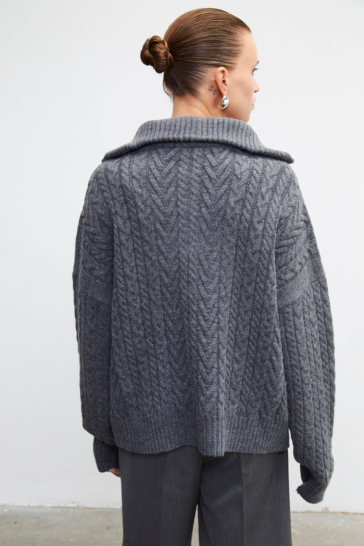 Boğazlı, önü fermuar detaylı, kalın örgü kumaşlı ve örgü desenli, yumuşak dokulu, kadın kazak