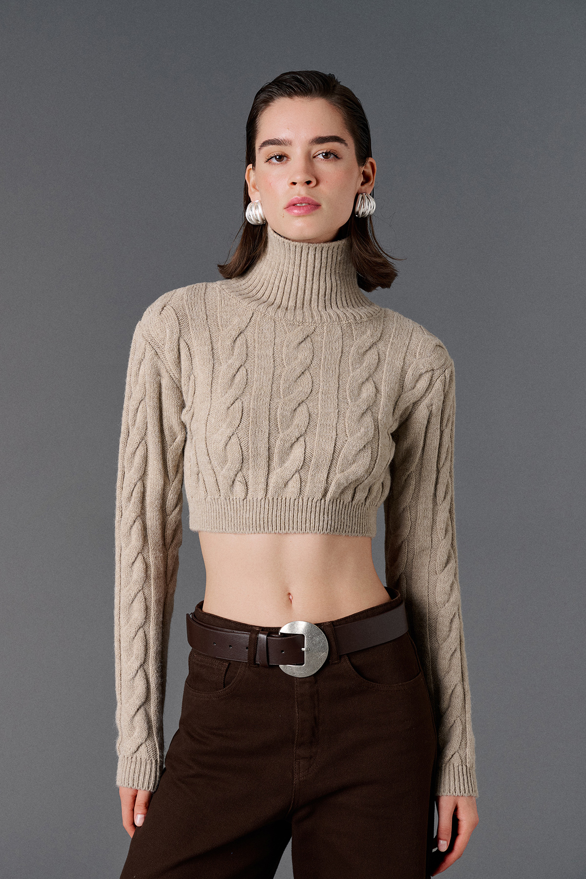 Dik yaka, kalın örgü kumaşlı, tam kalıp, yumuşak dokulu, kadın crop kazak.