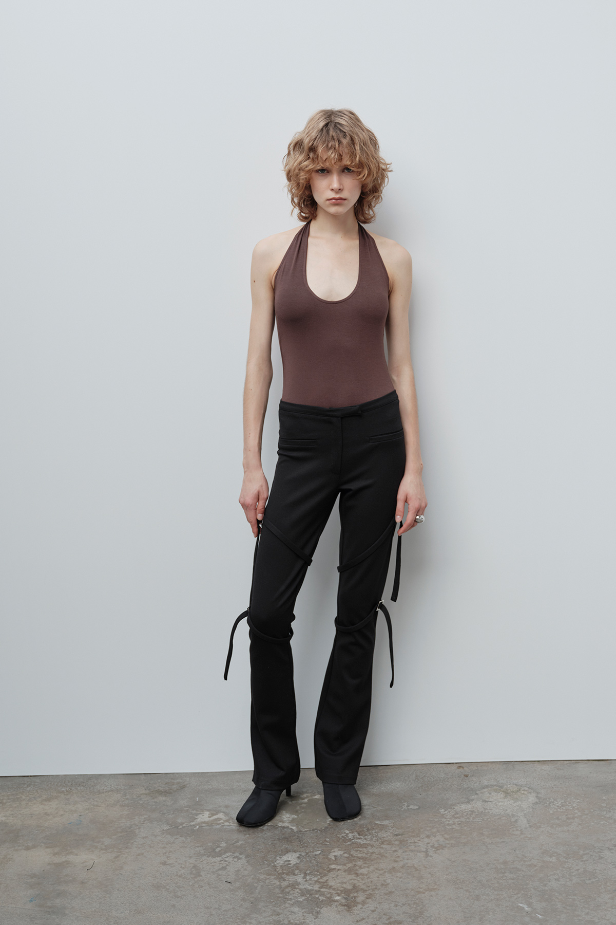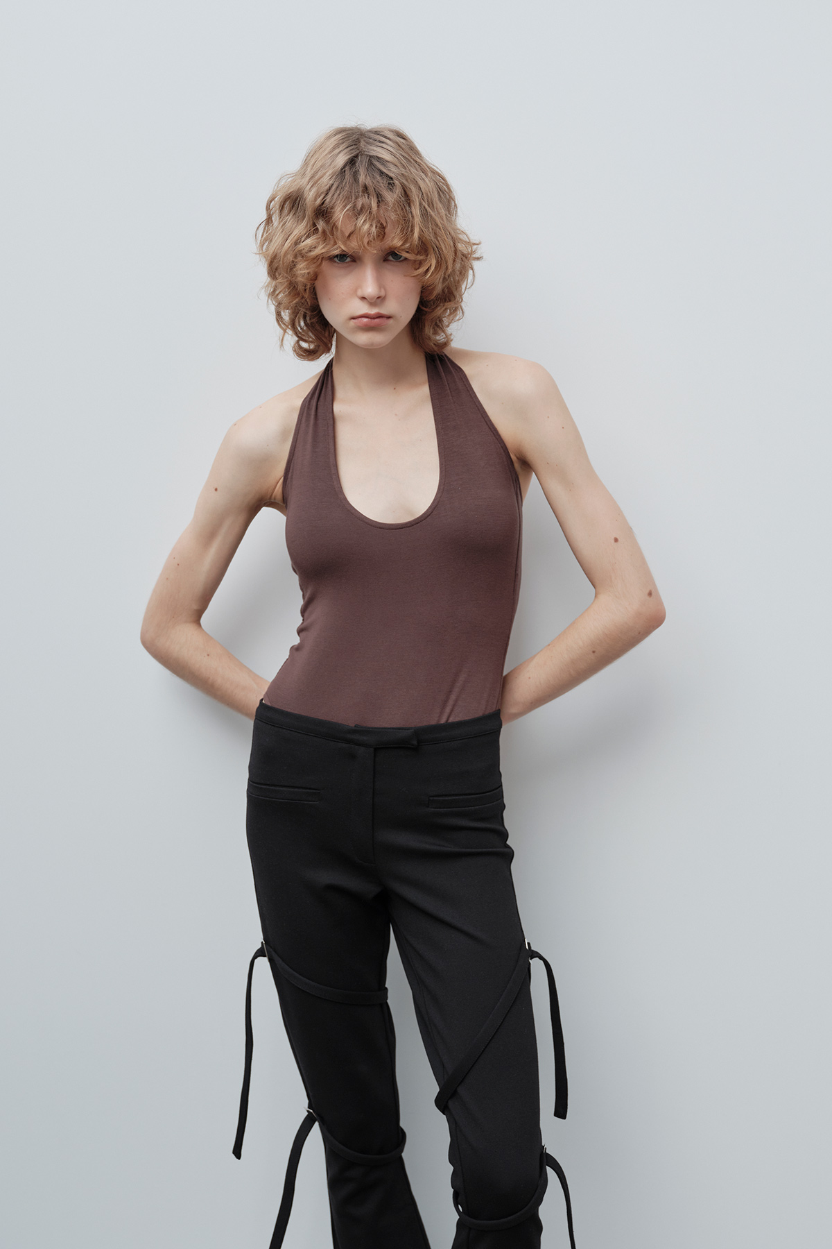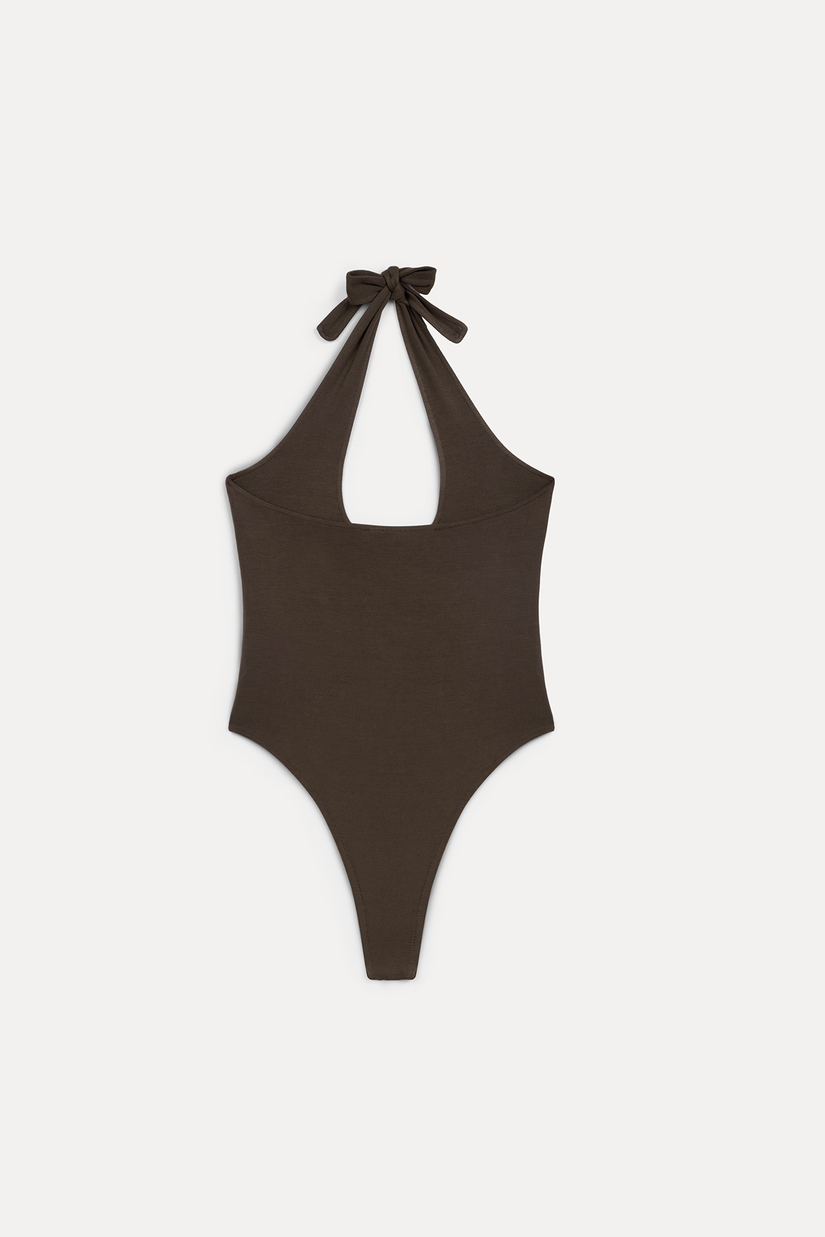 Derin U yaka, boyundan bağlamalı, sırt dekolteli, vücuda oturan kalıp, boyundan bağlamalı tanga kesim bodysuit.