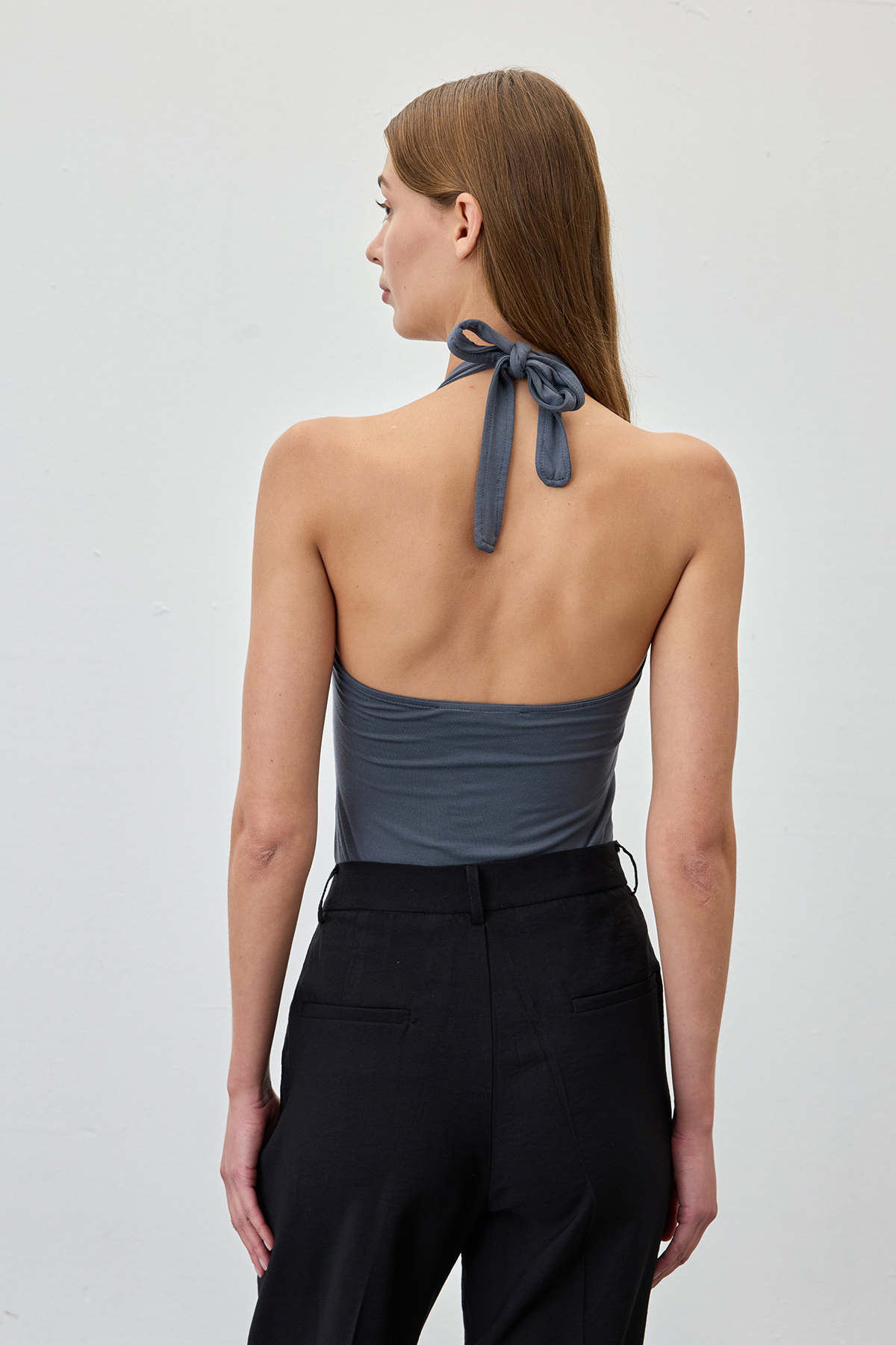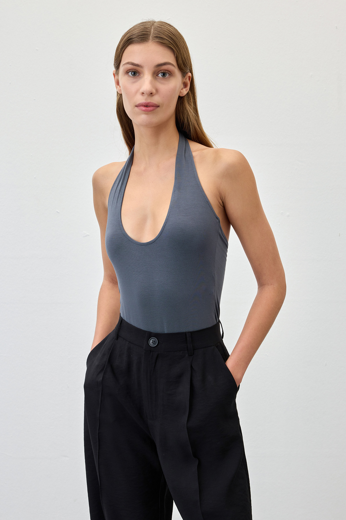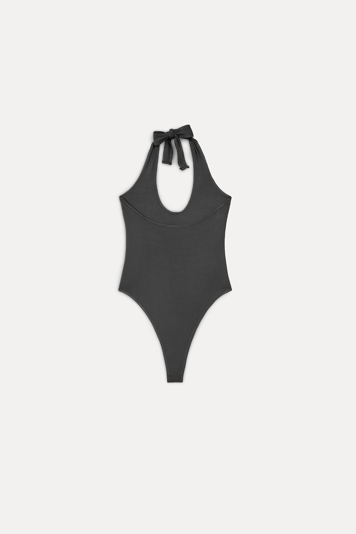 Derin U yaka, boyundan bağlamalı, sırt dekolteli, vücuda oturan kalıp, boyundan bağlamalı tanga kesim bodysuit.
