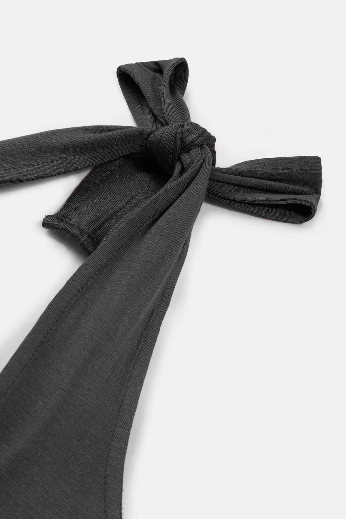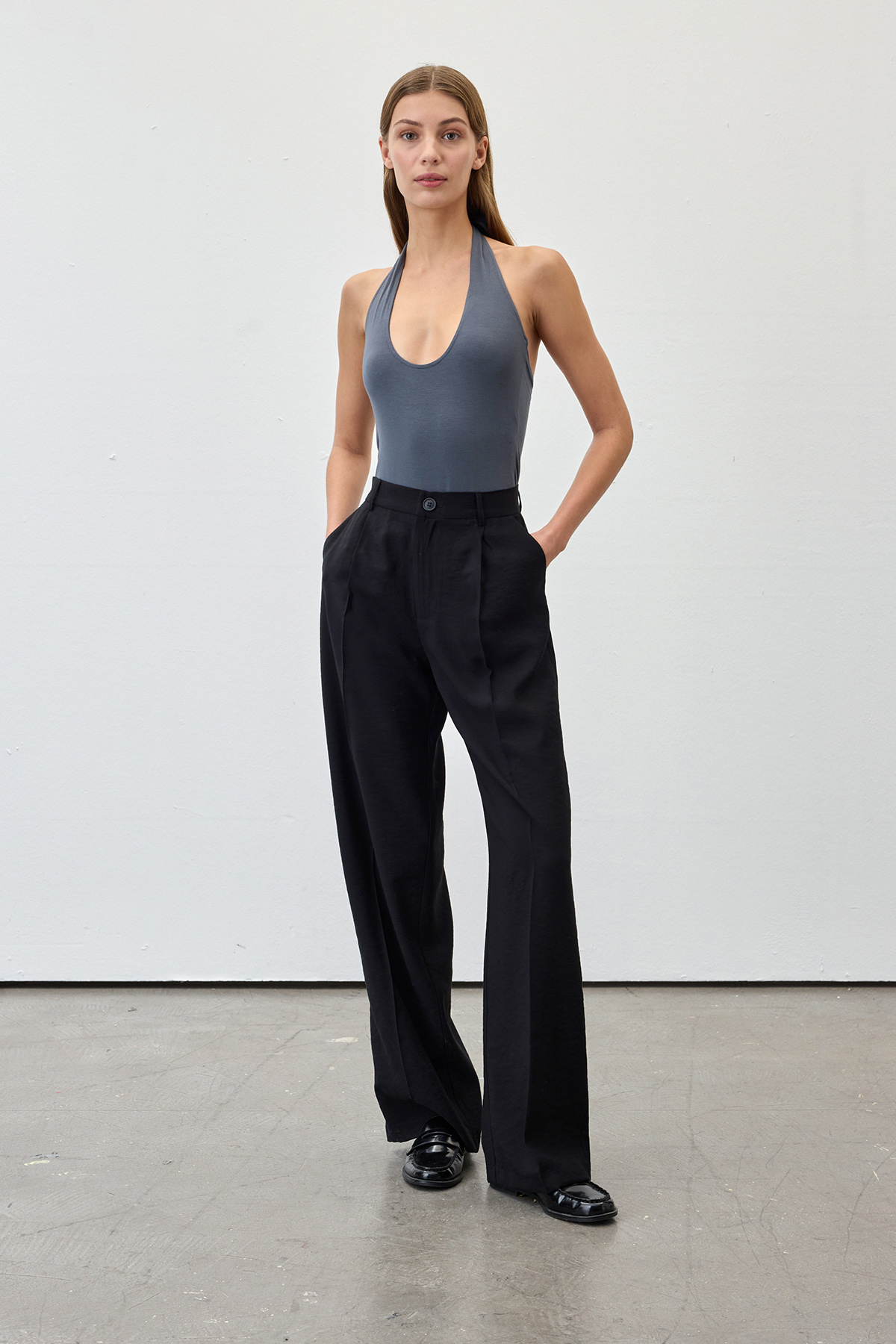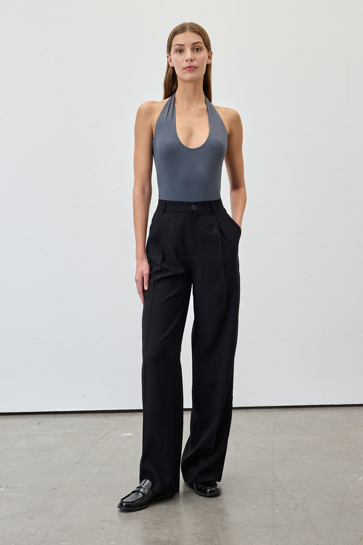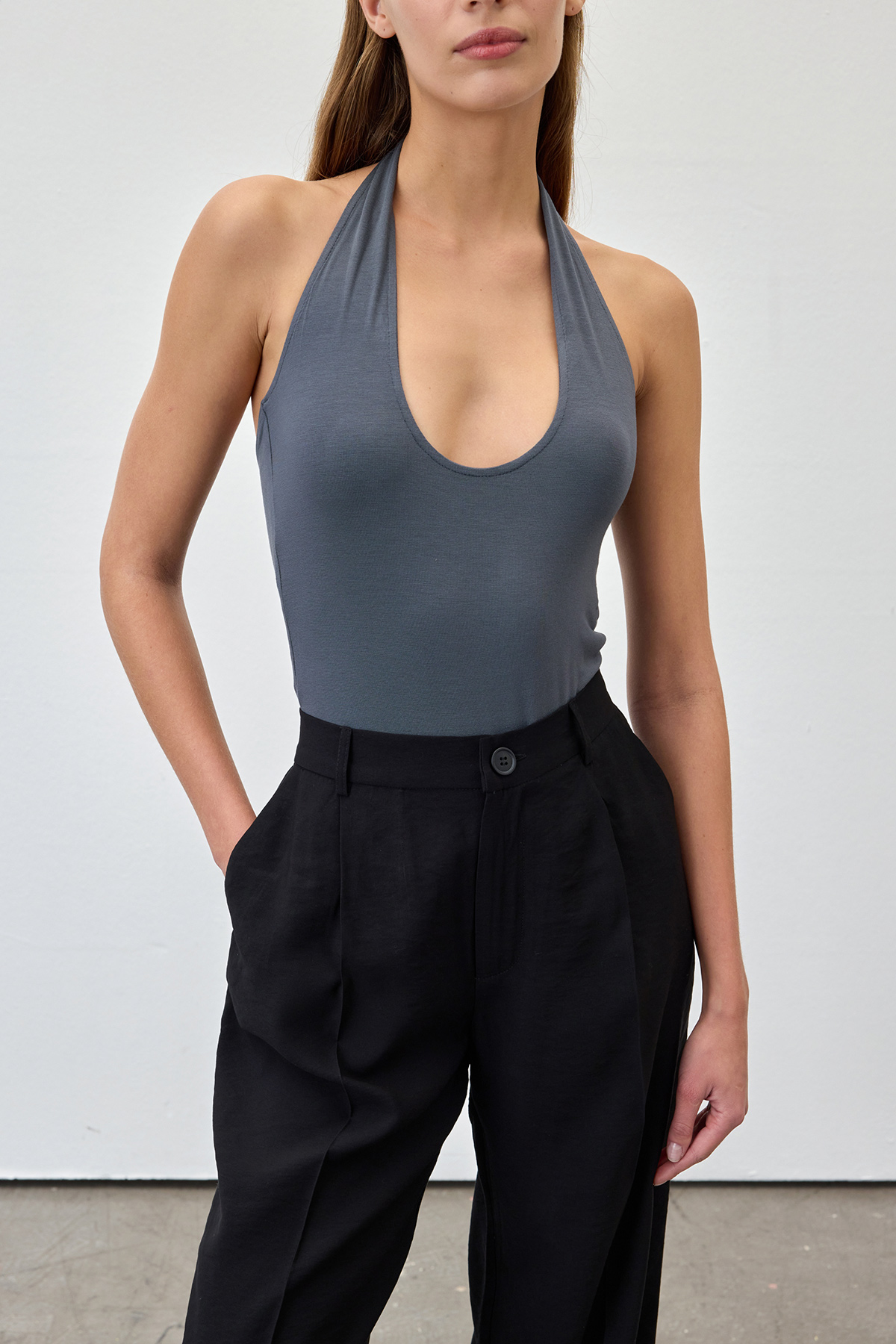 Derin U yaka, boyundan bağlamalı, sırt dekolteli, vücuda oturan kalıp, boyundan bağlamalı tanga kesim bodysuit.