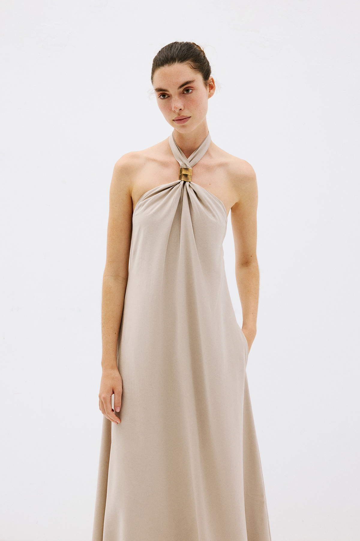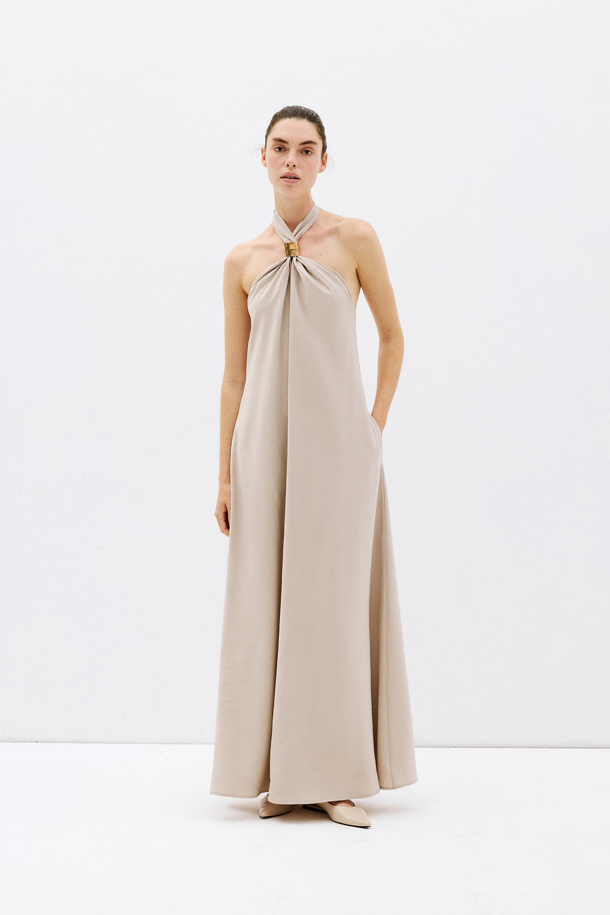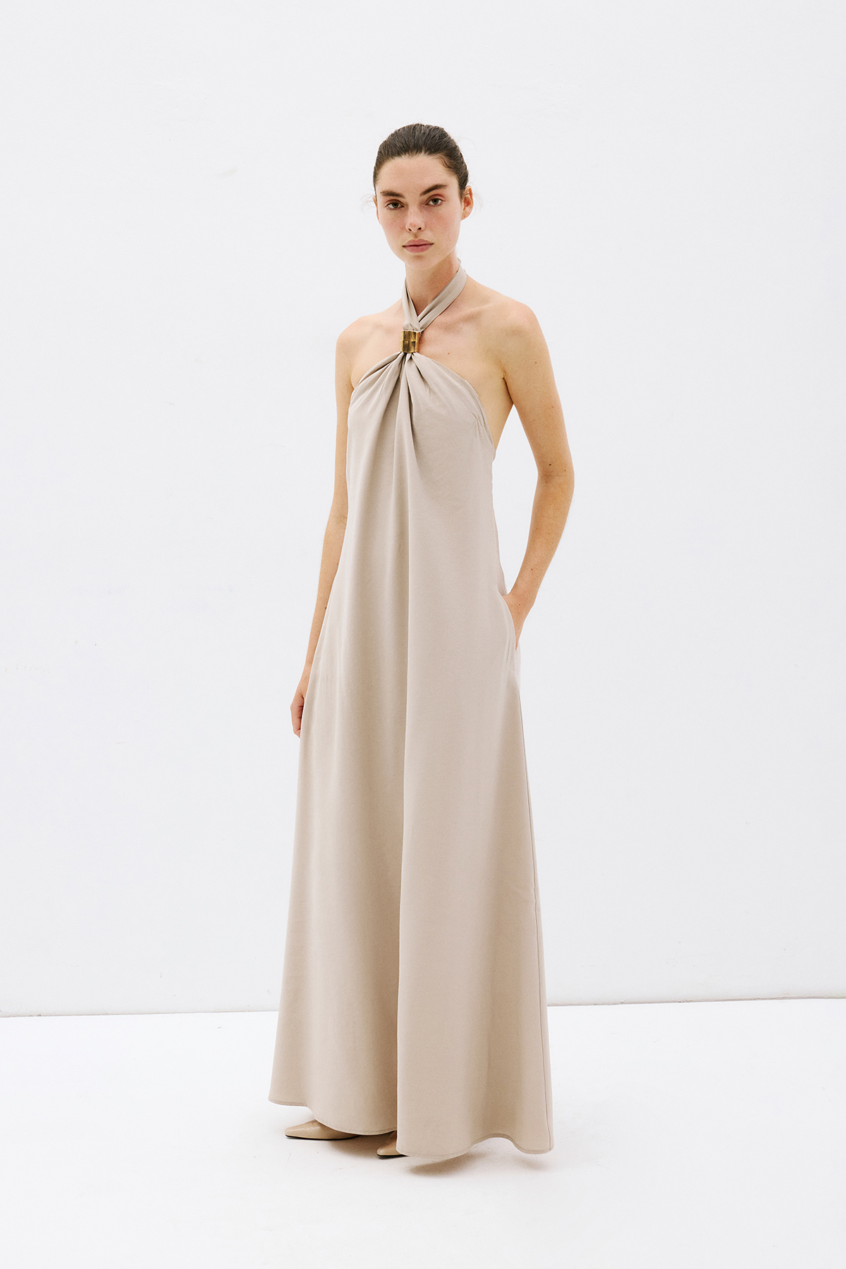 Çapraz yaka, aksesuar detaylı, bol kesim, cepli, sırt dekolteli maxi boy ebise.