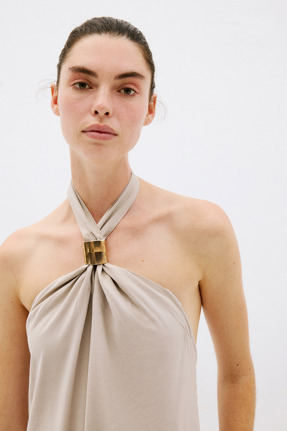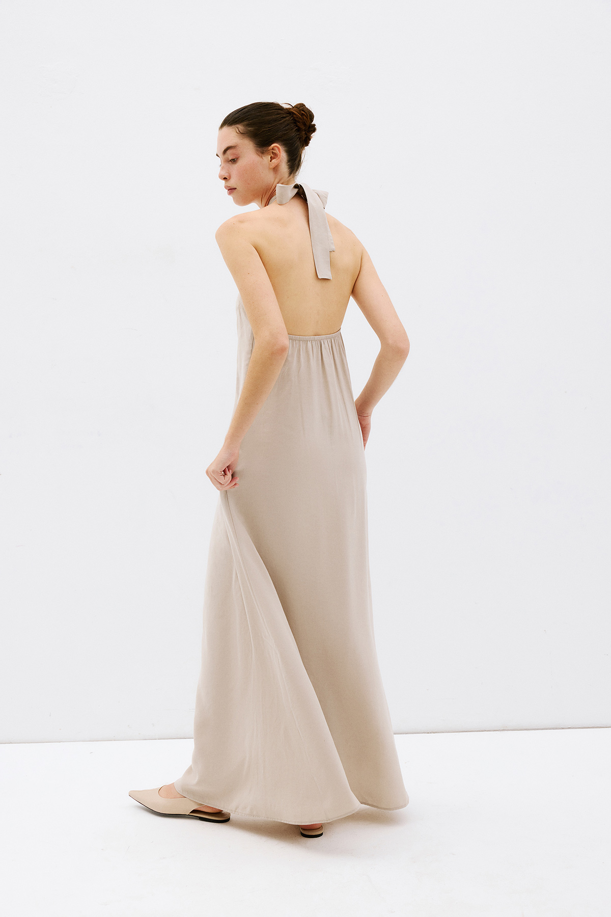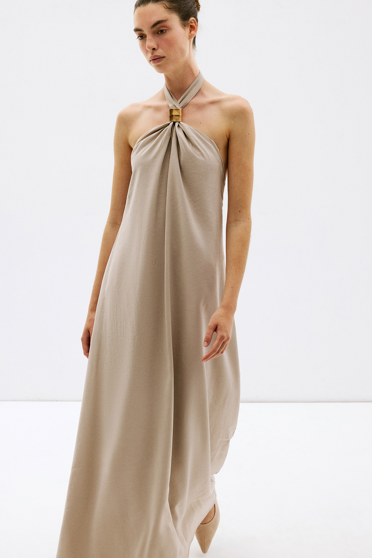 Çapraz yaka, aksesuar detaylı, bol kesim, cepli, sırt dekolteli maxi boy ebise.