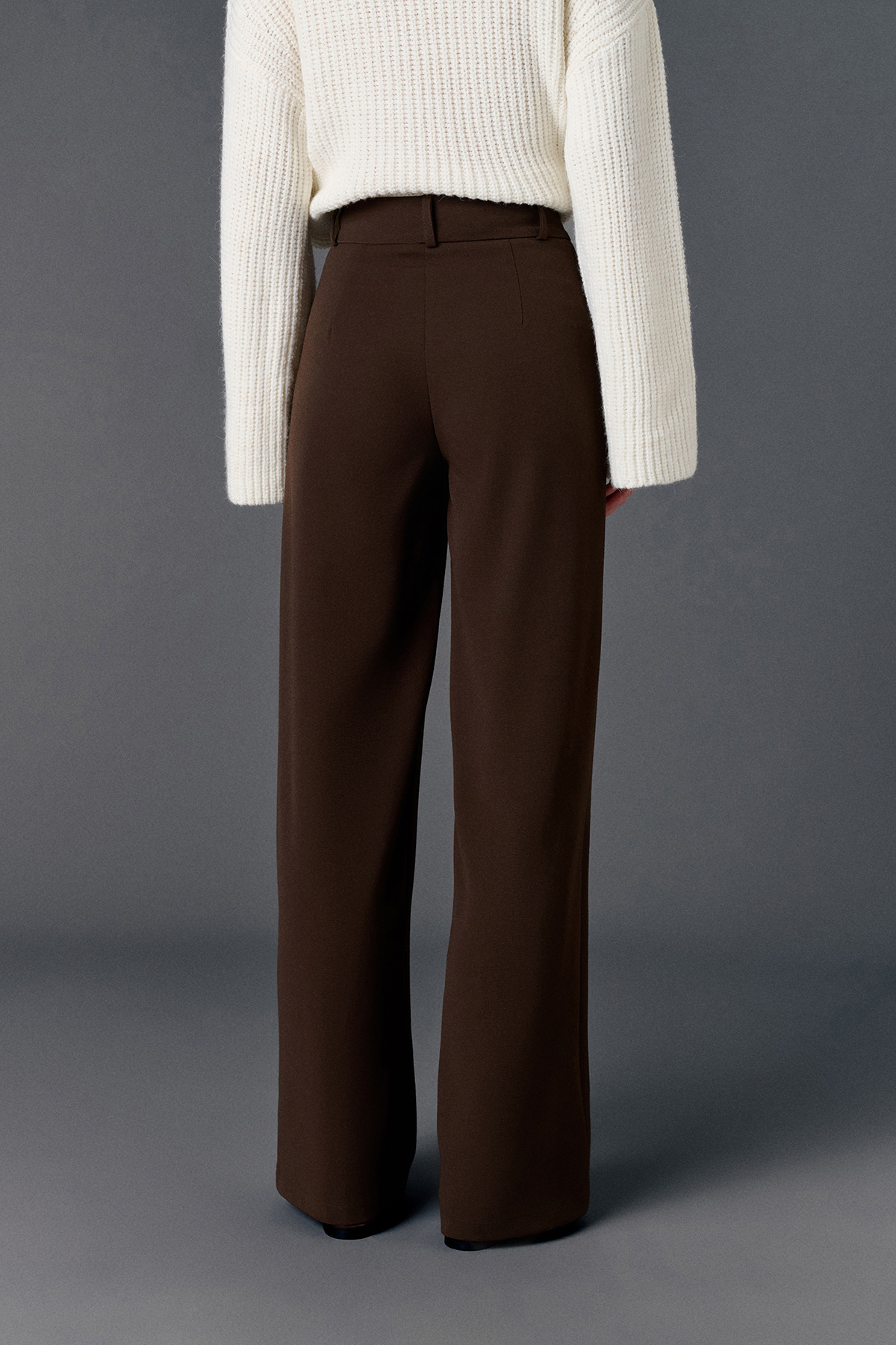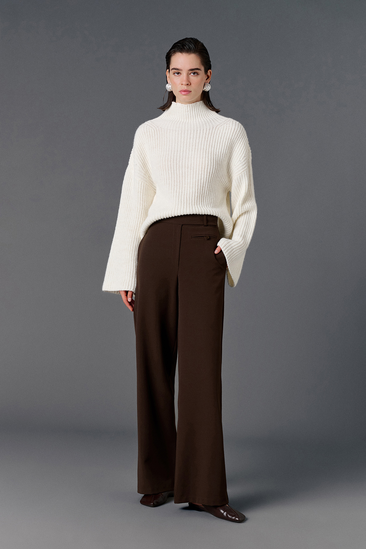Yüksek bel, önden düğme ve fermuar kapamalı, yanlardan çift cepli, sol önünde aksesuar cep detaylı, casual kumaş pantolon.