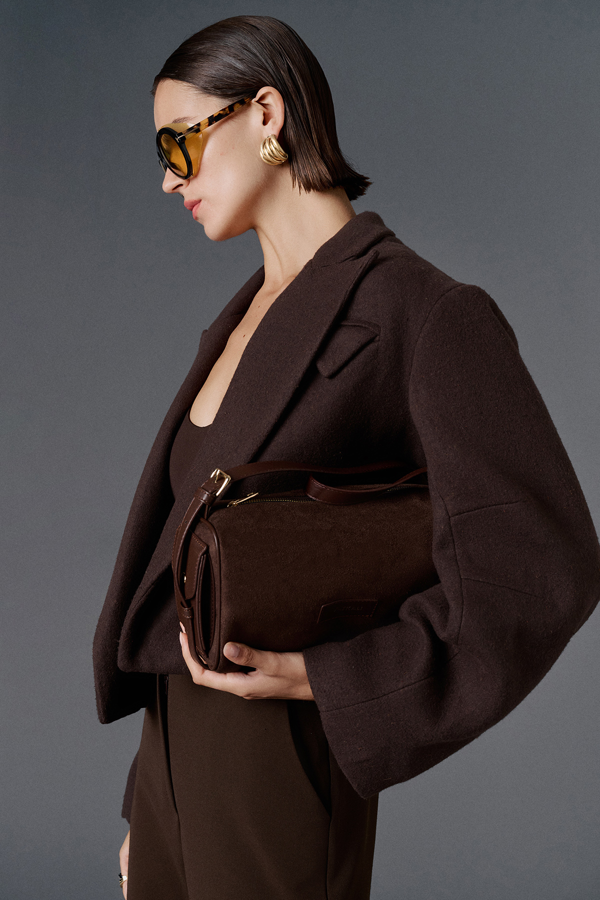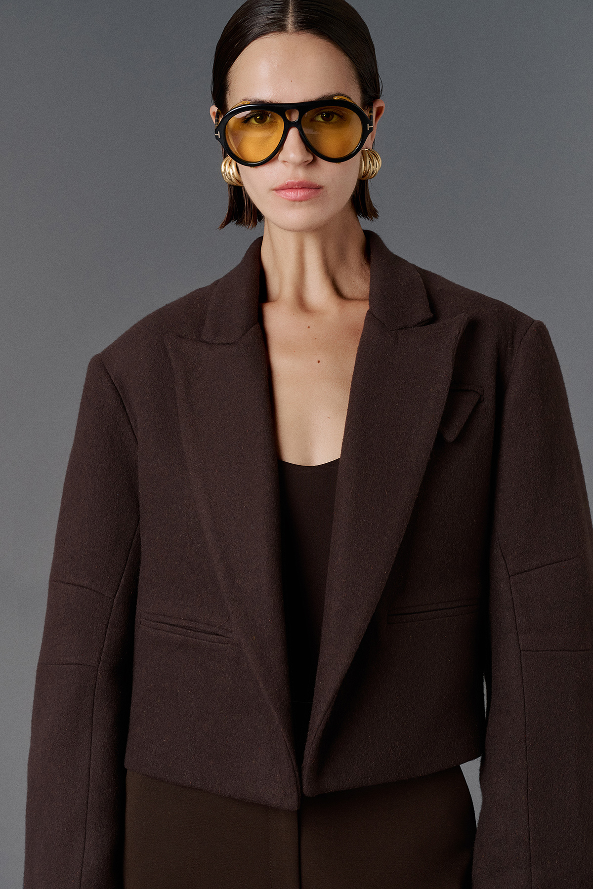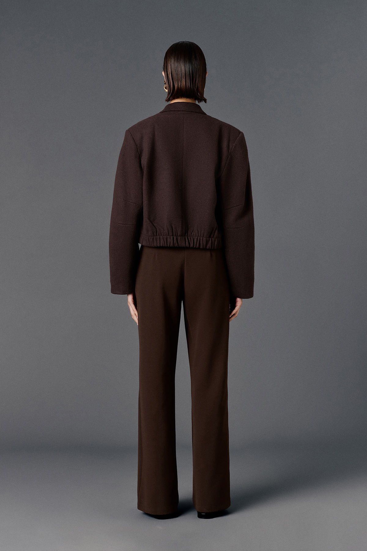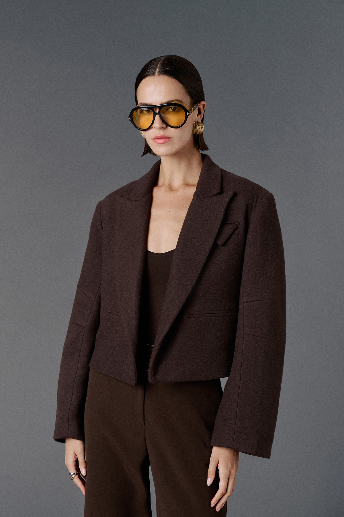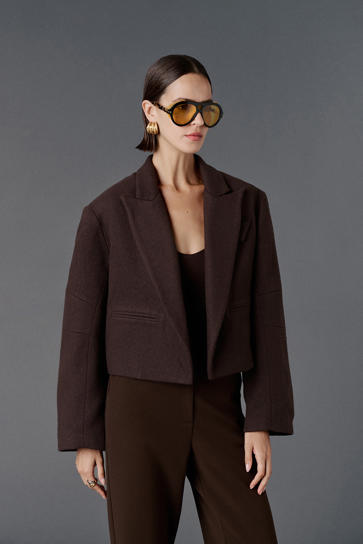Vatkalı, kruvaze yaka, astarlı, cep aksesuar görünümlü (cepler aktif değildir.), geniş kol detaylı, düğmesiz, arkası lastikli, kaşe crop ceket.