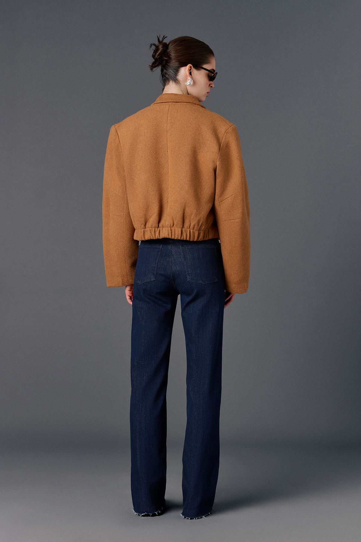 Vatkalı, kruvaze yaka, astarlı, cep aksesuar görünümlü (cepler aktif değildir.), geniş kol detaylı, düğmesiz, arkası lastikli, kaşe crop ceket.