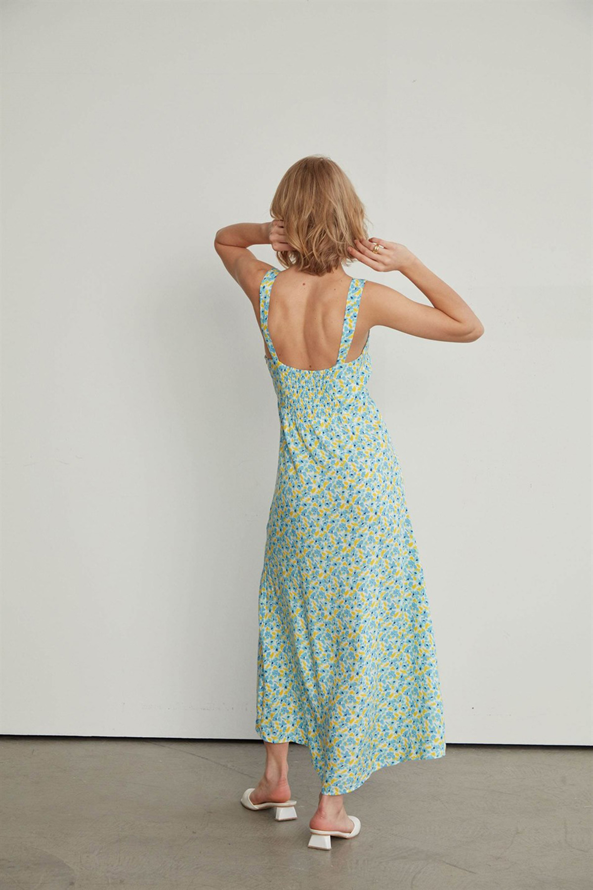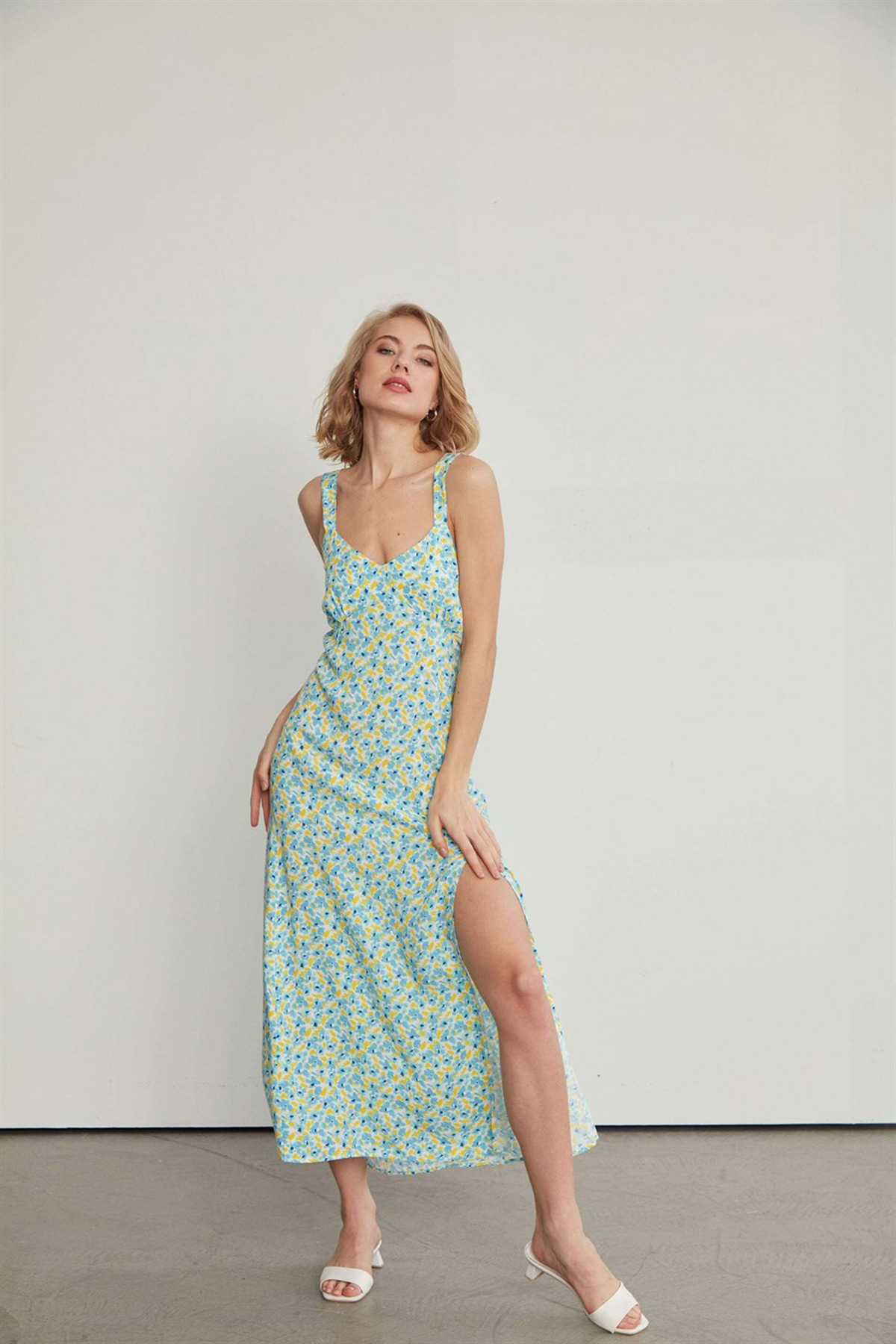 Çiçek desenli yırtmaçlı uzun elbise mavi