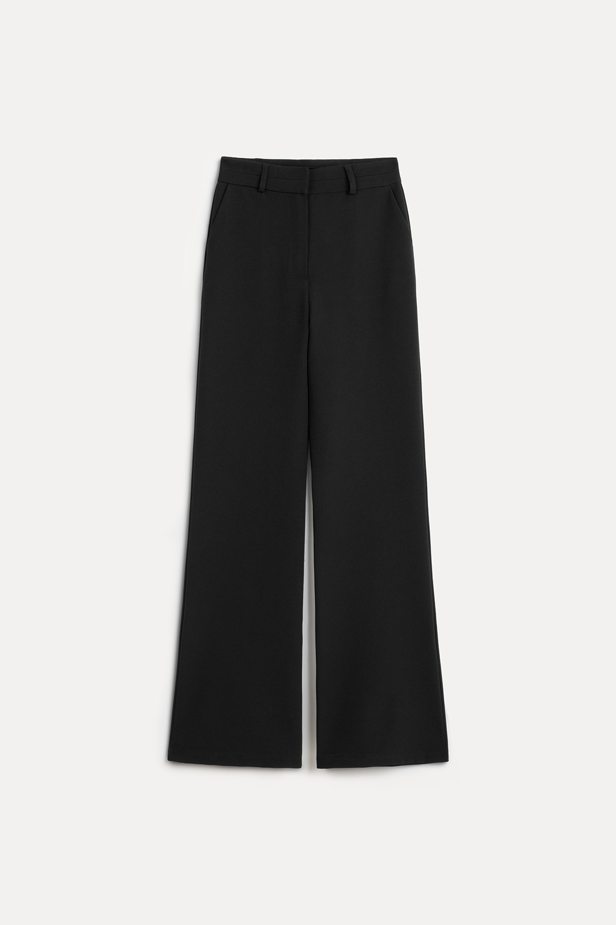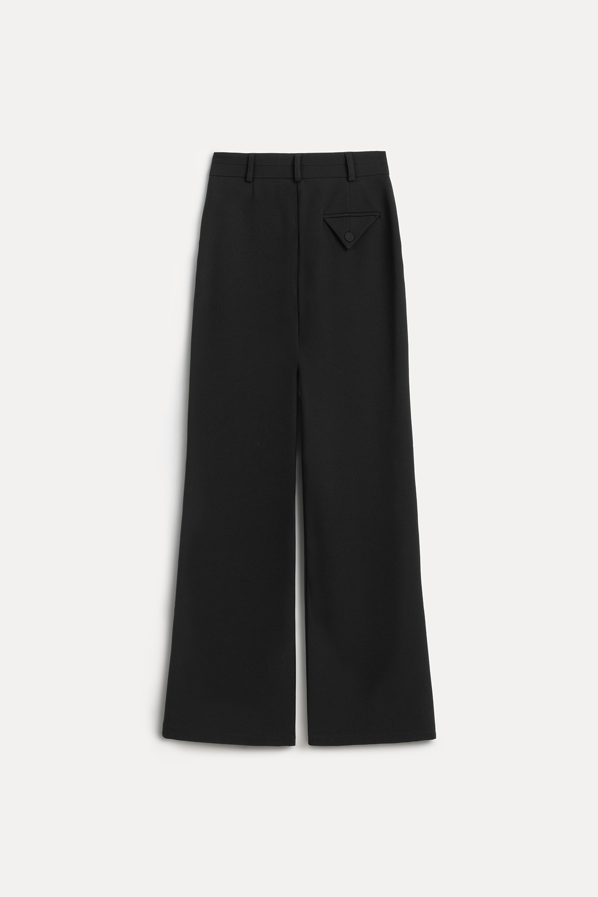 Yüksek bel, çift kemer detaylı, yanlardan 2 cepli, önden düğme, fermuar ve klips kapamalı, arkası aksesuar cep görünümlü palazzo pantolon.