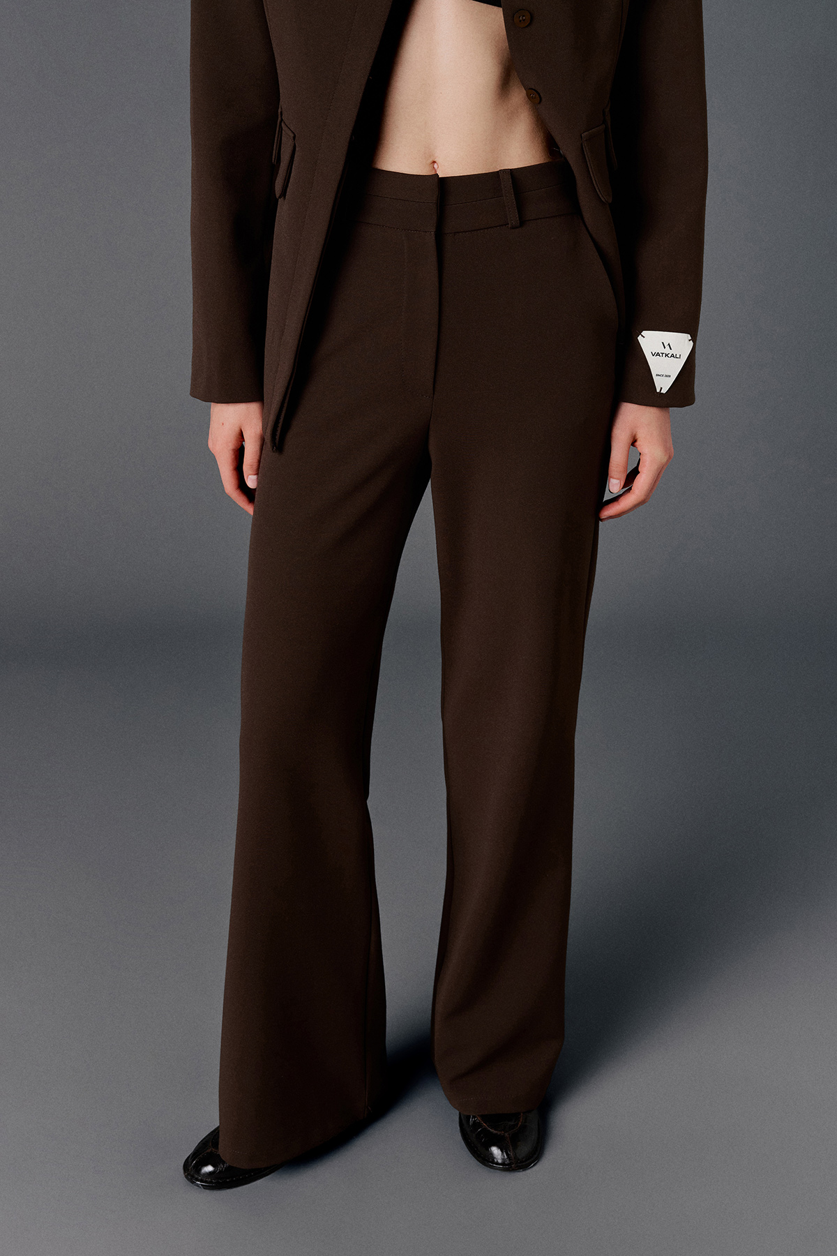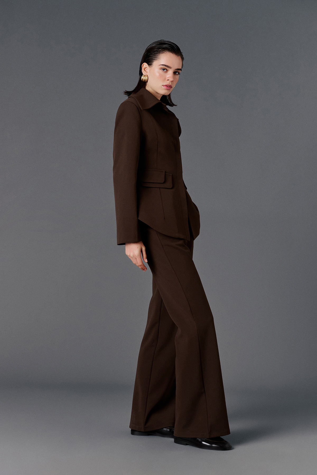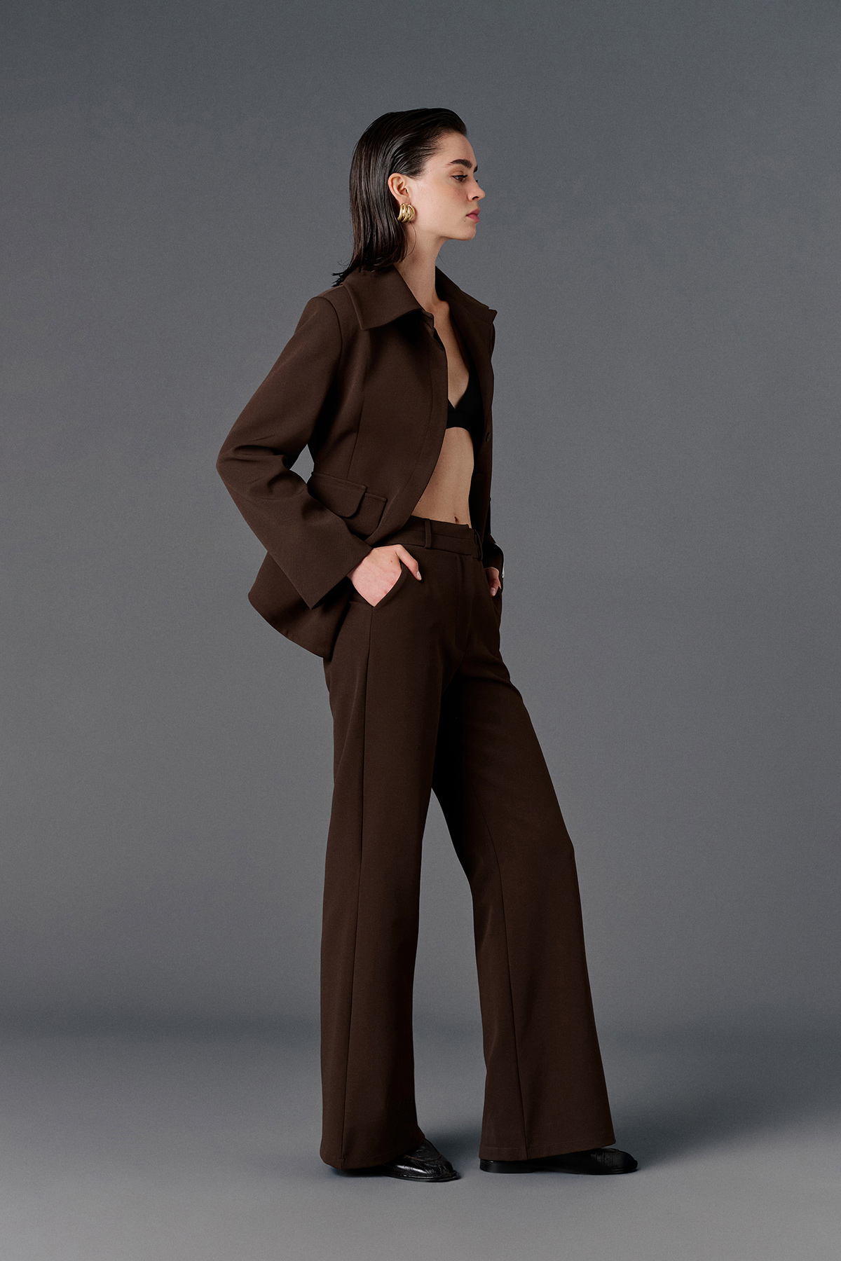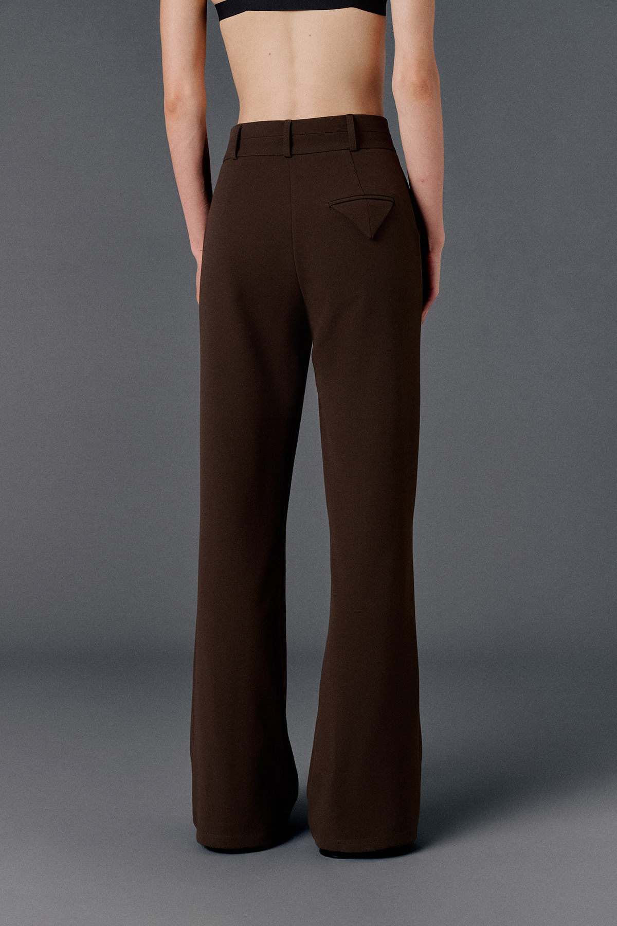 Yüksek bel, çift kemer detaylı, yanlardan 2 cepli, önden düğme, fermuar ve klips kapamalı, arkası aksesuar cep görünümlü palazzo pantolon.