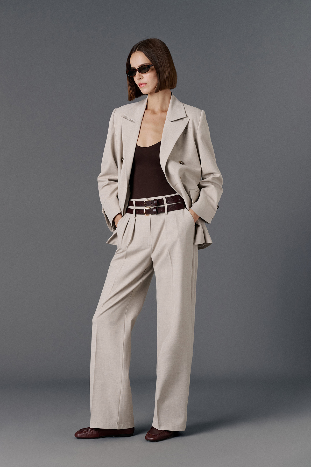 Yüksek bel, çift kemer detaylı, astarsız, cepli, palazzo pantolon.