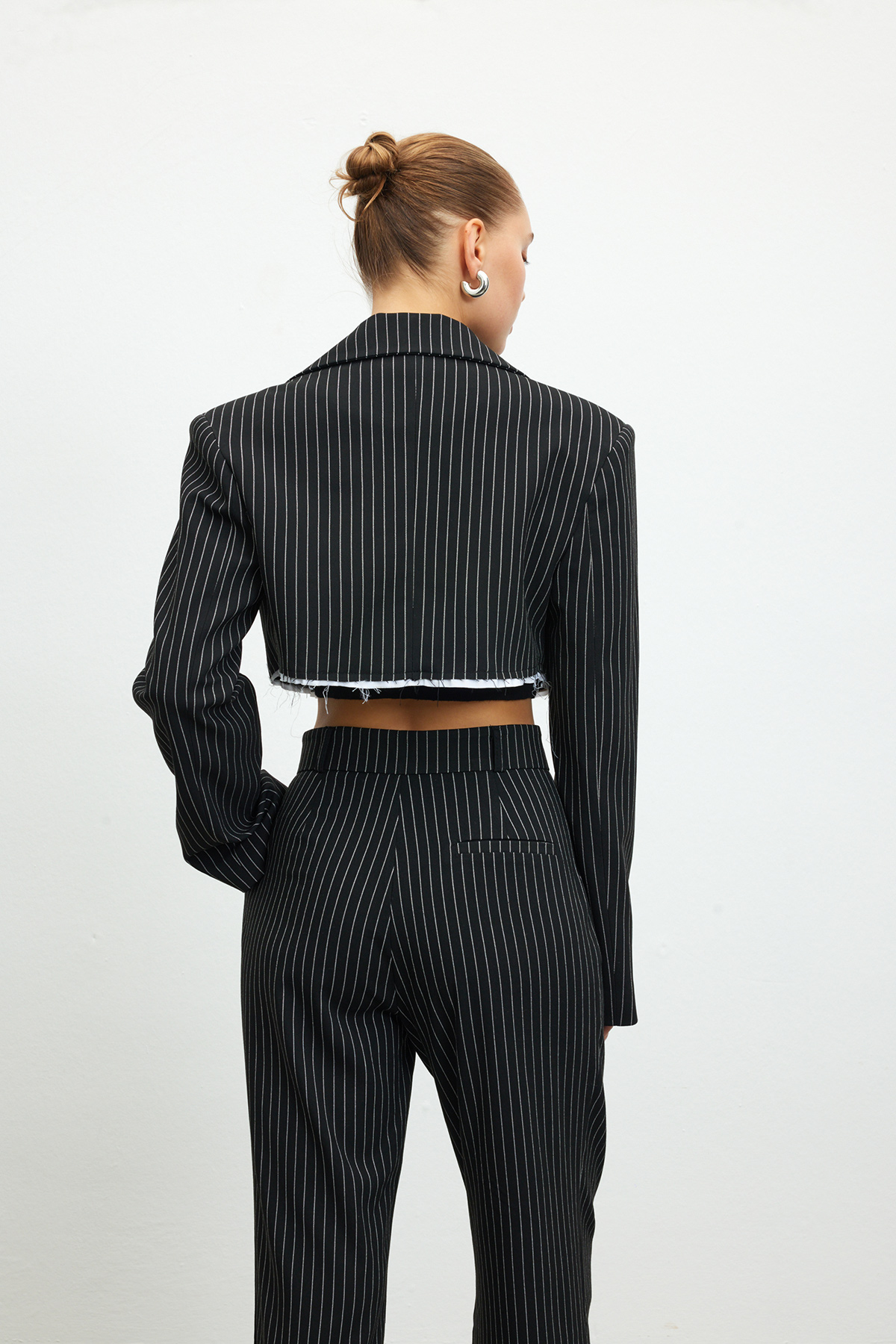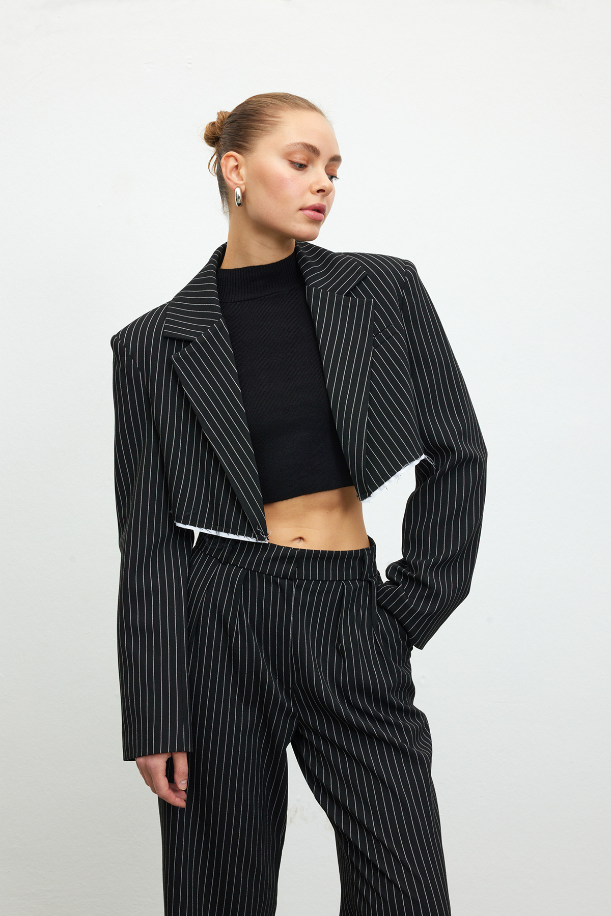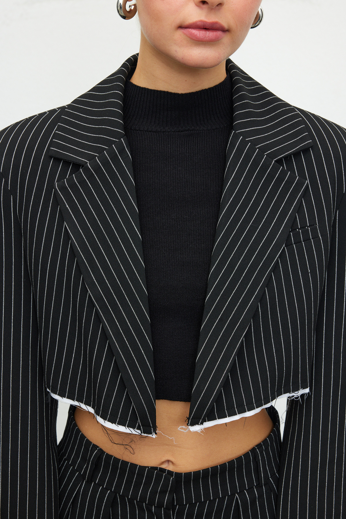 Kruvaze yaka, tam kalıp, sahte cep detaylı, crop blazer ceket