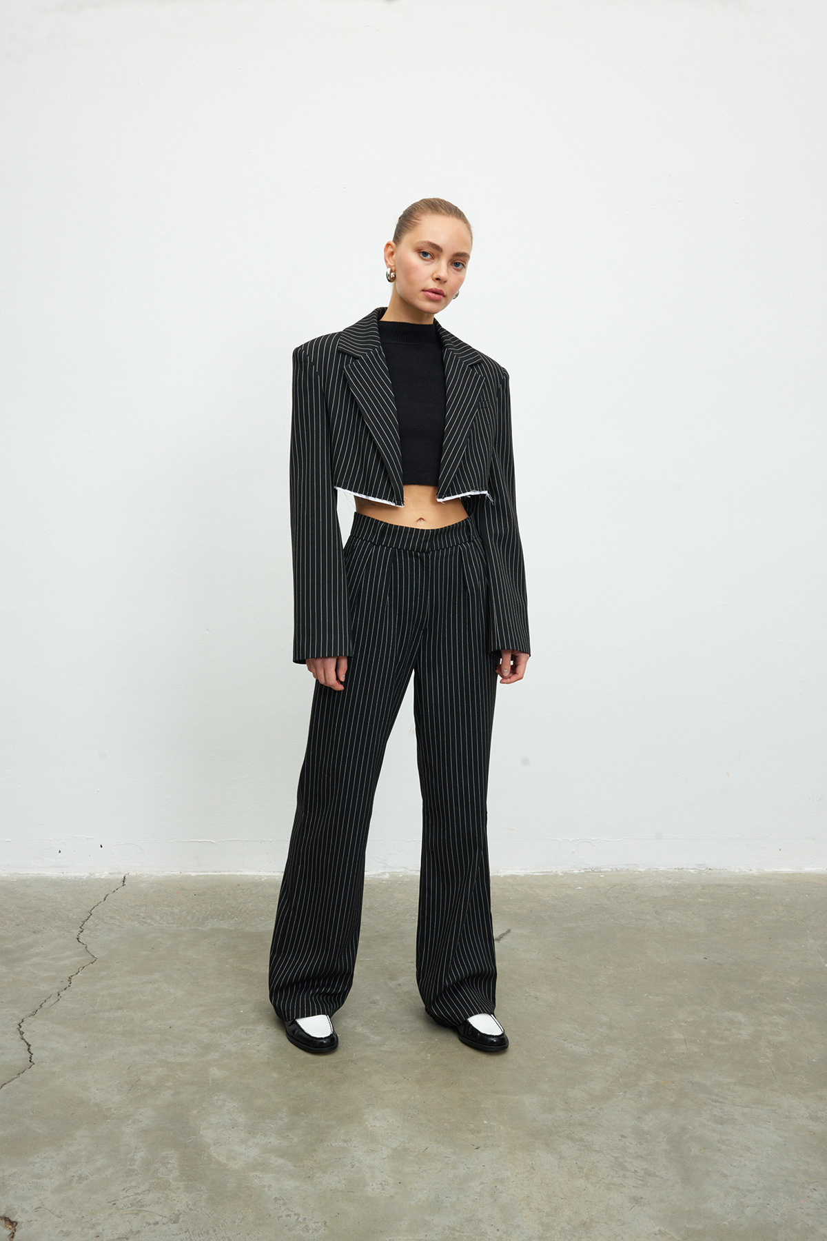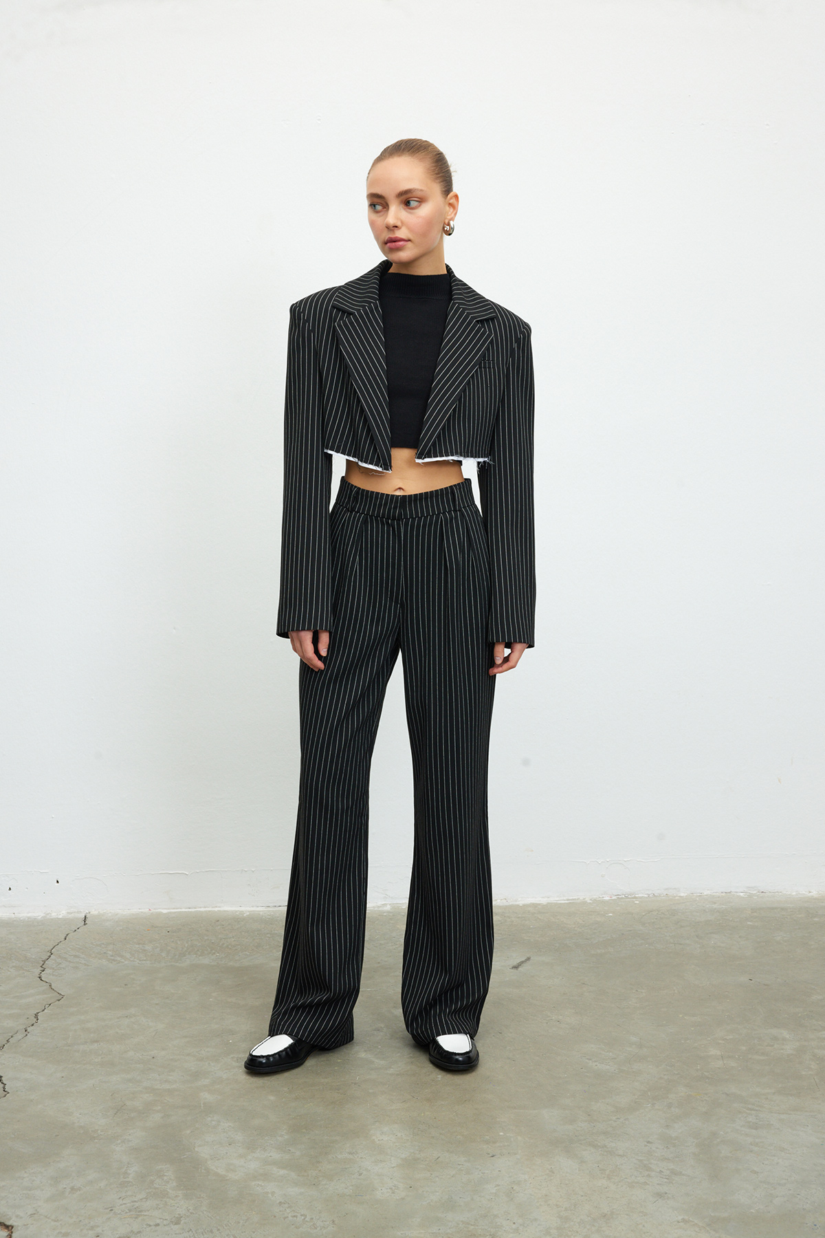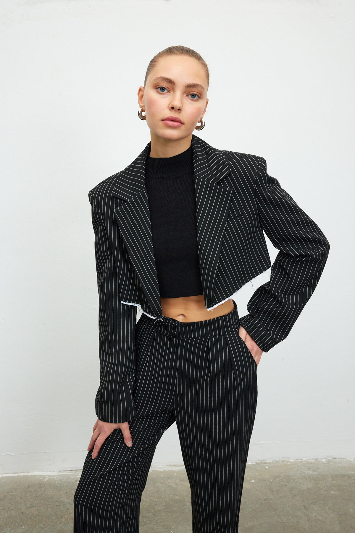 Kruvaze yaka, tam kalıp, sahte cep detaylı, crop blazer ceket