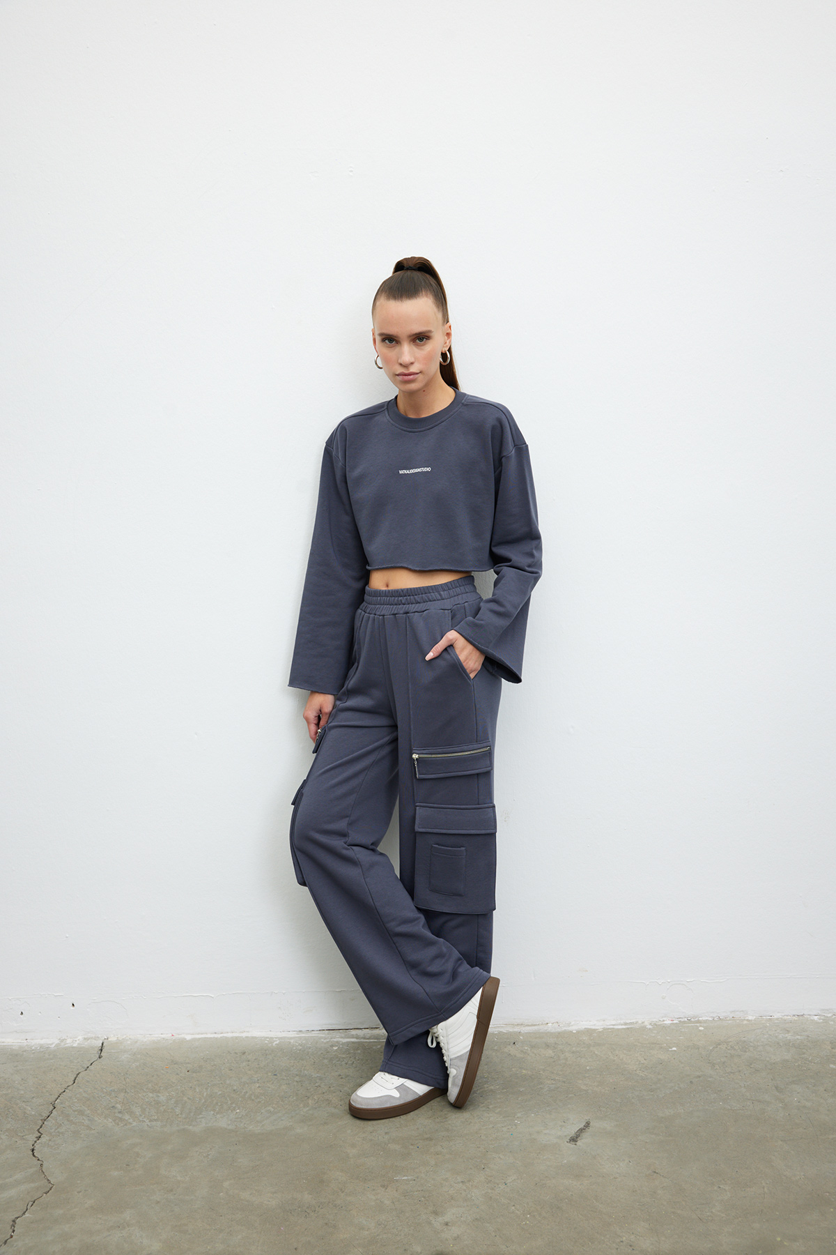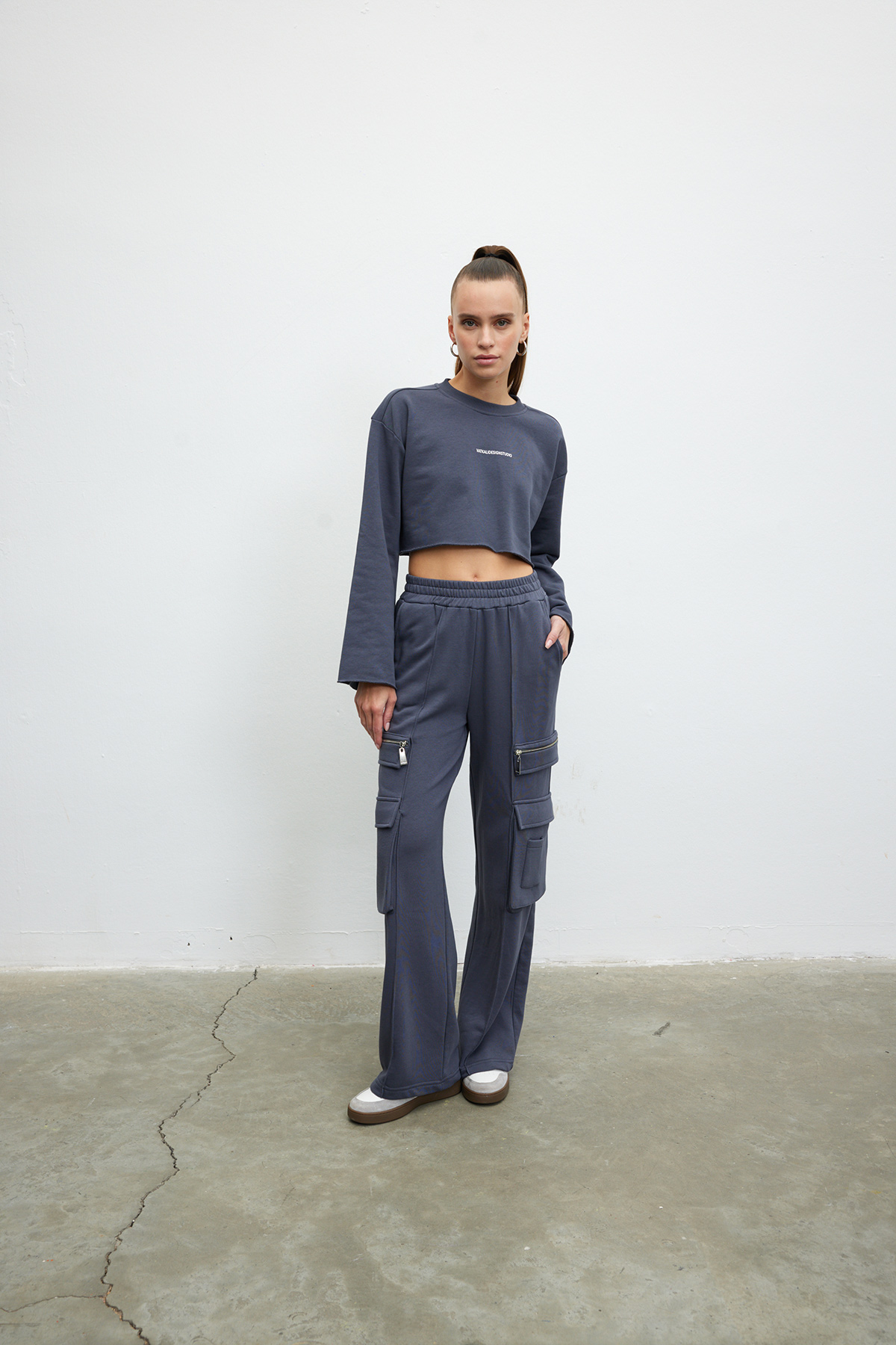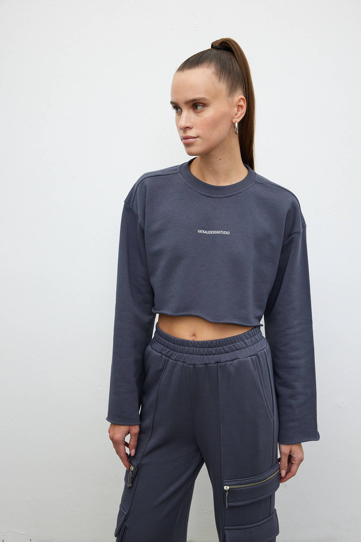 Pamuklu, bisiklet yaka ve uzun kollu, slogan baskılı crop sweatshirt.