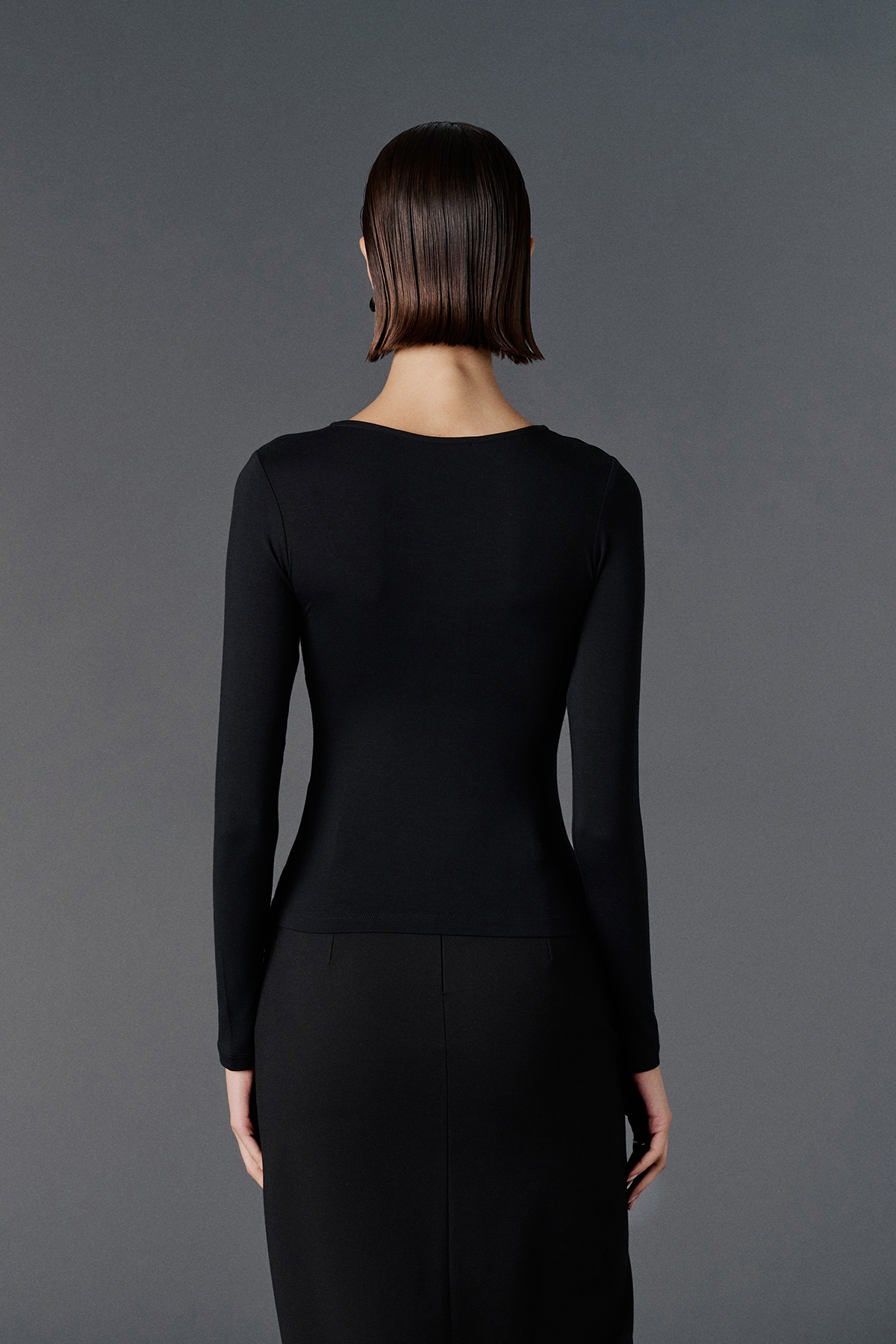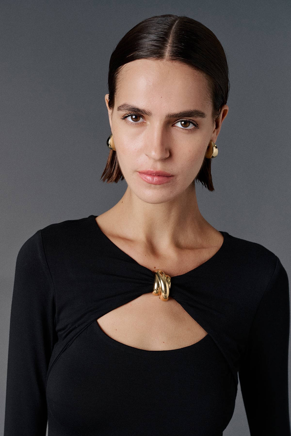 Cut out detaylı, metal aksesuarlı, uzun kollu, fitted bluz.