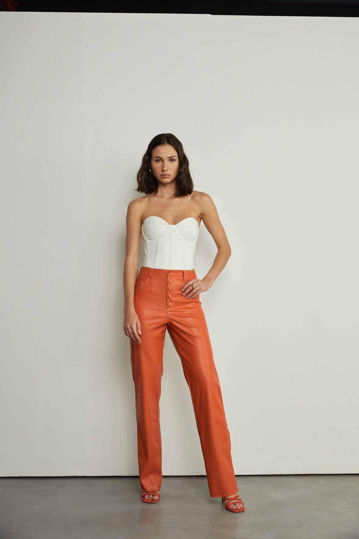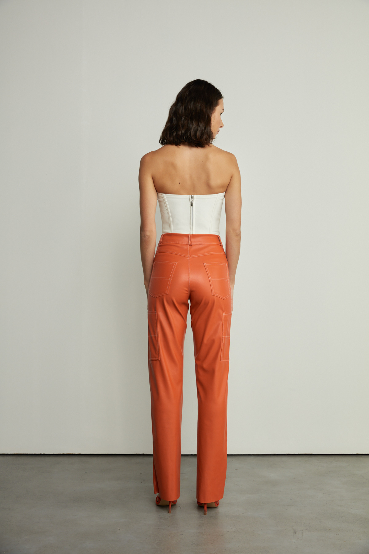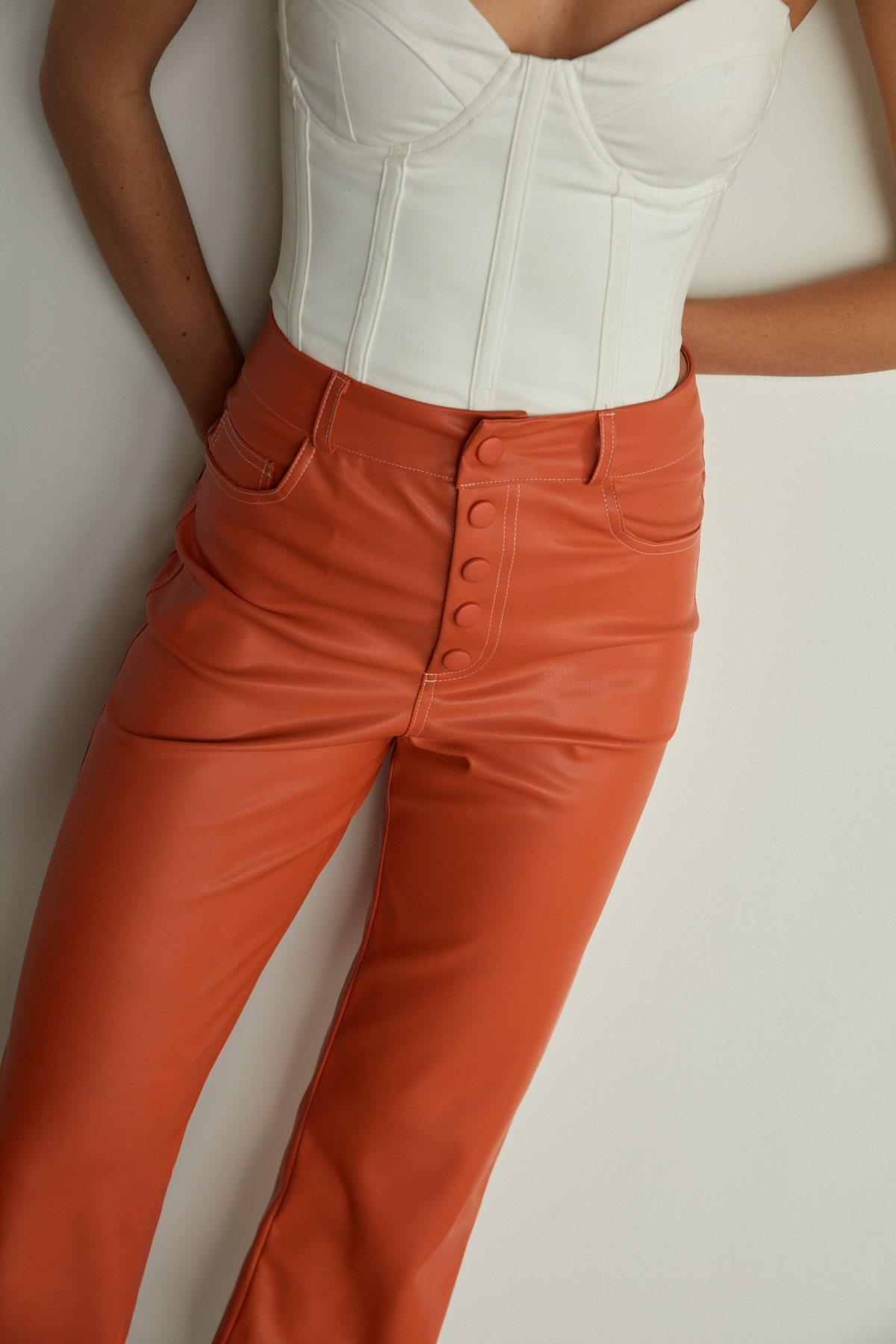 İki ön cepli ve iki arka cepli, Tam kalıp, Yüksek bel, Fermuarlı ve 5 düğmeli, Suni deri pantolon. İç kısmı şardonludur.