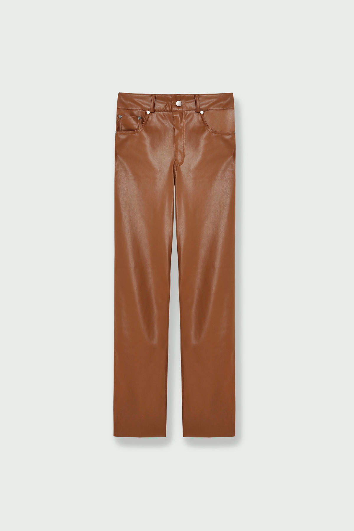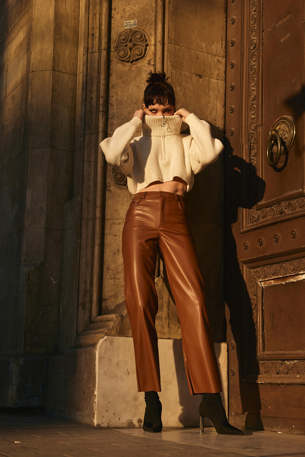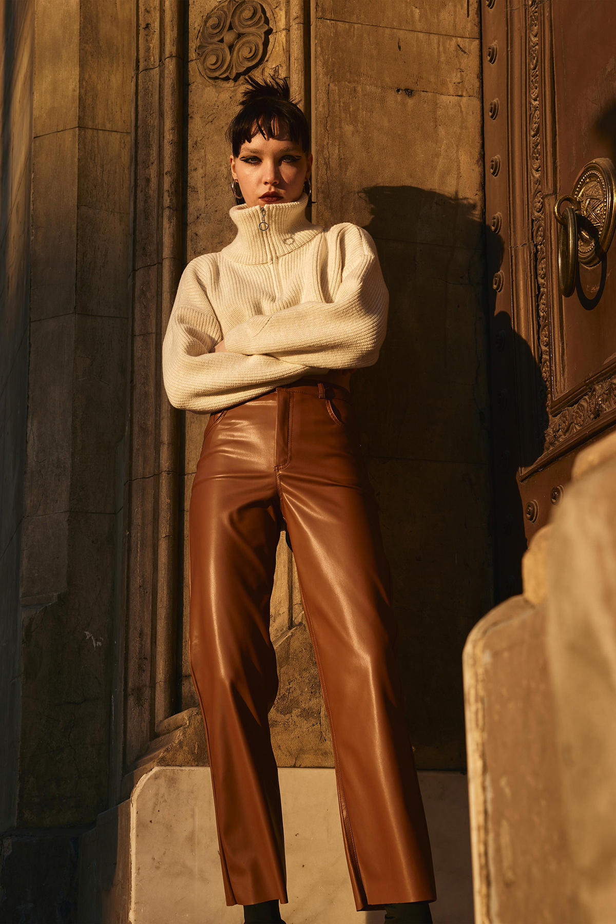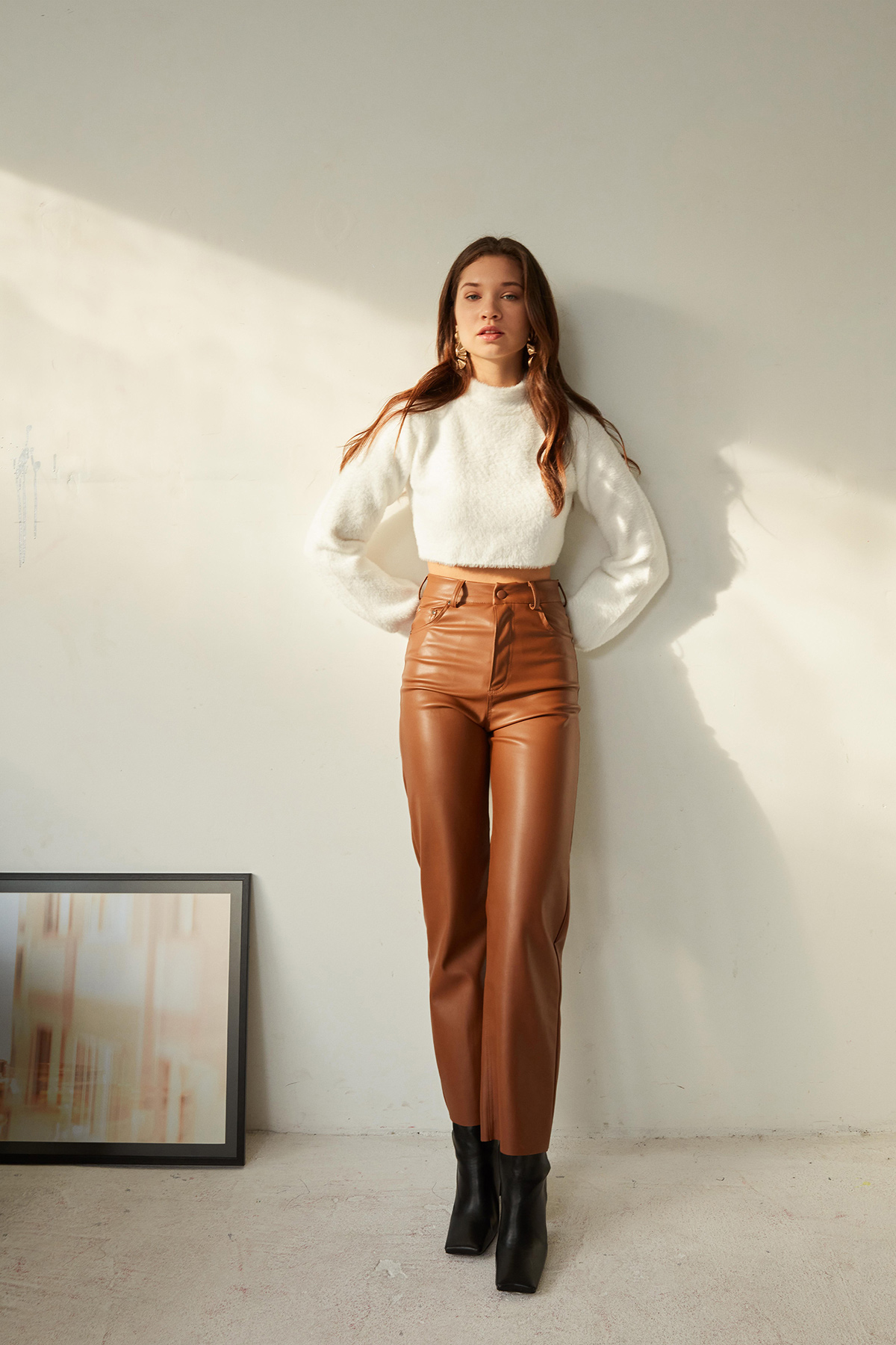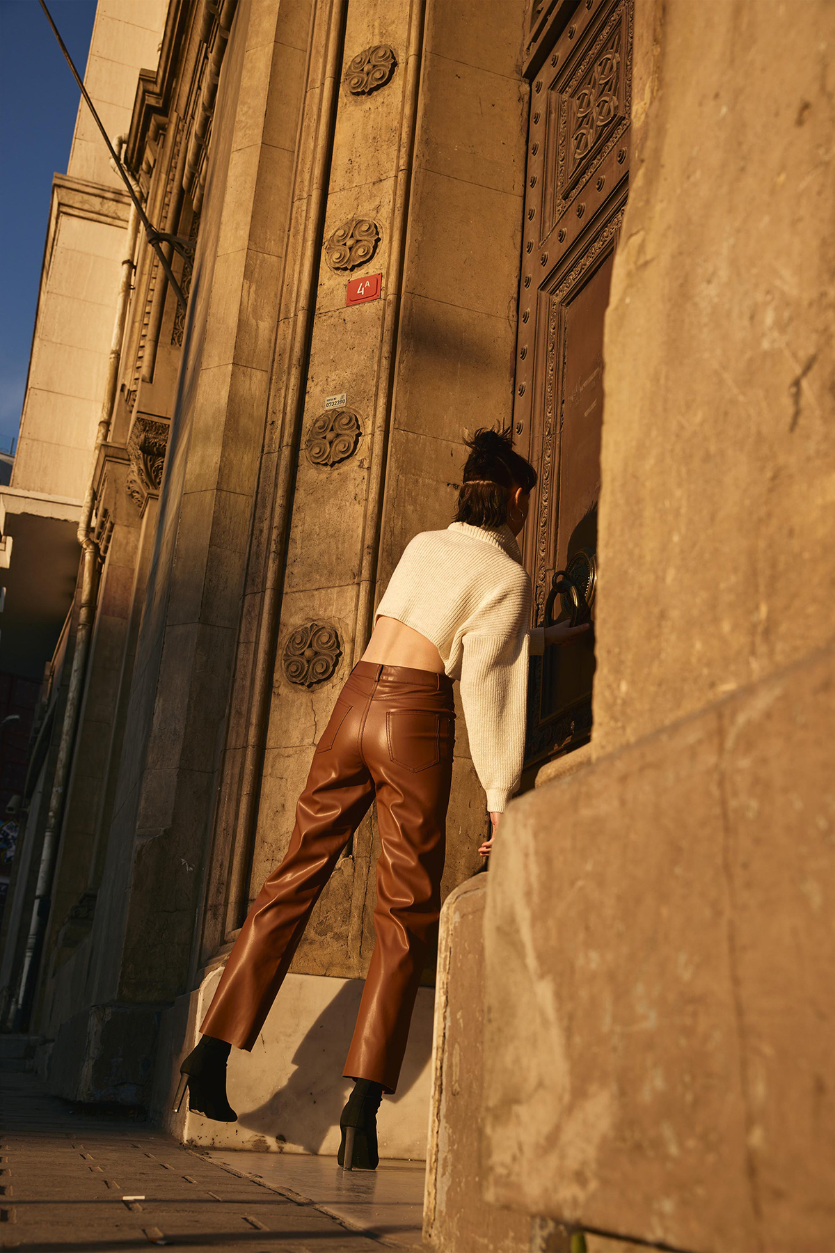 Yüksek bel, üç ön cepli, tam kalıp , önü fermuarlı, paçası lazer kesim bol paça suni deri pantolon. İç kısmı süettir.