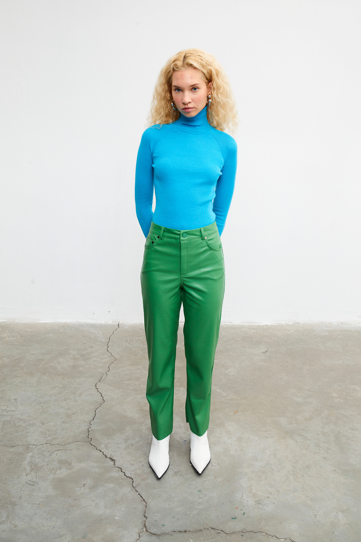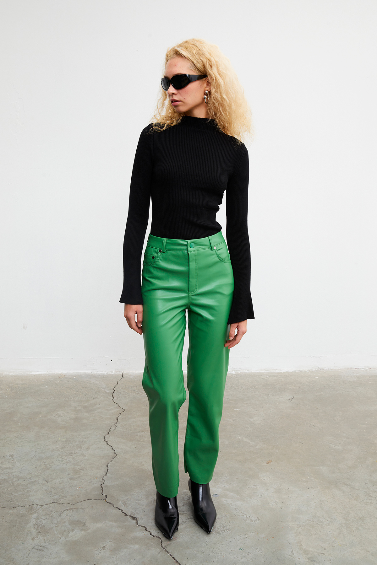 İki ön cepli, tam kalıp yüksek bel, önü fermuarlı, paçası lazer kesim bol paça suni deri pantolon. İç kısmı süettir.