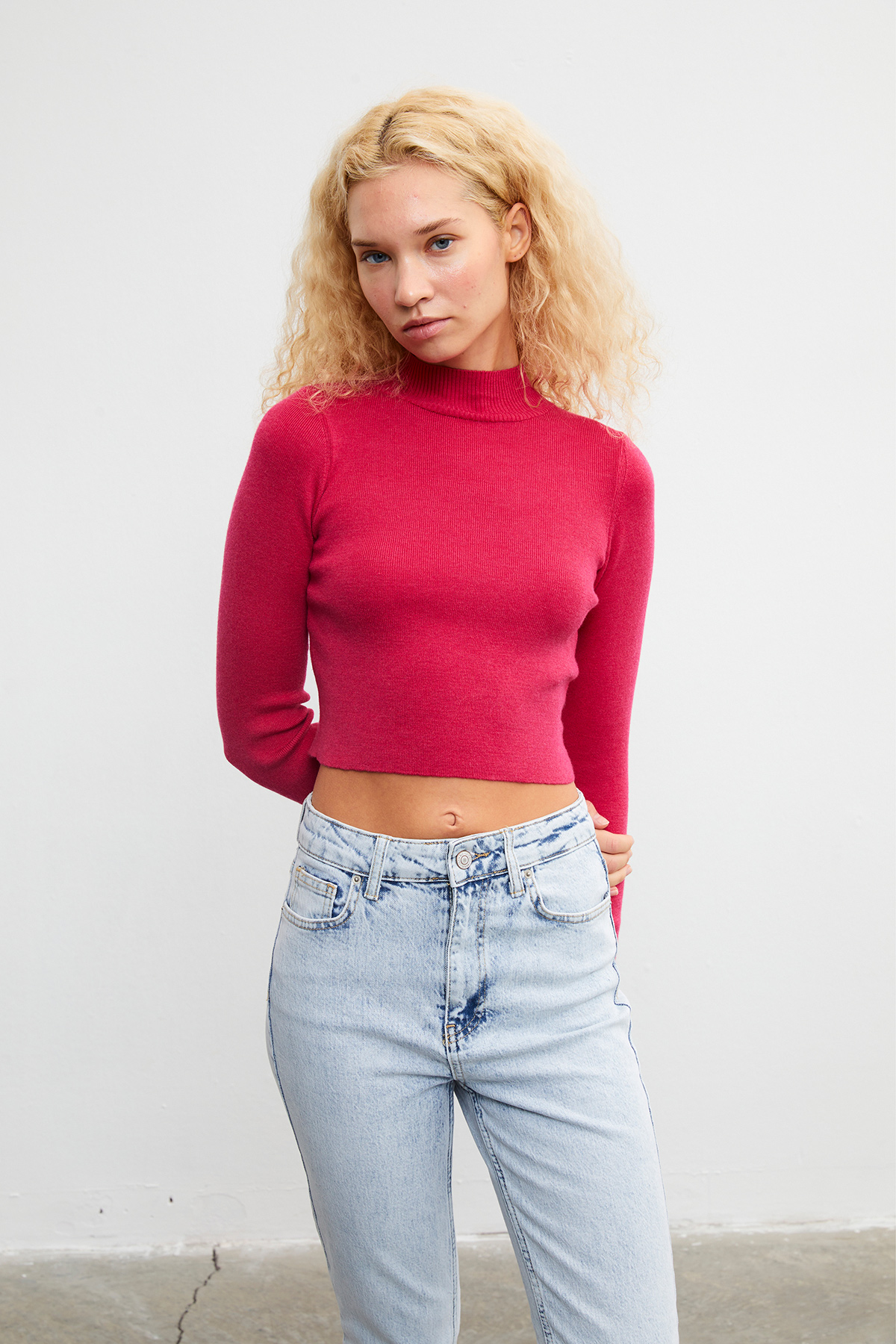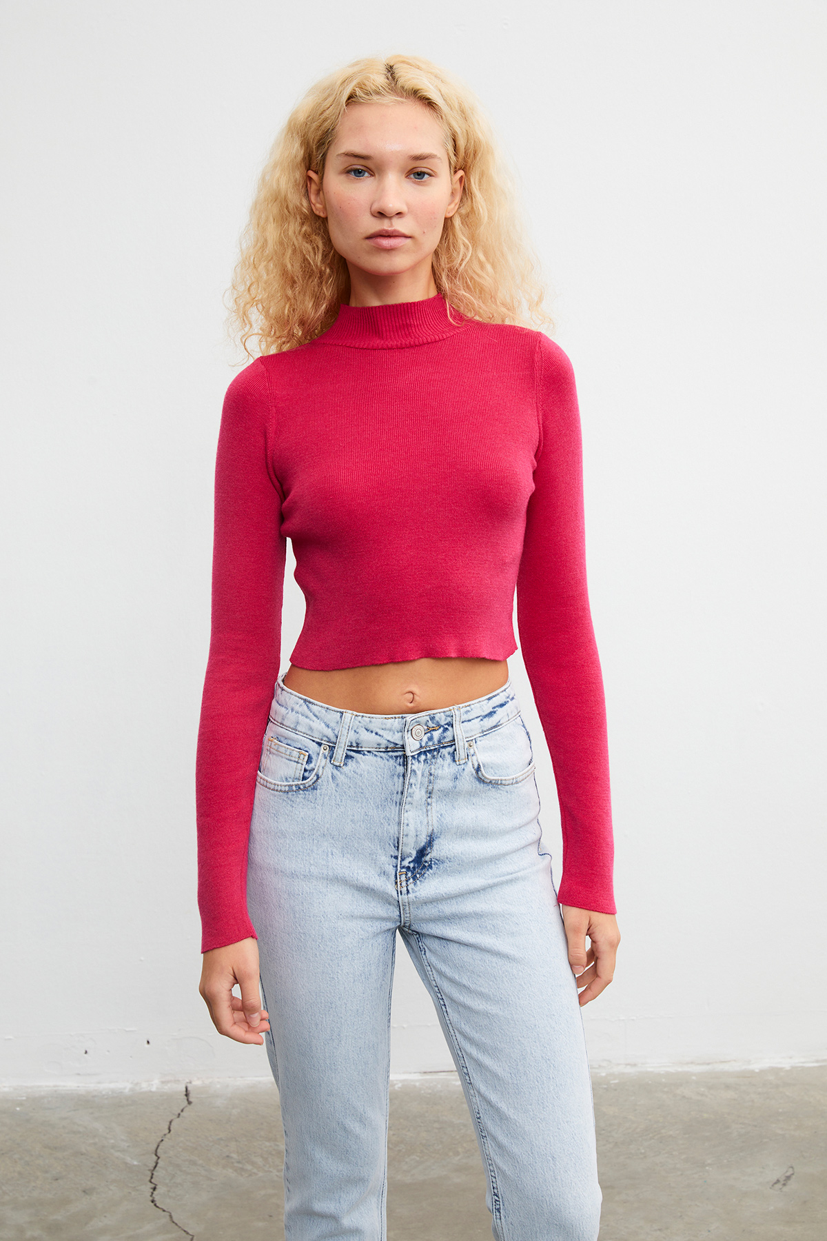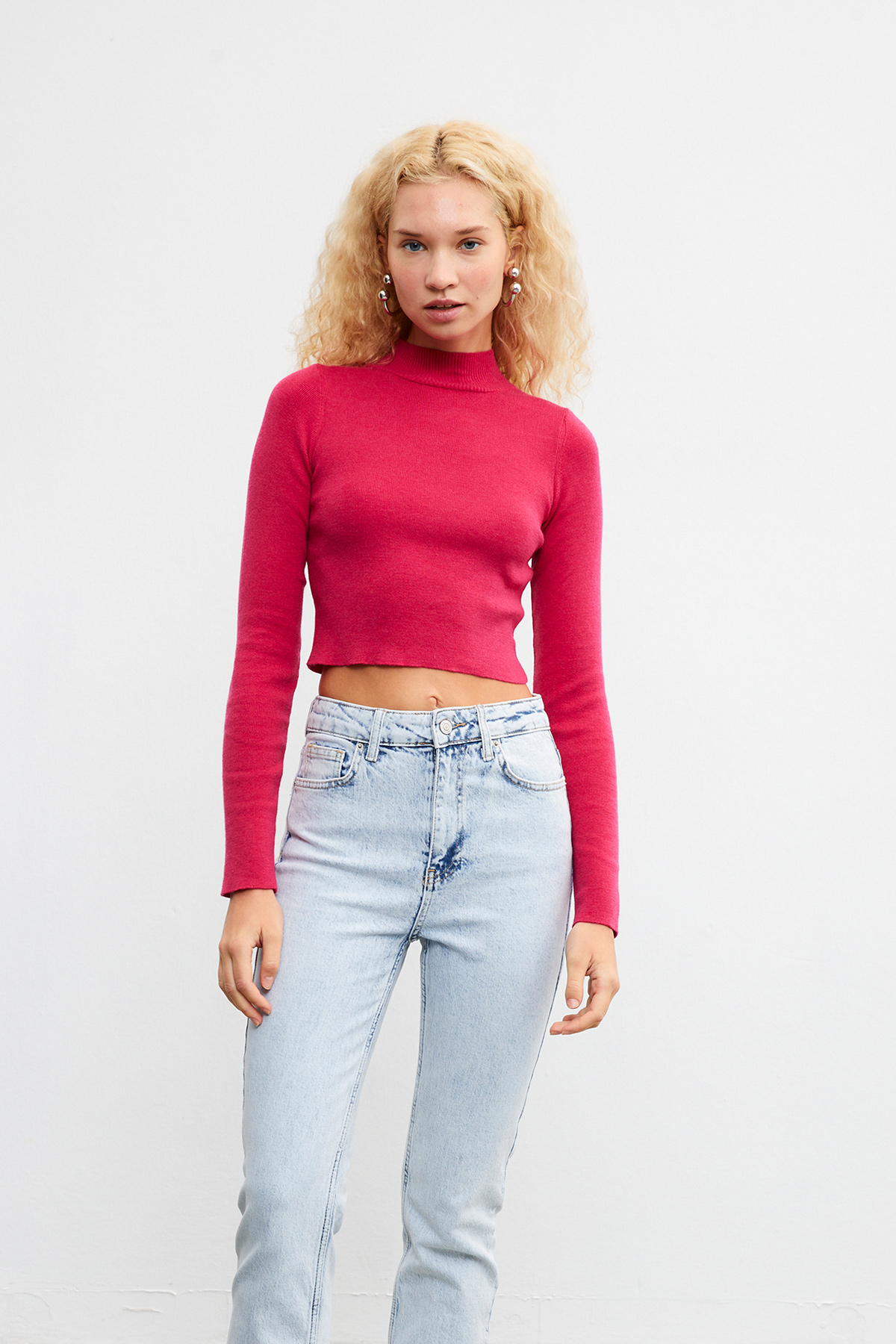 Dik yaka, esnek kumaş, tam kalıp,basic crop kazak.