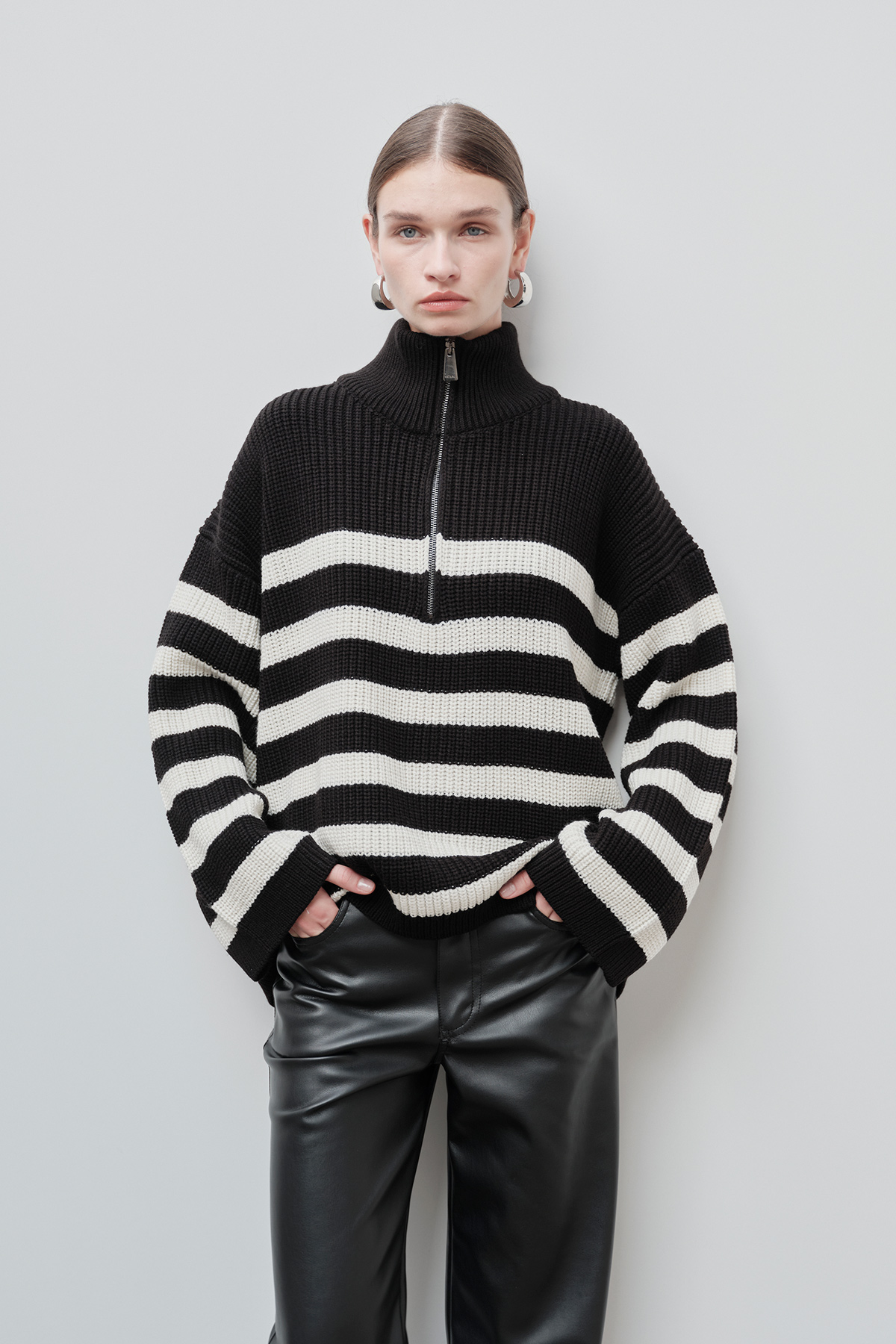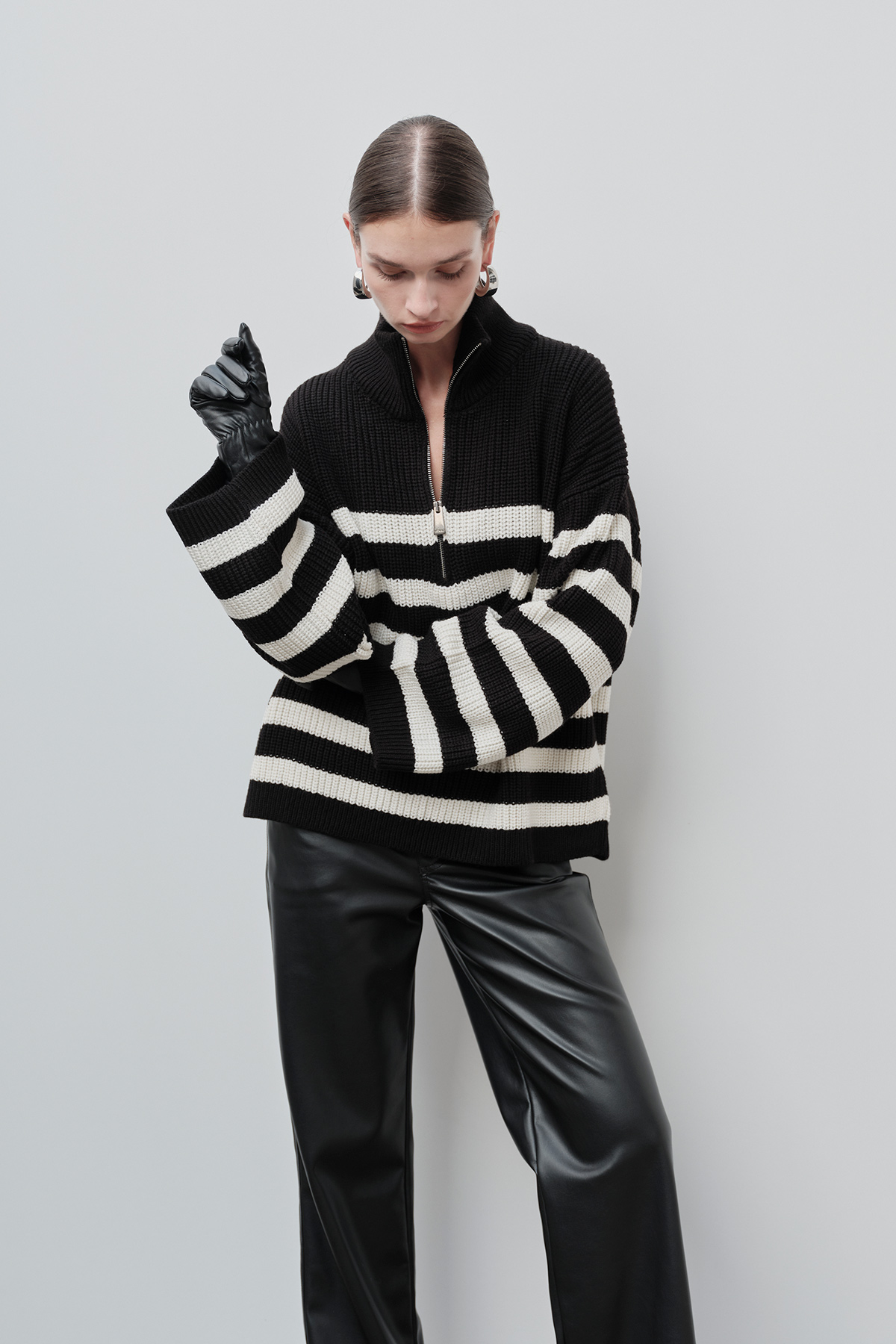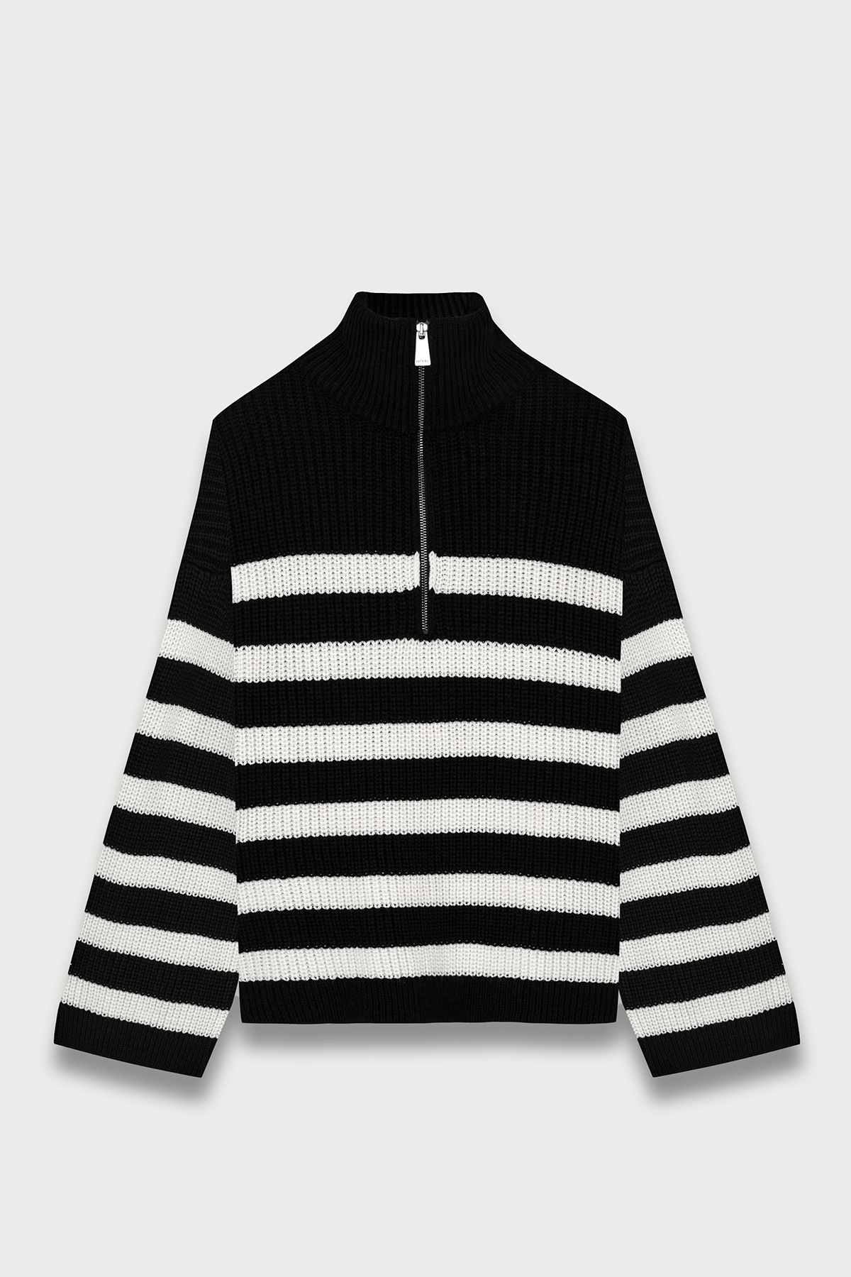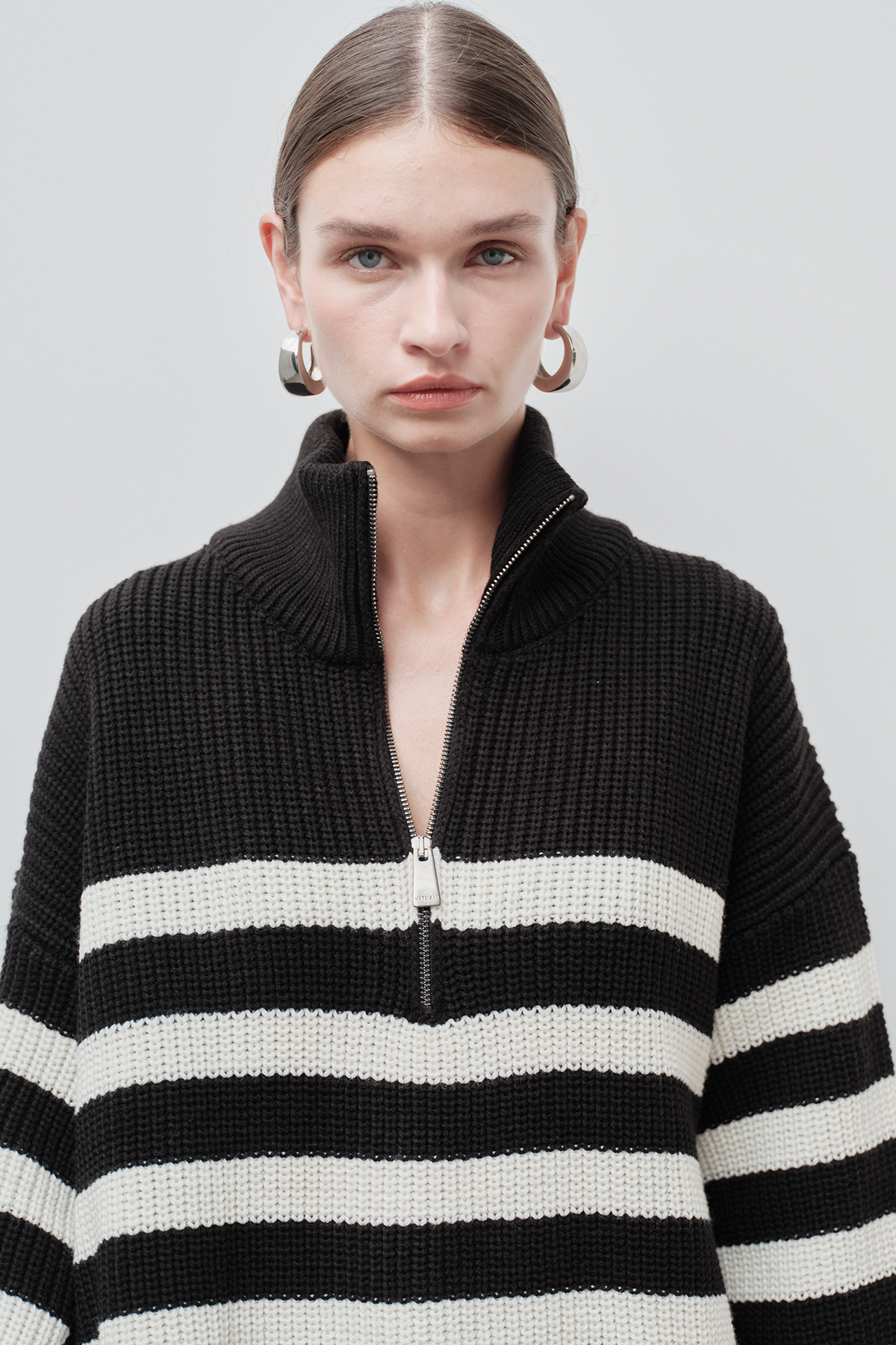 Dik yaka, fermuarlı, beyaz çizgi detaylı, oversize kadın kazak.