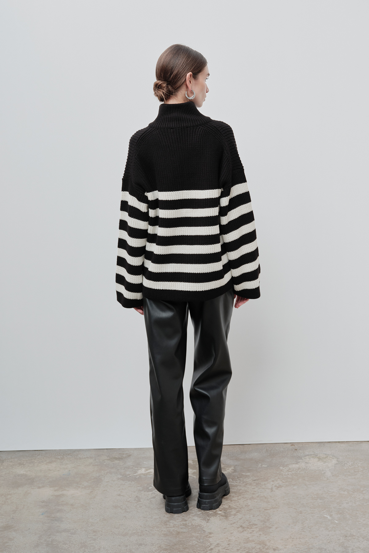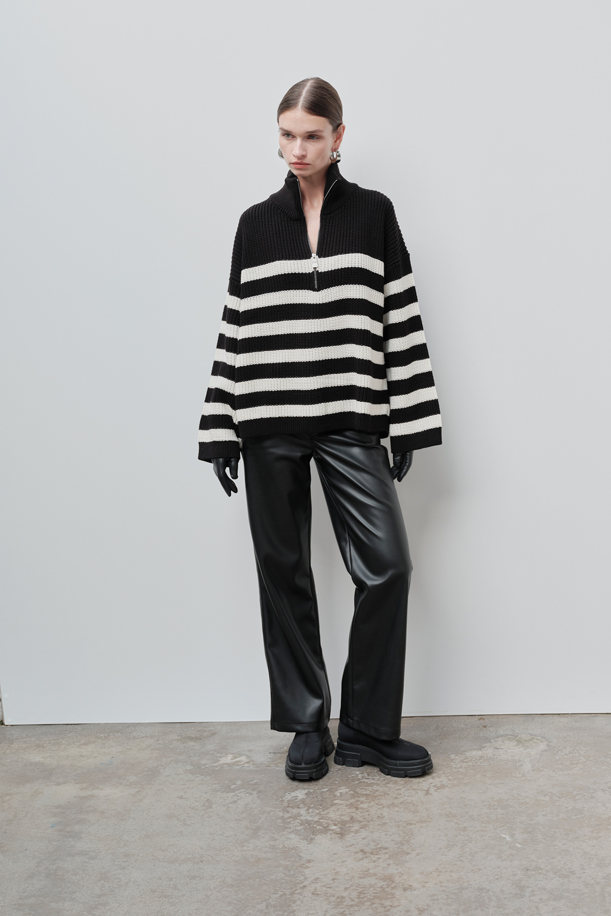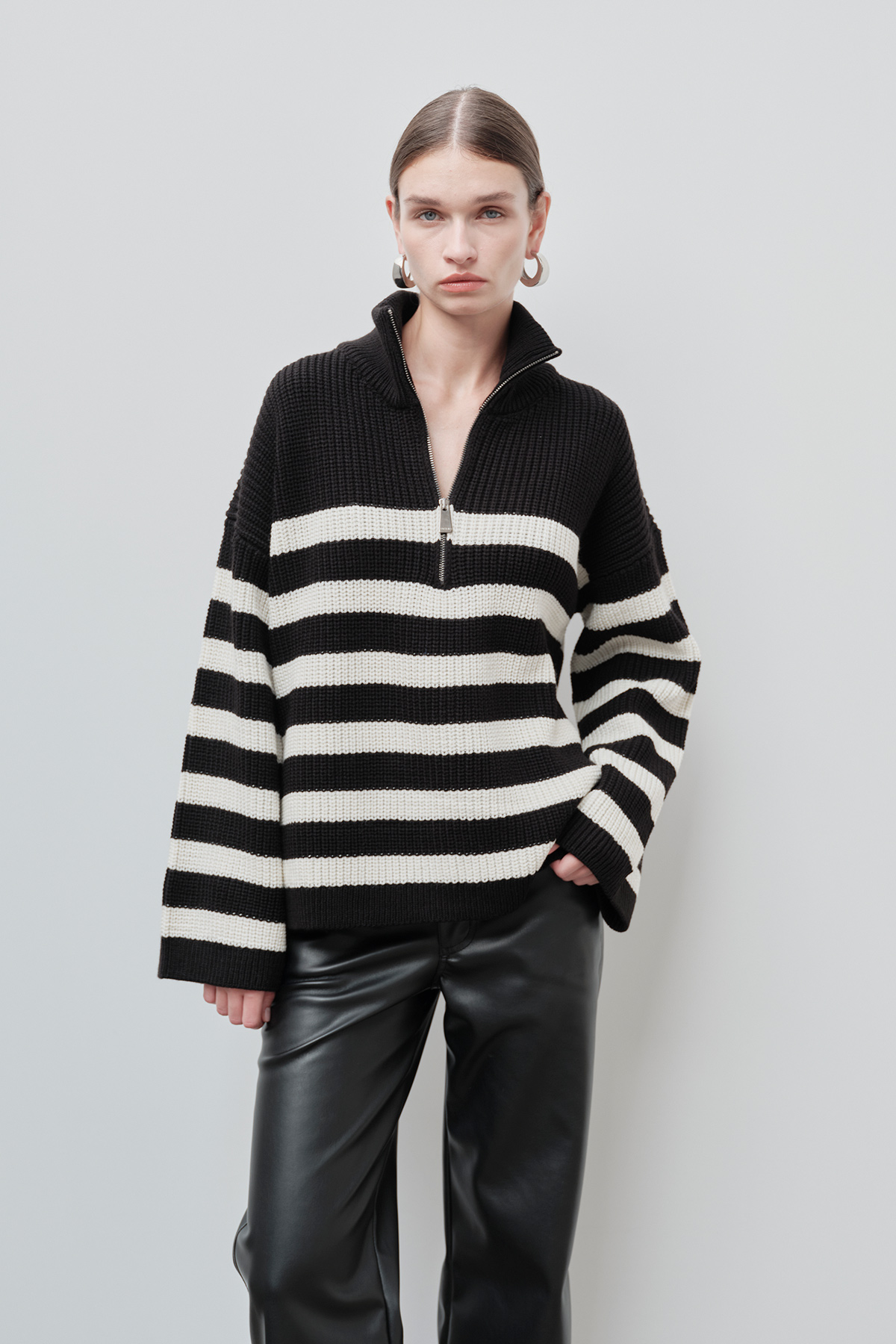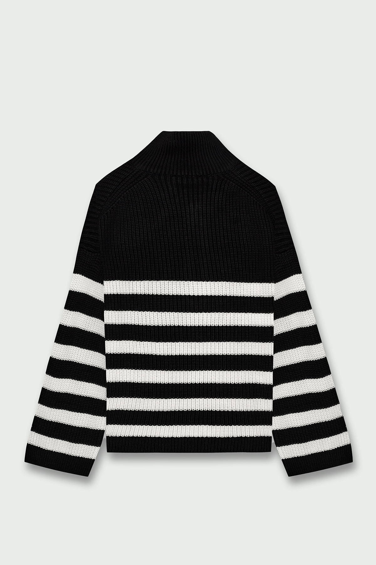 Dik yaka, fermuarlı, beyaz çizgi detaylı, oversize kadın kazak.