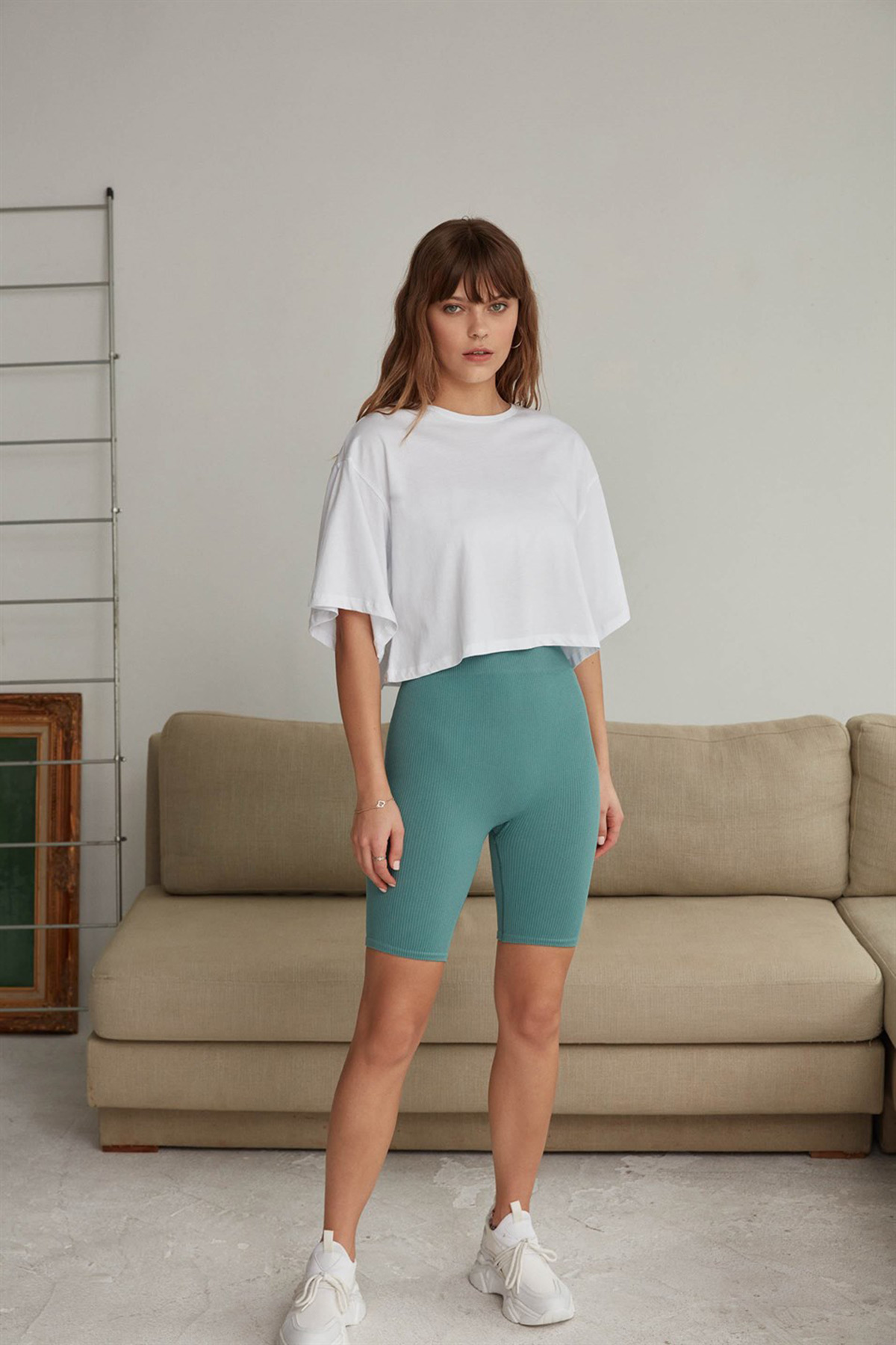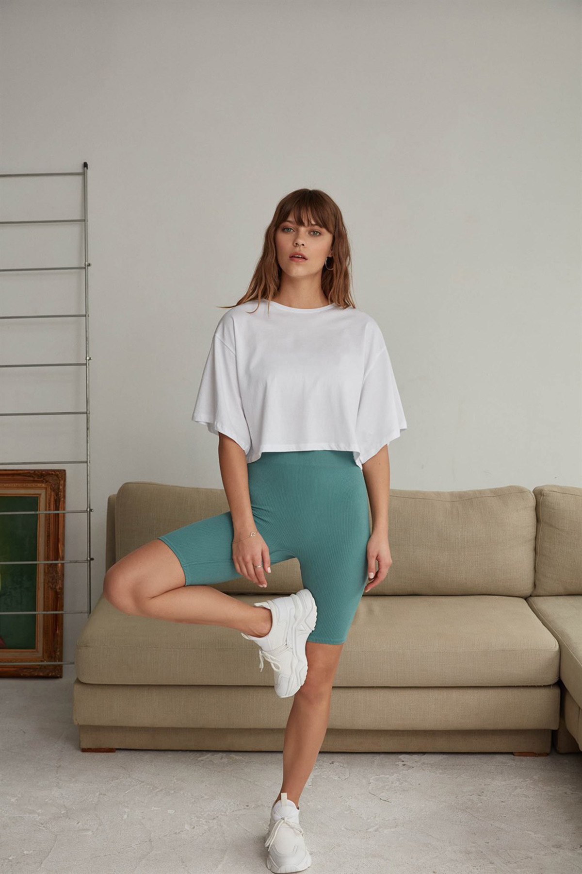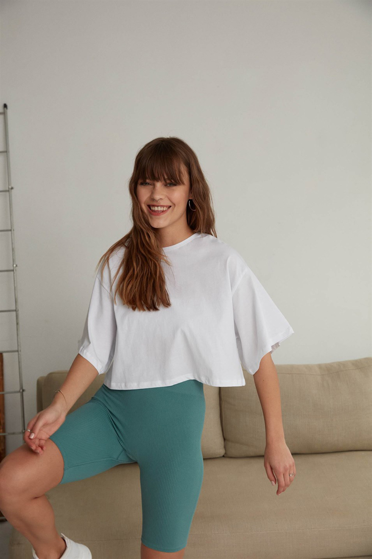 Bisiklet yaka, Oversize kalıp, Geniş kısa kollu, Crop tarz, Kadın t-shirt.