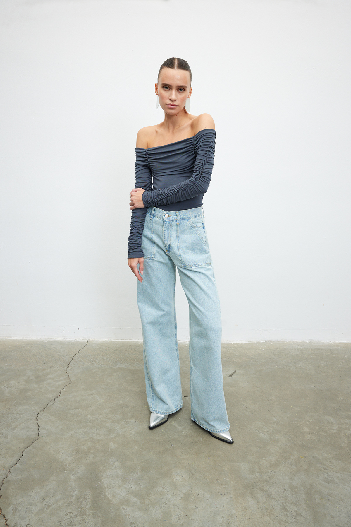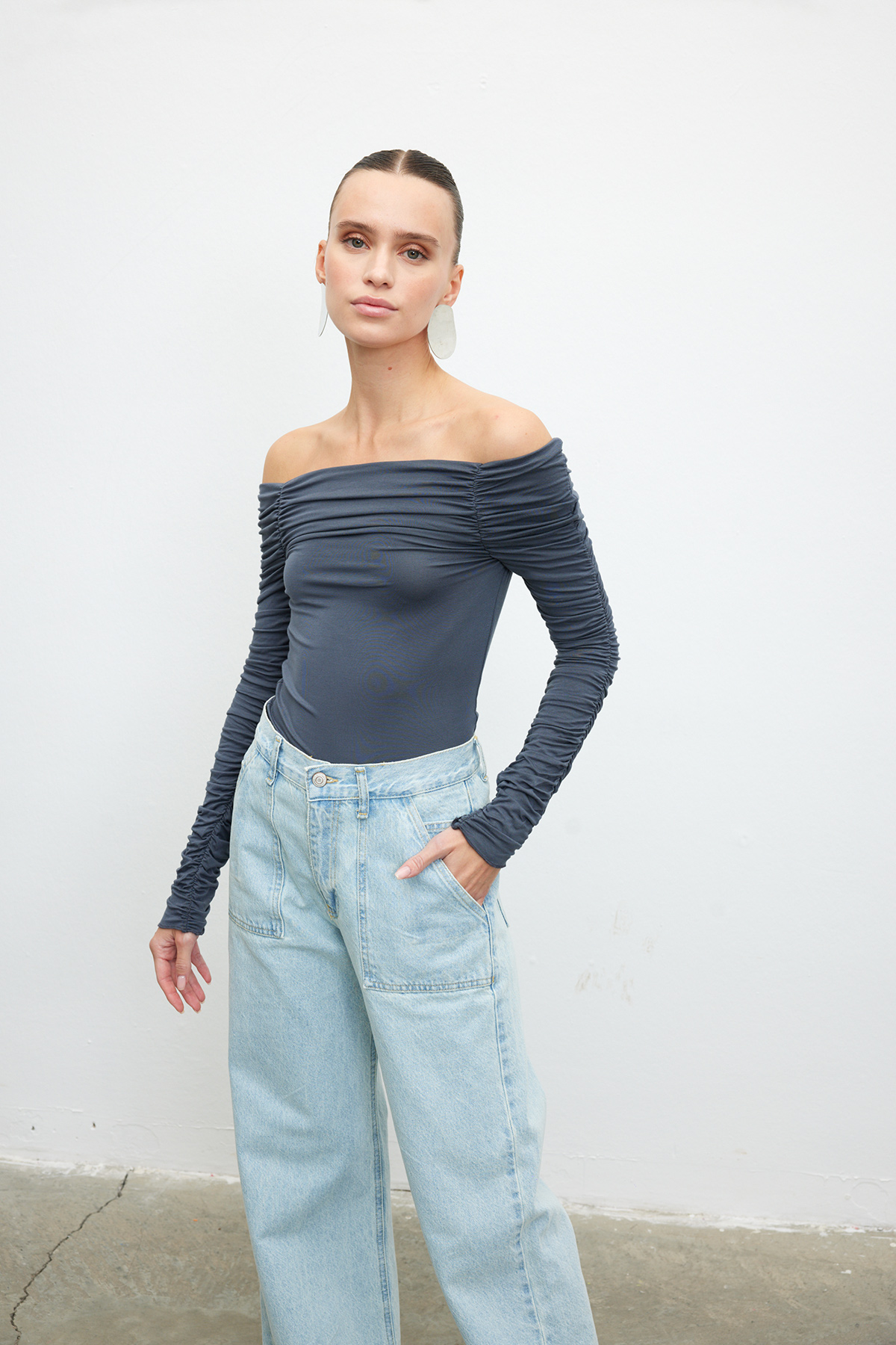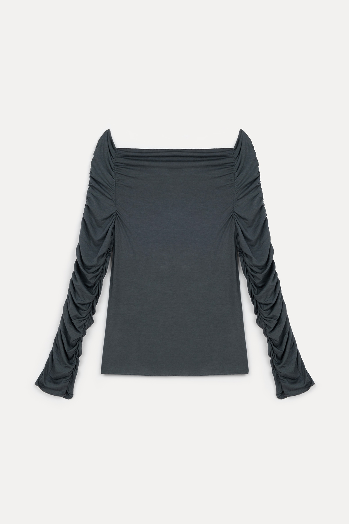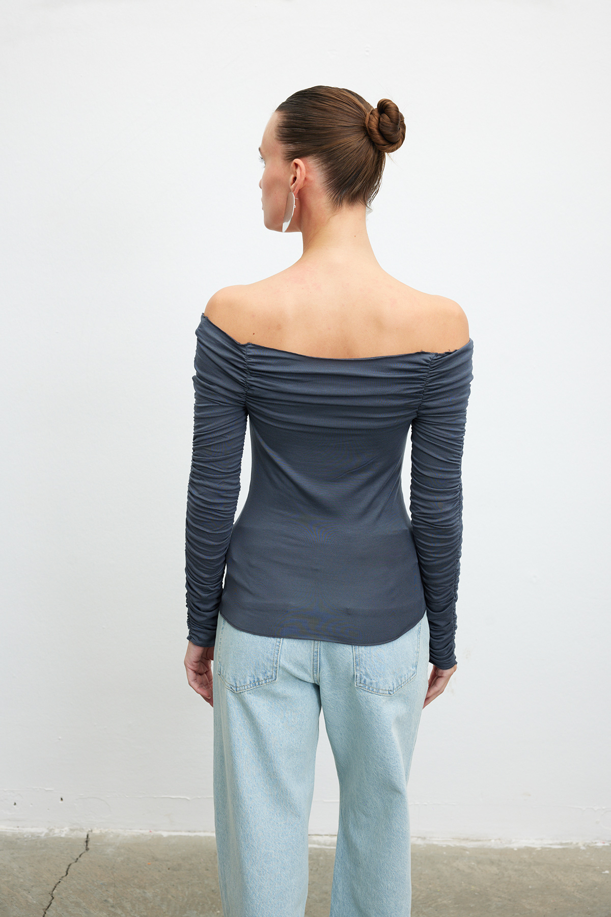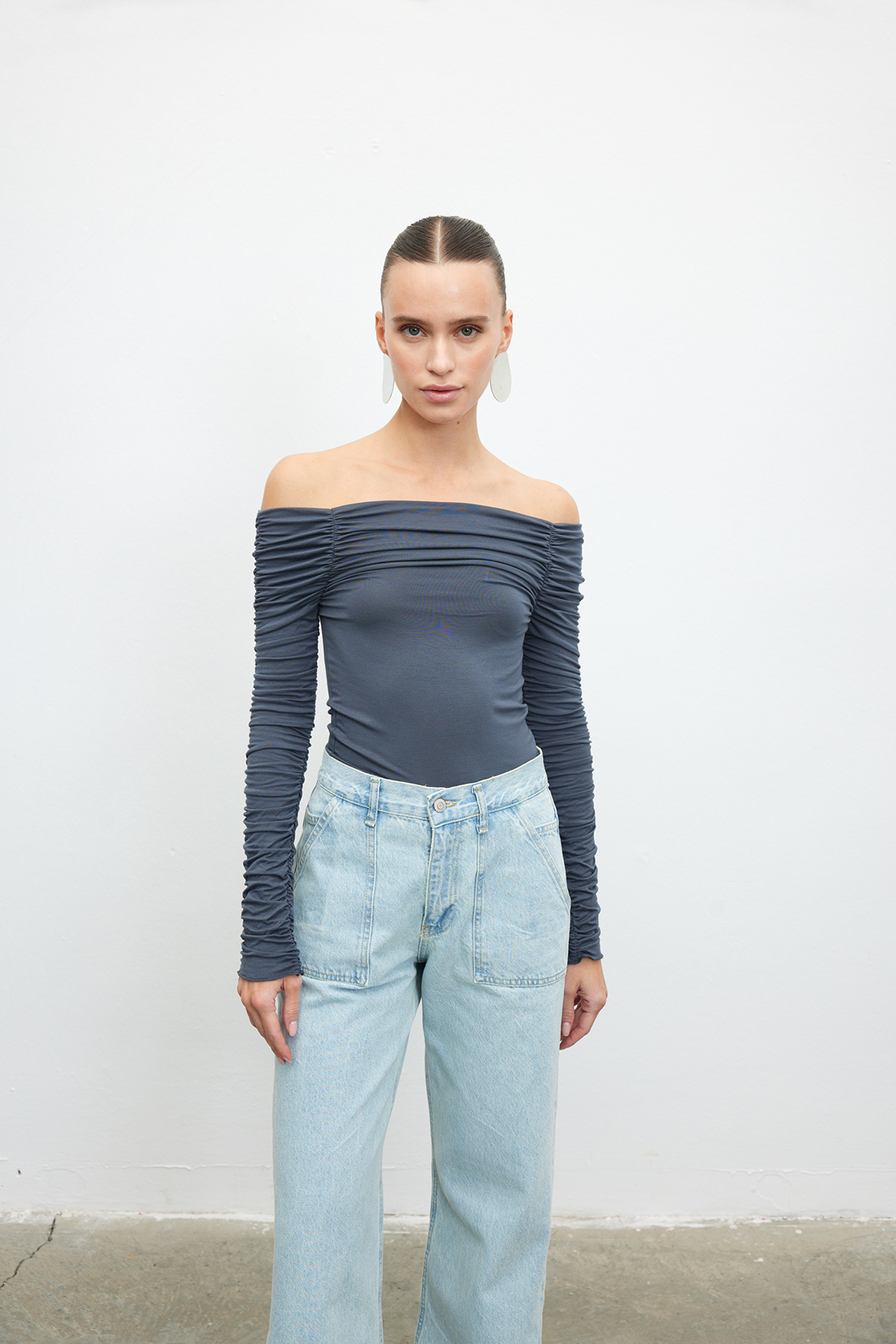 Omuzları açık, uzun kollu, tam kalıp, drape detaylı bluz