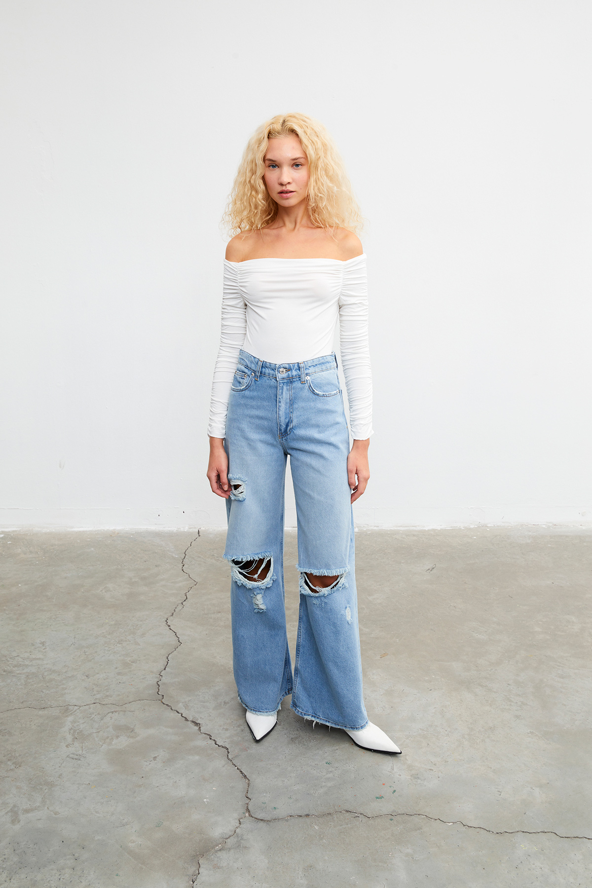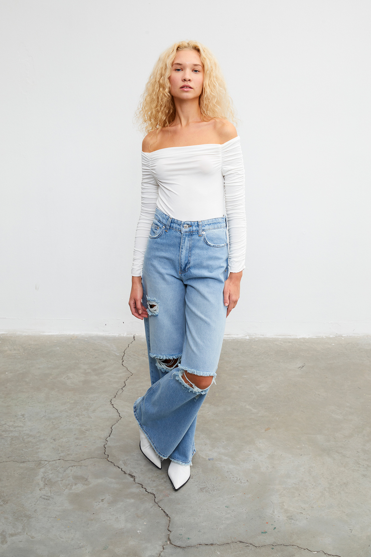 Omuzları açık, uzun kollu, tam kalıp, drape detaylı bluz
