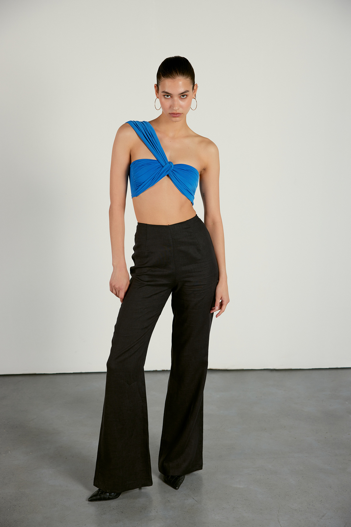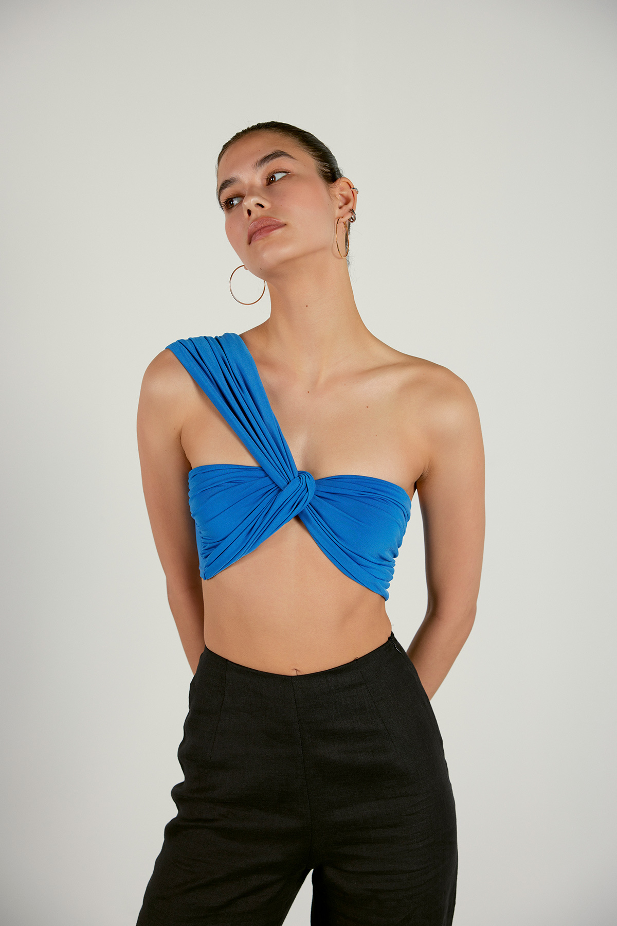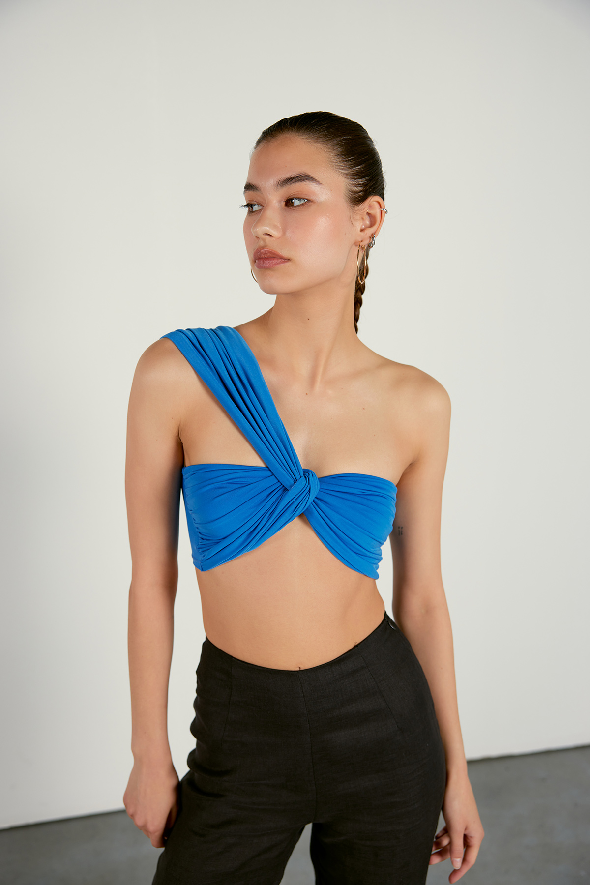 Tek omuz askılı,düğüm detaylı,yanları drapeli kadın bluz.