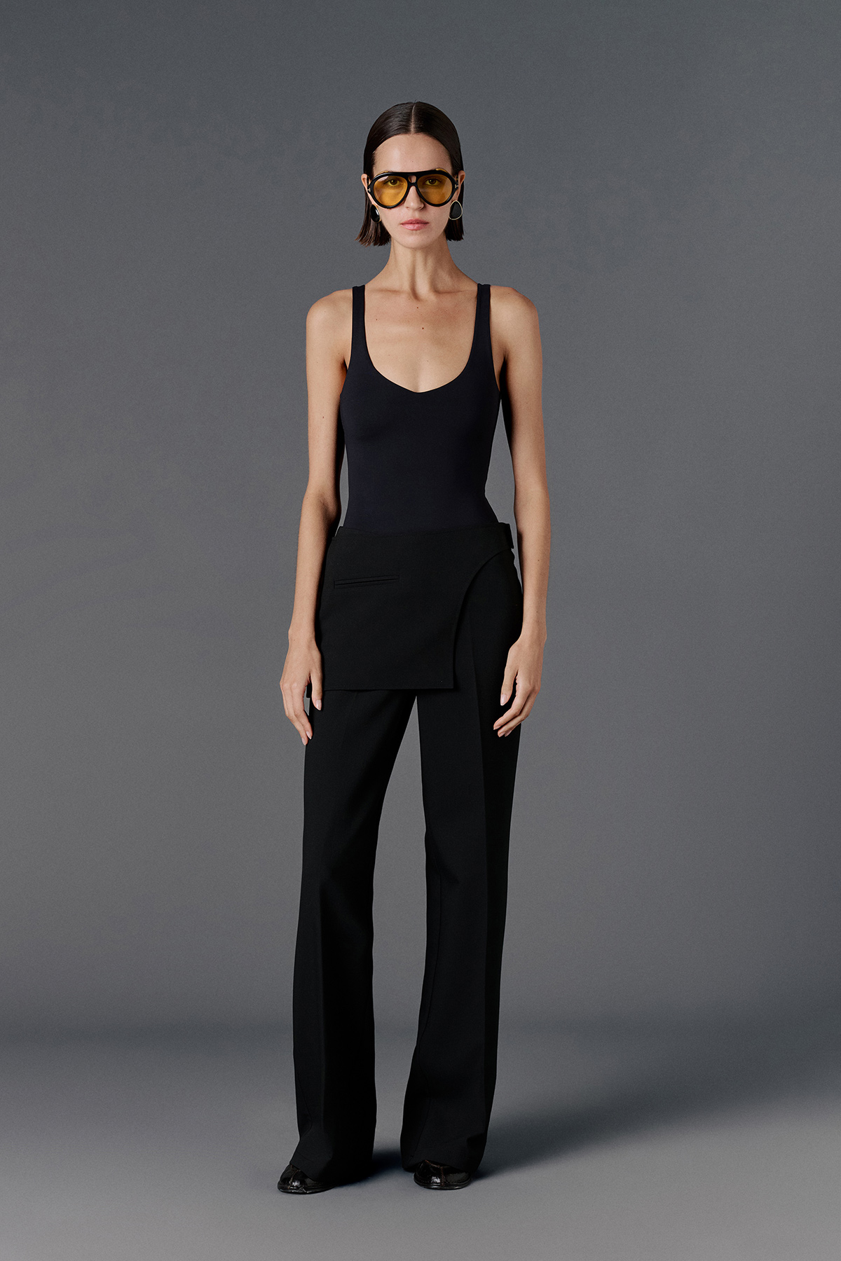 Yüksek bel, düğmeli ve fermuarlı, astarsız, tam kalıp, çıkarılabilir etek detaylı kumaş pantolon.