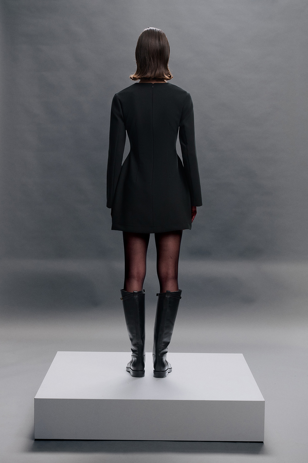 Bisiklet yaka, astarsız, arkadan gizli fermuar kapamalı, uzun kollu, aksesuar cep görünümlü, bele oturan mini elbise.