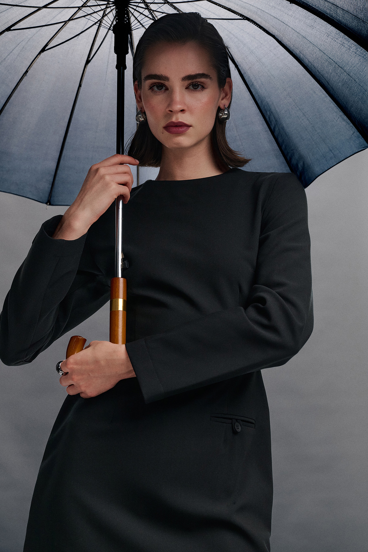 Bisiklet yaka, astarsız, arkadan gizli fermuar kapamalı, uzun kollu, aksesuar cep görünümlü, bele oturan mini elbise.