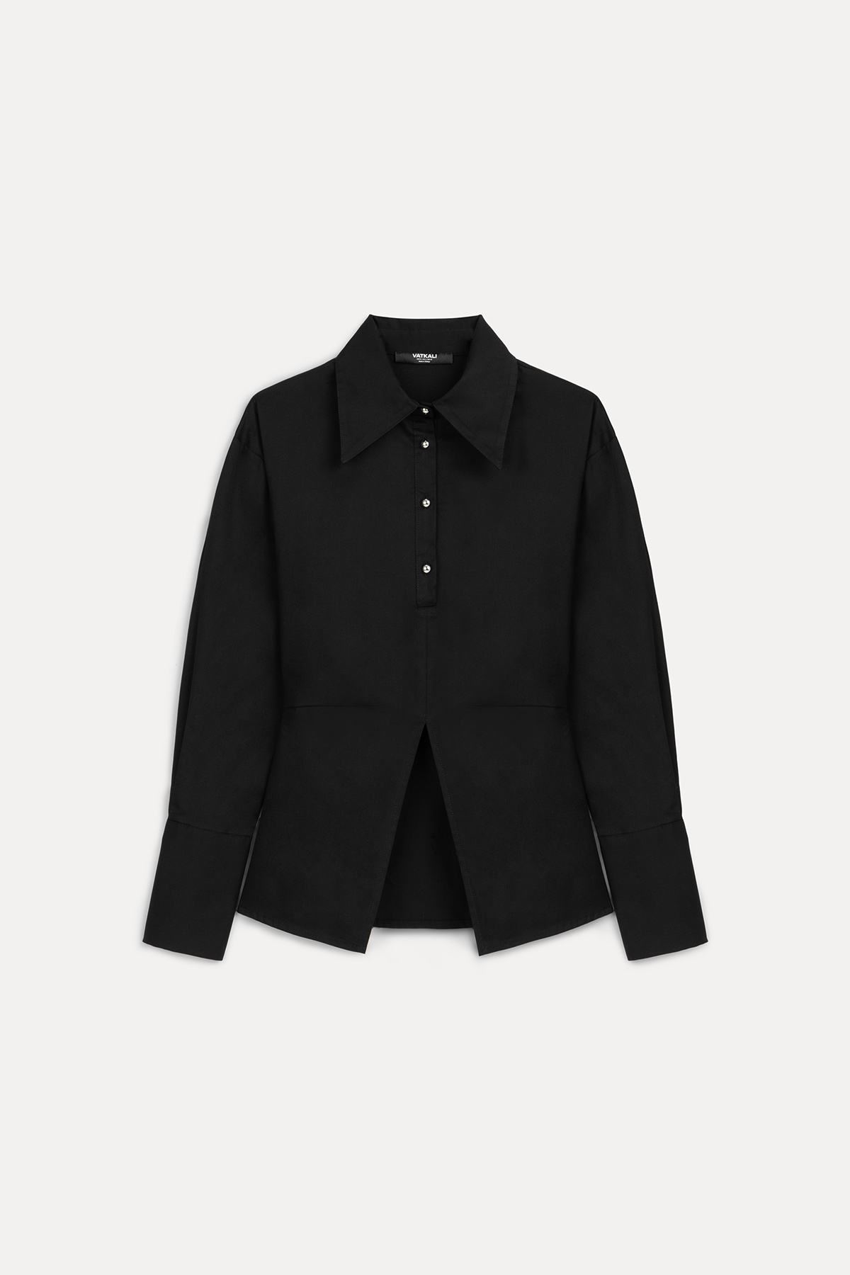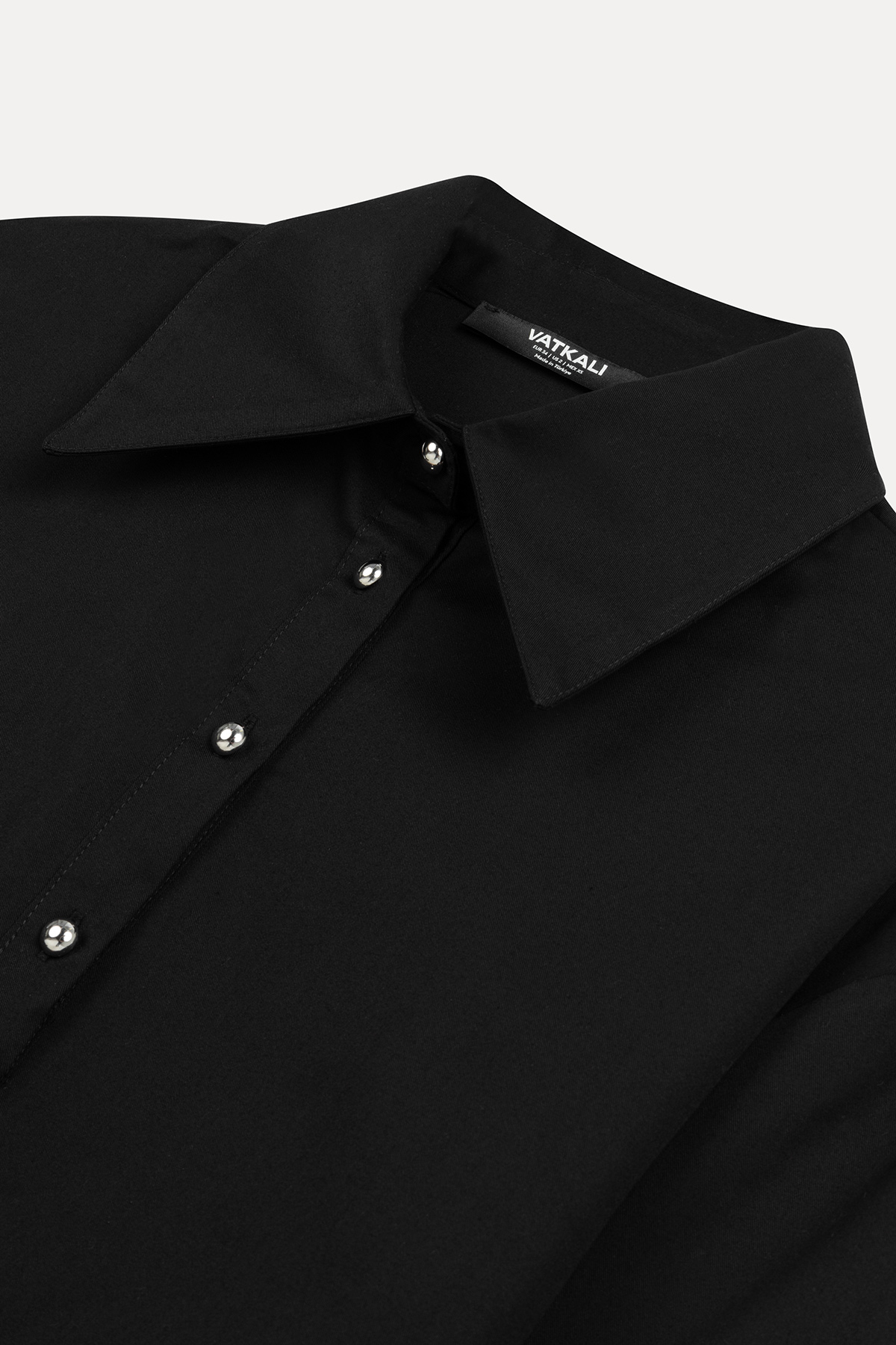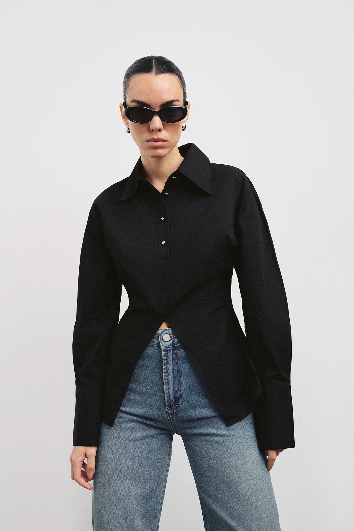 Gömlek yaka, önü düğme kapamalı,yandan fermuarlı,astarsız, tam kalıp, manşeti düğmeli, uzun kollu, feminen kesim gömlek.