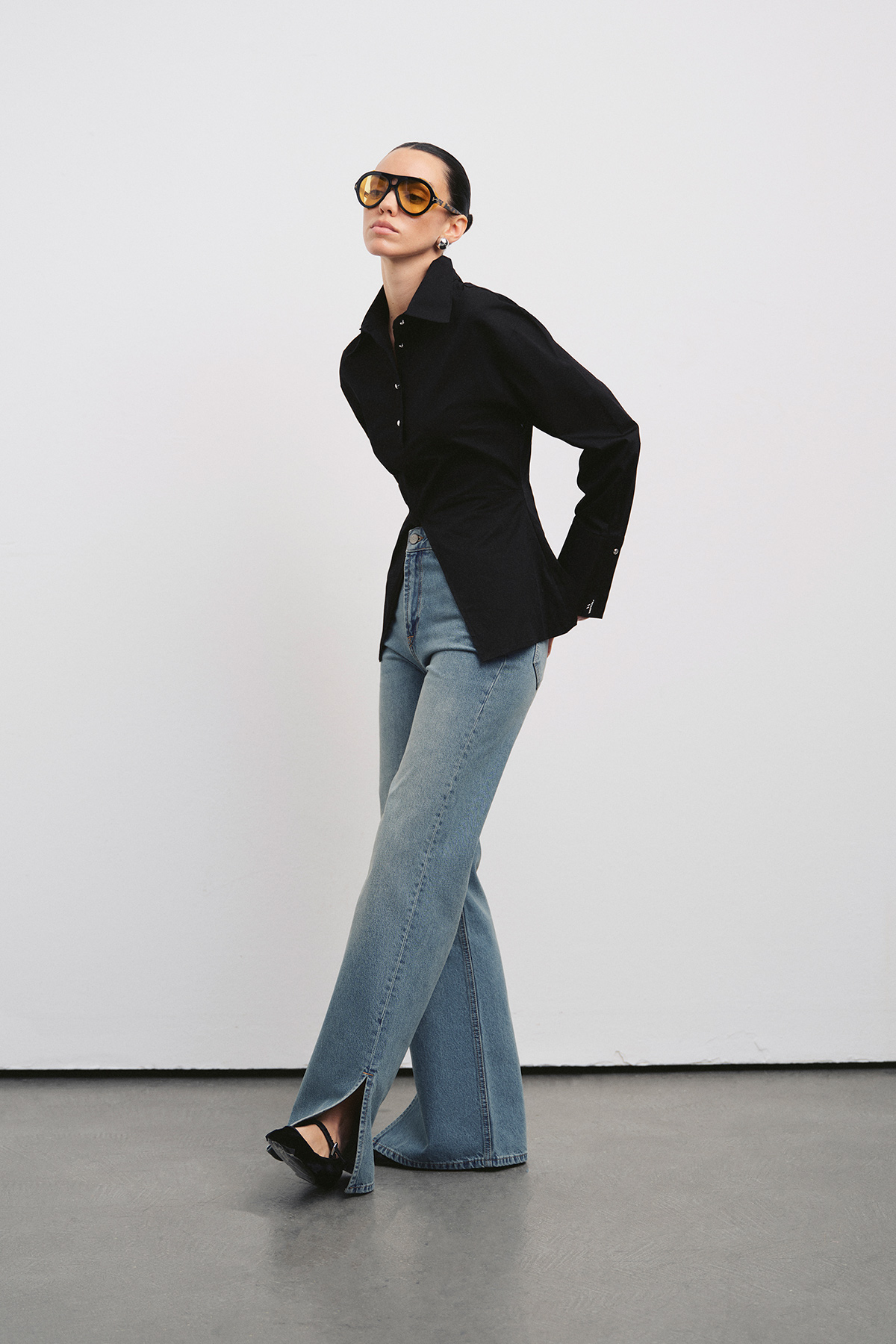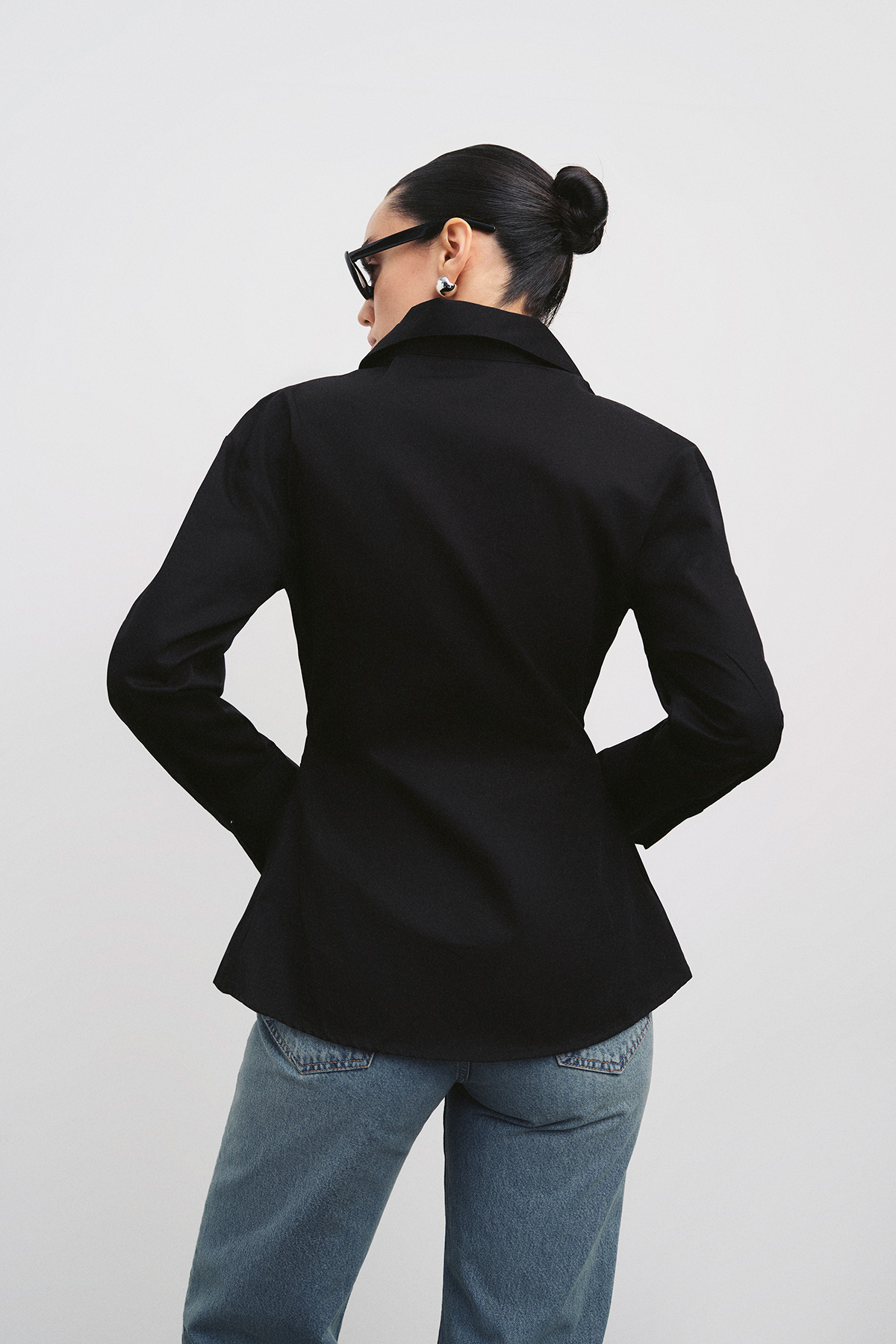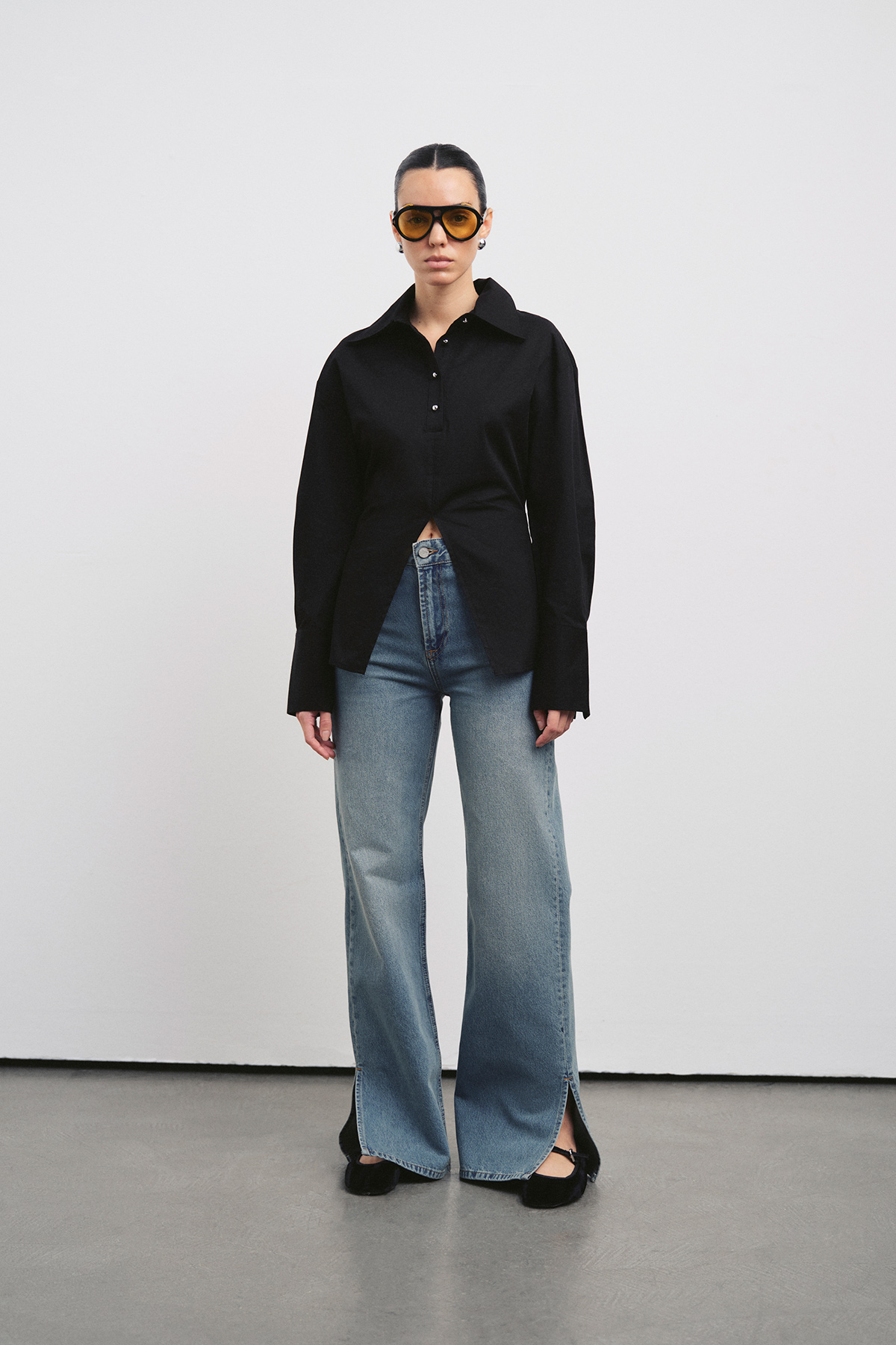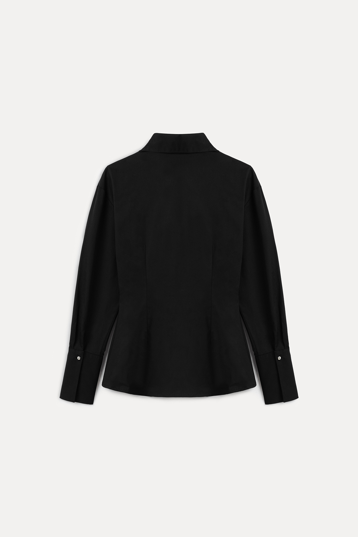 Gömlek yaka, önü düğme kapamalı,yandan fermuarlı,astarsız, tam kalıp, manşeti düğmeli, uzun kollu, feminen kesim gömlek.