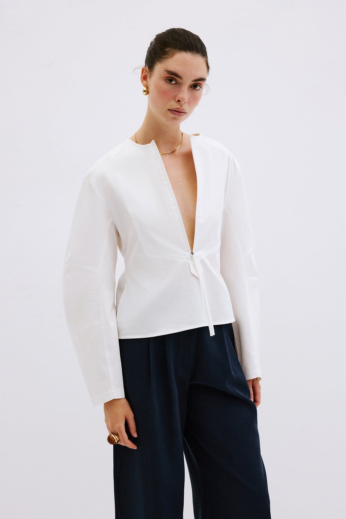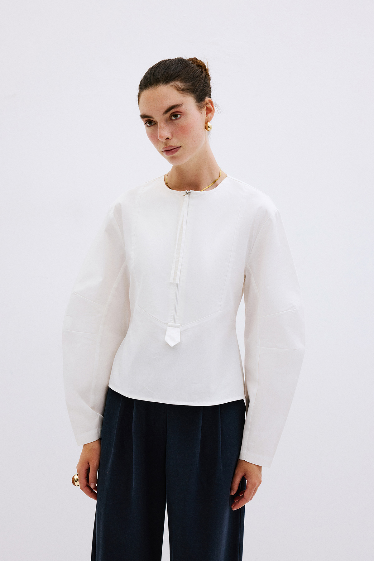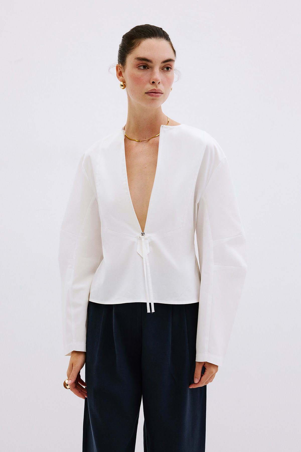 V yaka dekolteli, fermuarlı önden kapanış, astarsız, bele oturan, geniş kol detaylı gömlek.