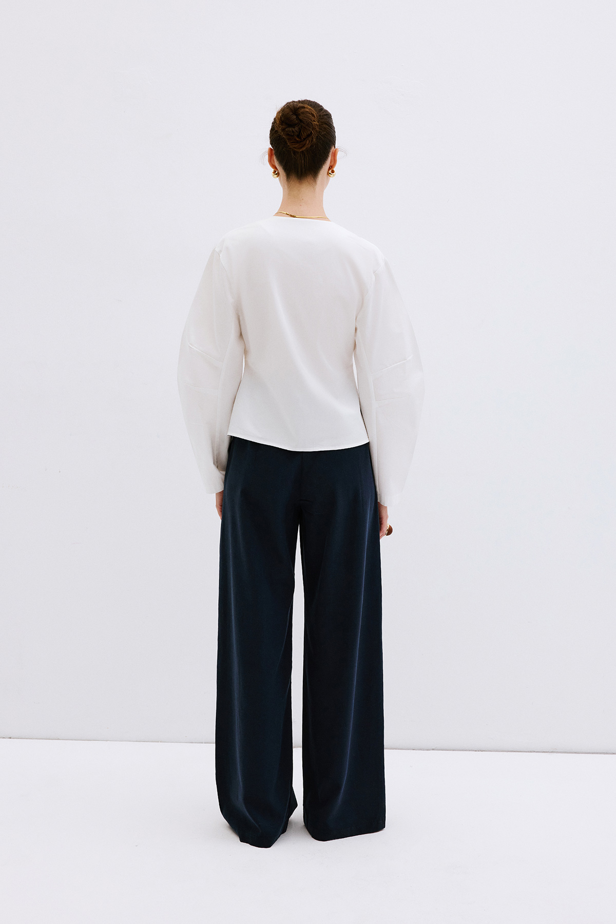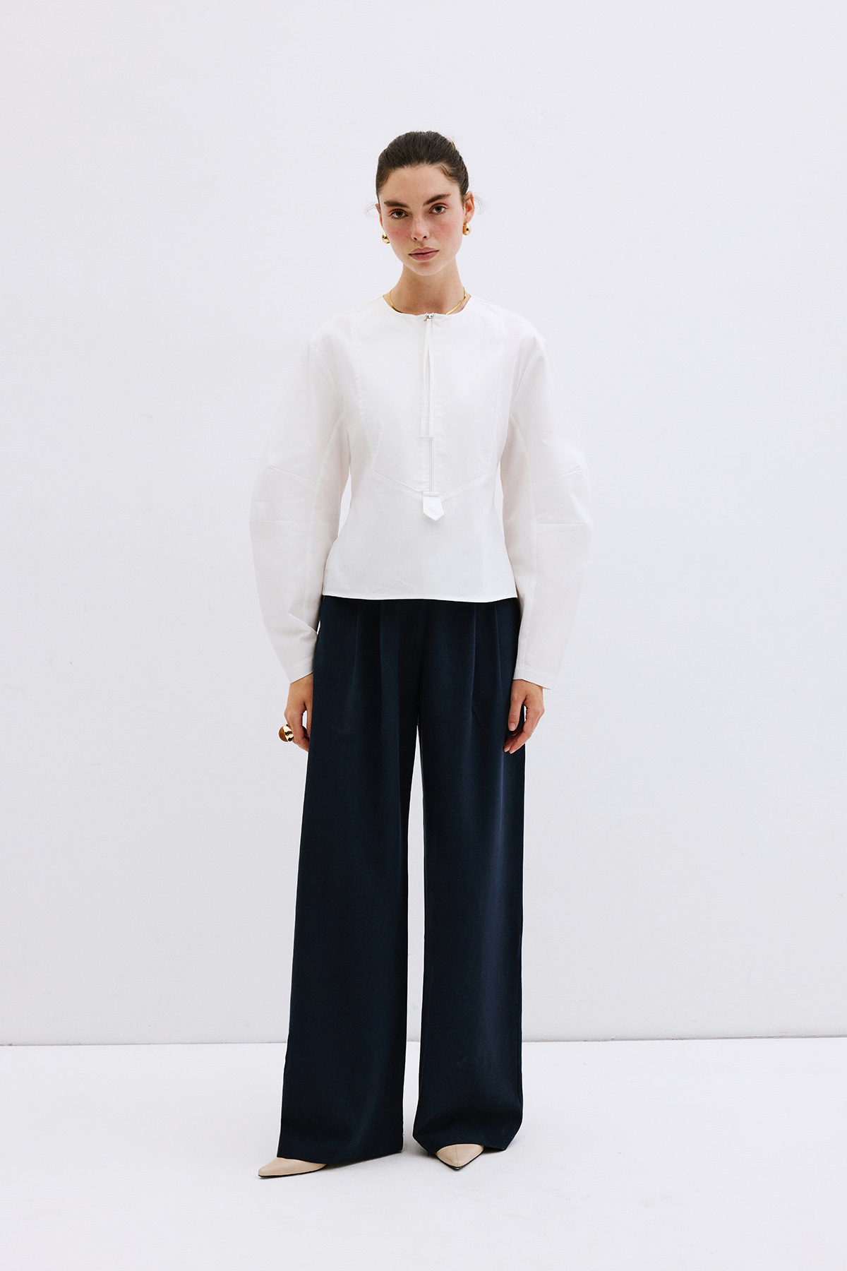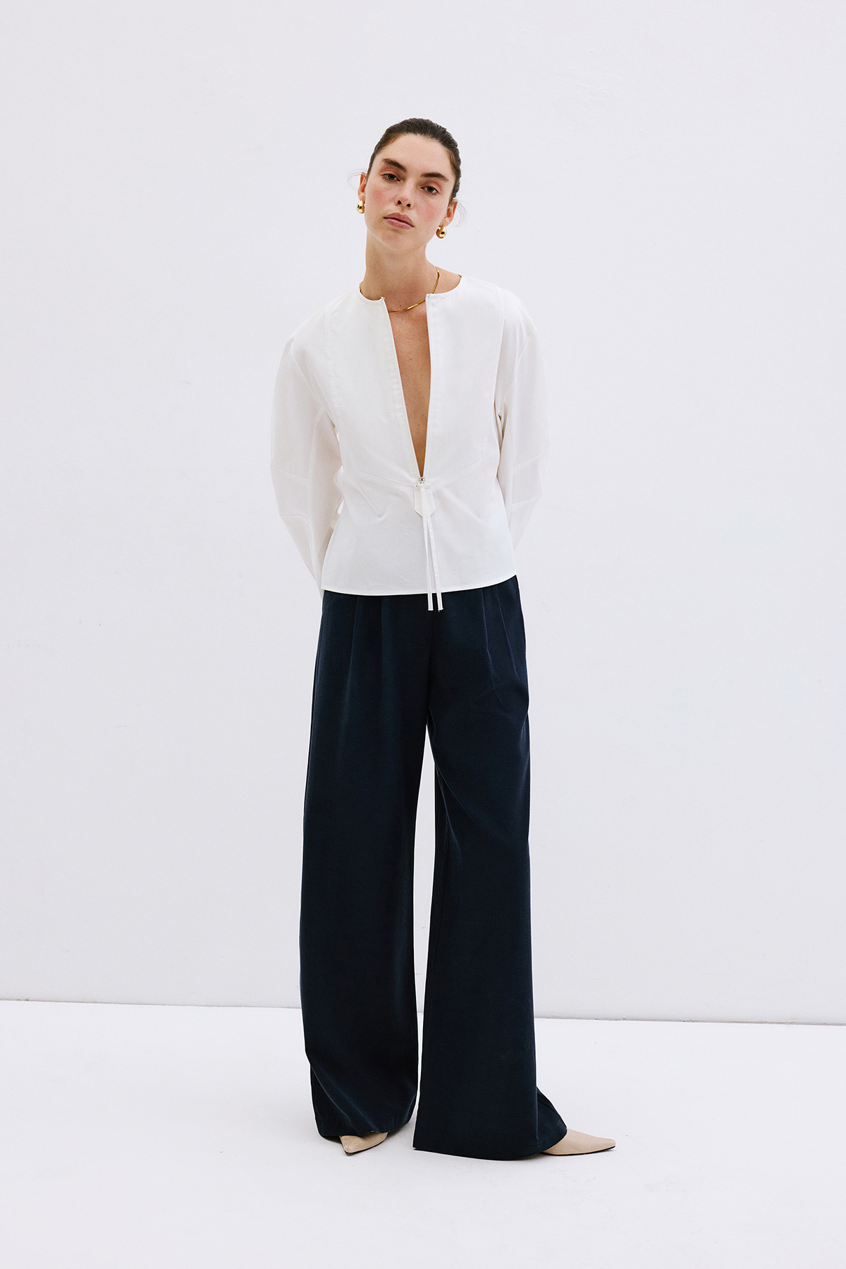 V yaka dekolteli, fermuarlı önden kapanış, astarsız, bele oturan, geniş kol detaylı gömlek.