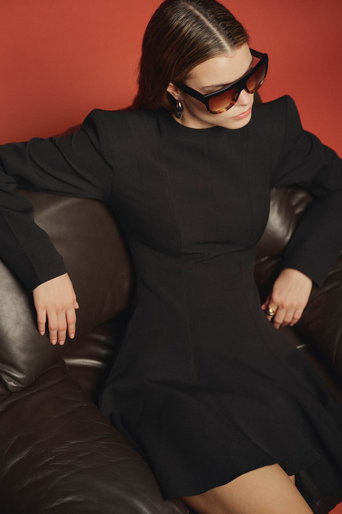 Bisiklet yaka, vatkalı, tam kalıp, cepsiz,uzun kollu, esnek, arka ortadan gizli fermuarlı, astarsız, godet detaylı mini elbise.