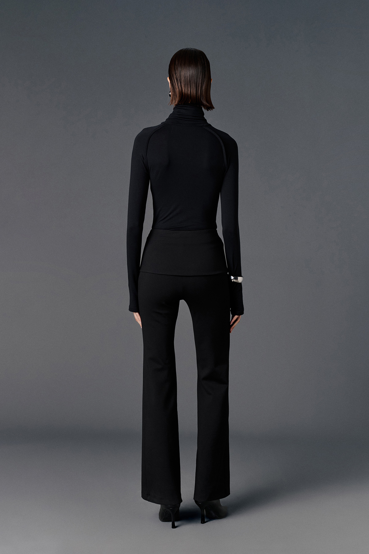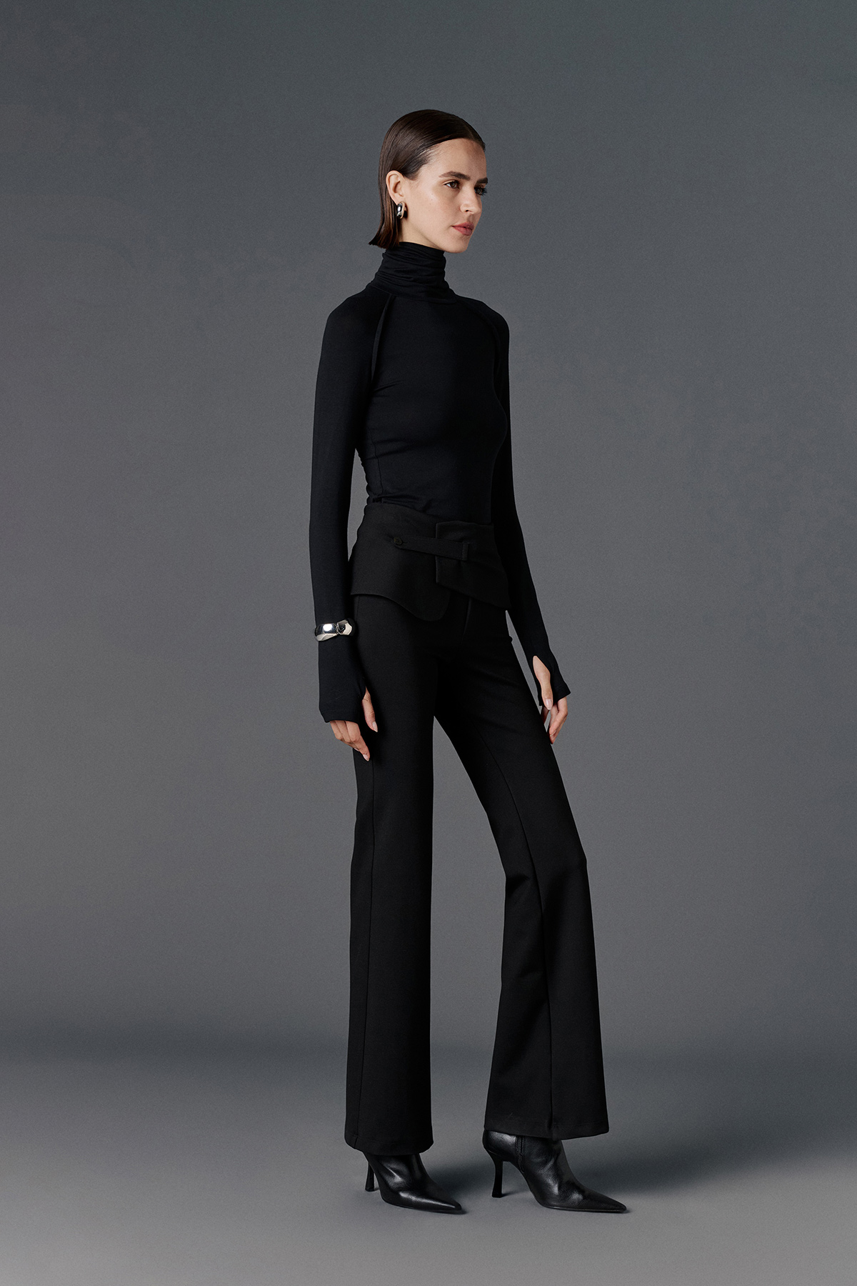 Düşük bel, ispanyol paça, örme kumaş, cepsiz. etek detaylı pantolon.