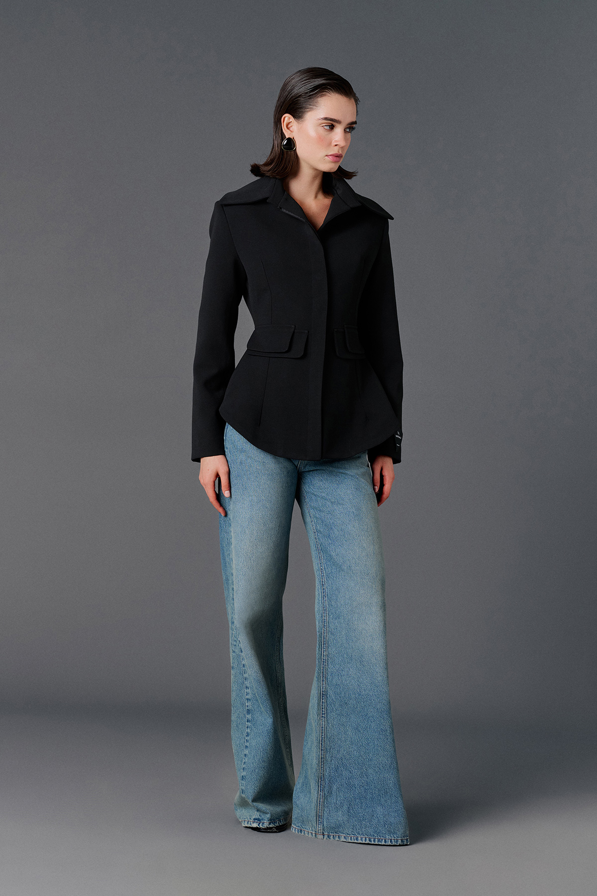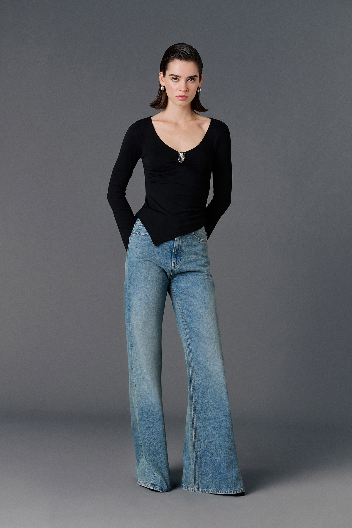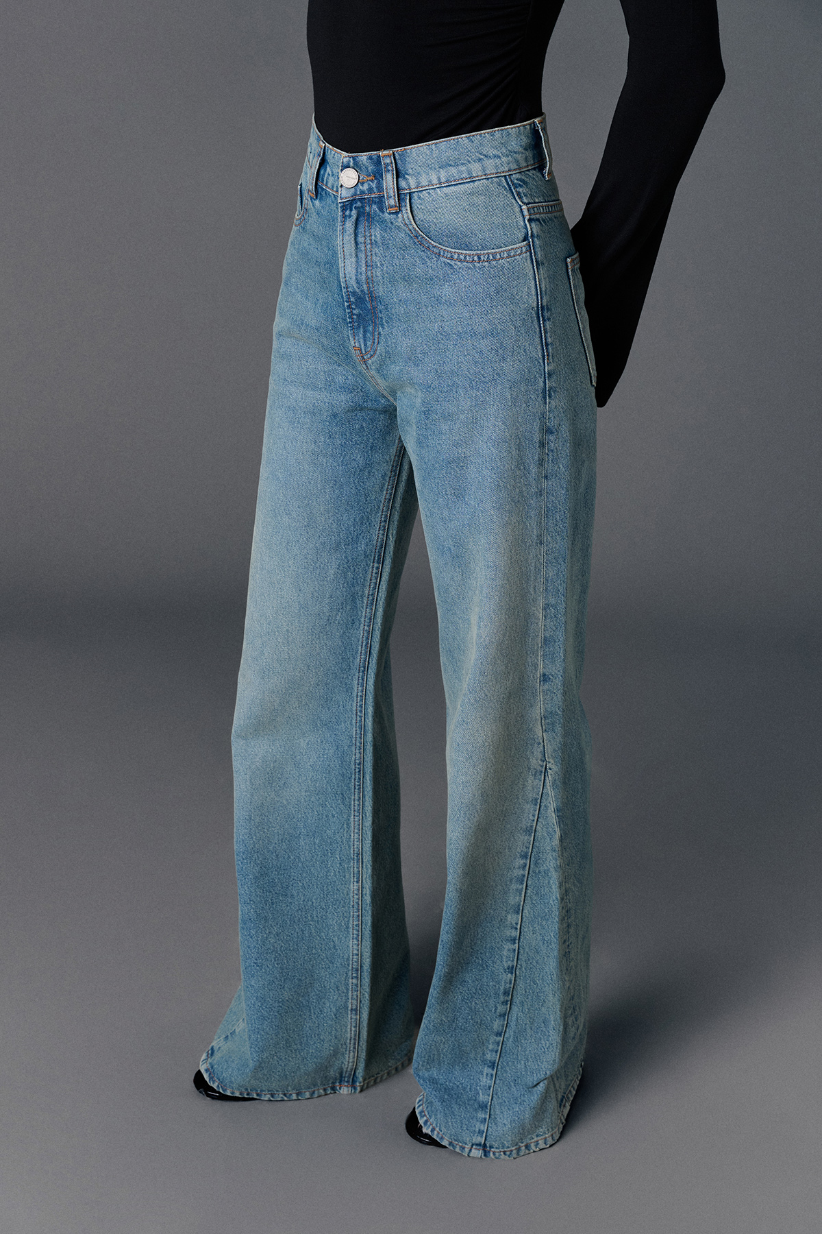 Yüksek bel, ispanyol paça, önü düğme ve fermuar kapamalı, yanlardan kesik detaylı, tam kalıp jean.
