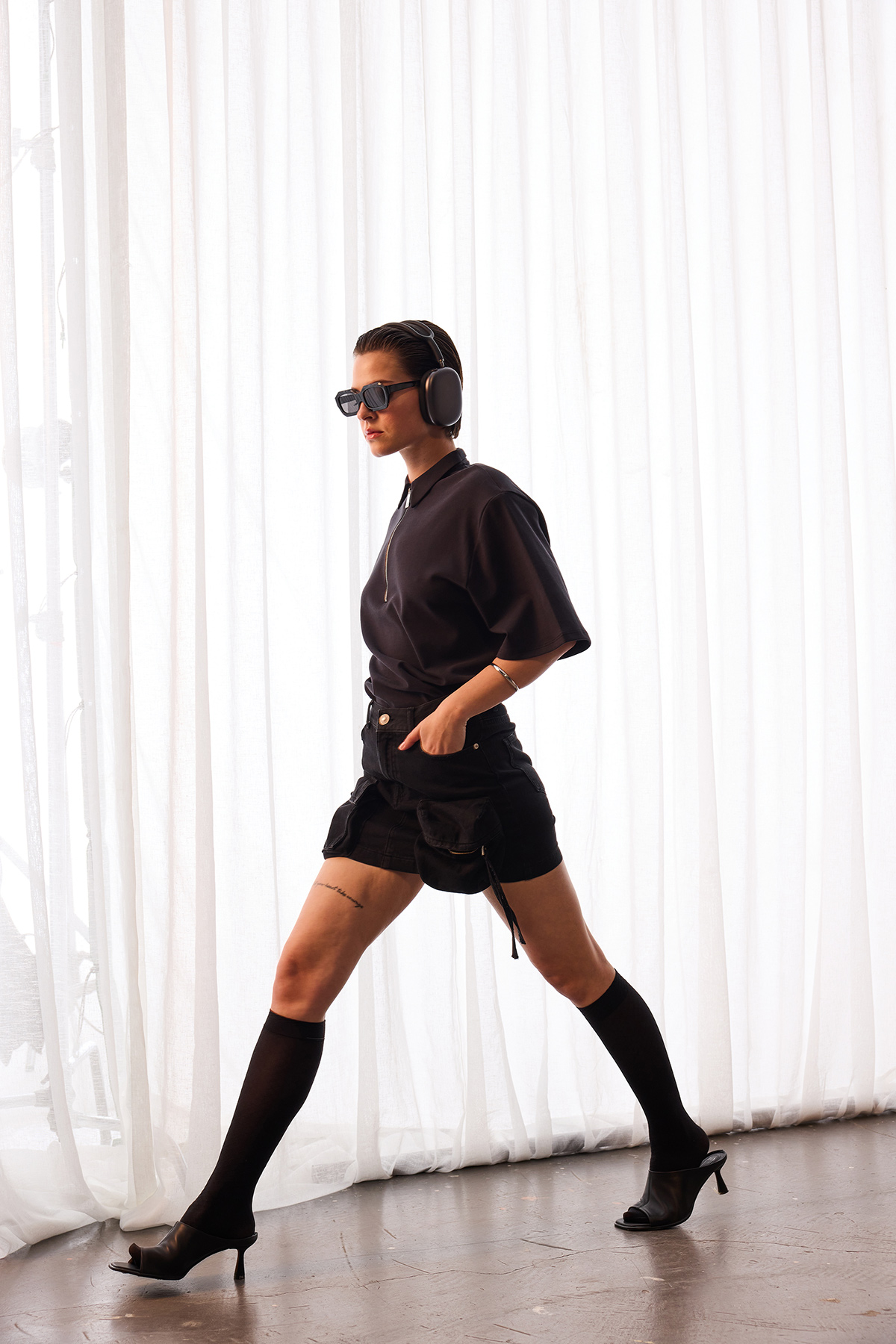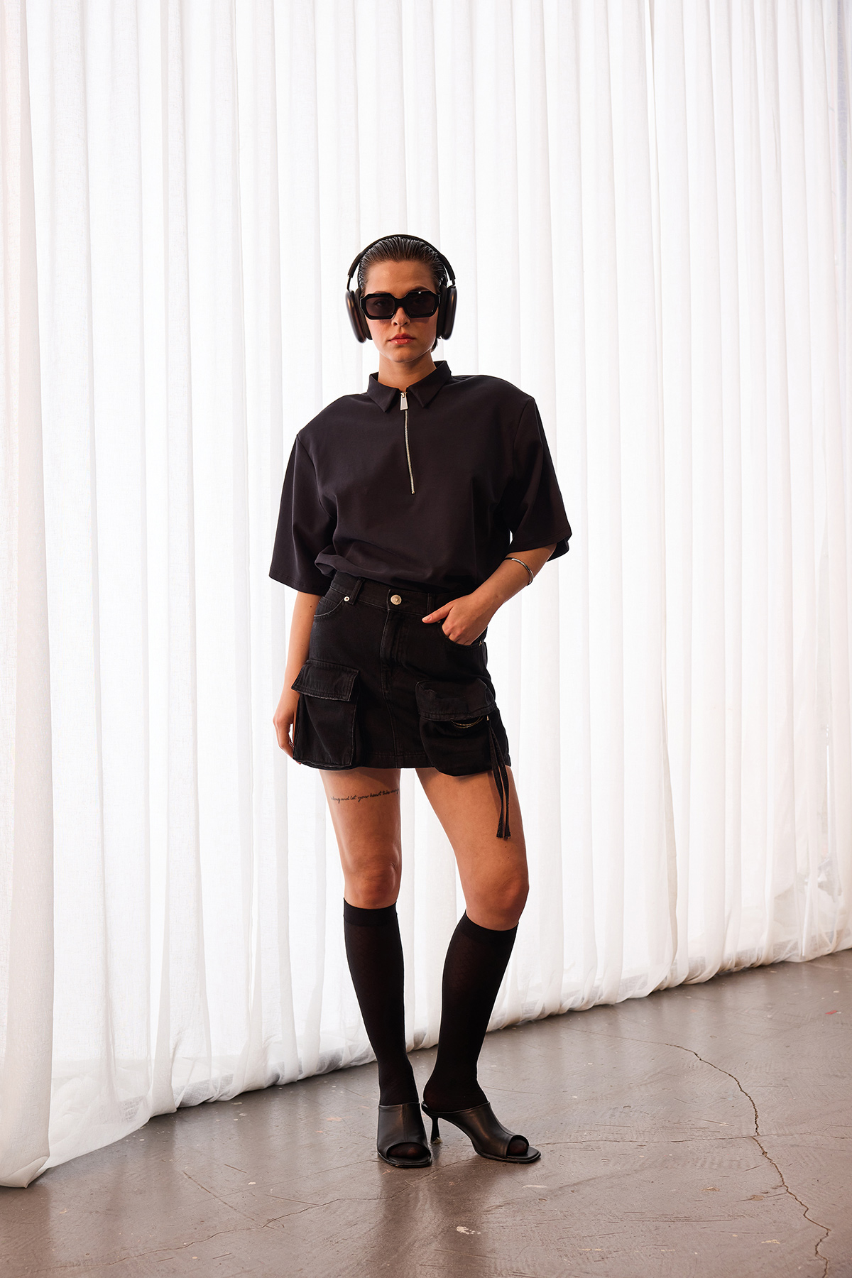 Yüksek bel, düğmeli ve fermuarlı, tam kalıp, kargo cepli, mini denim kargo etek.