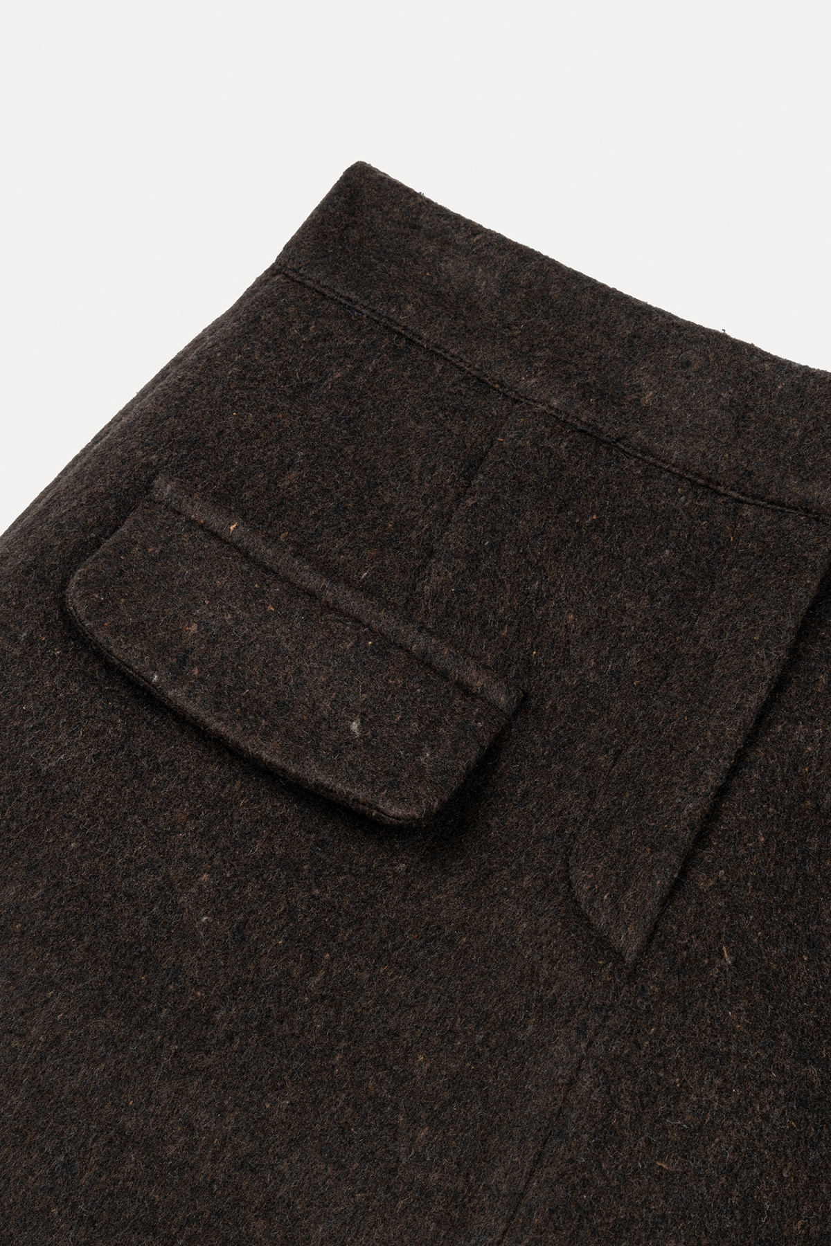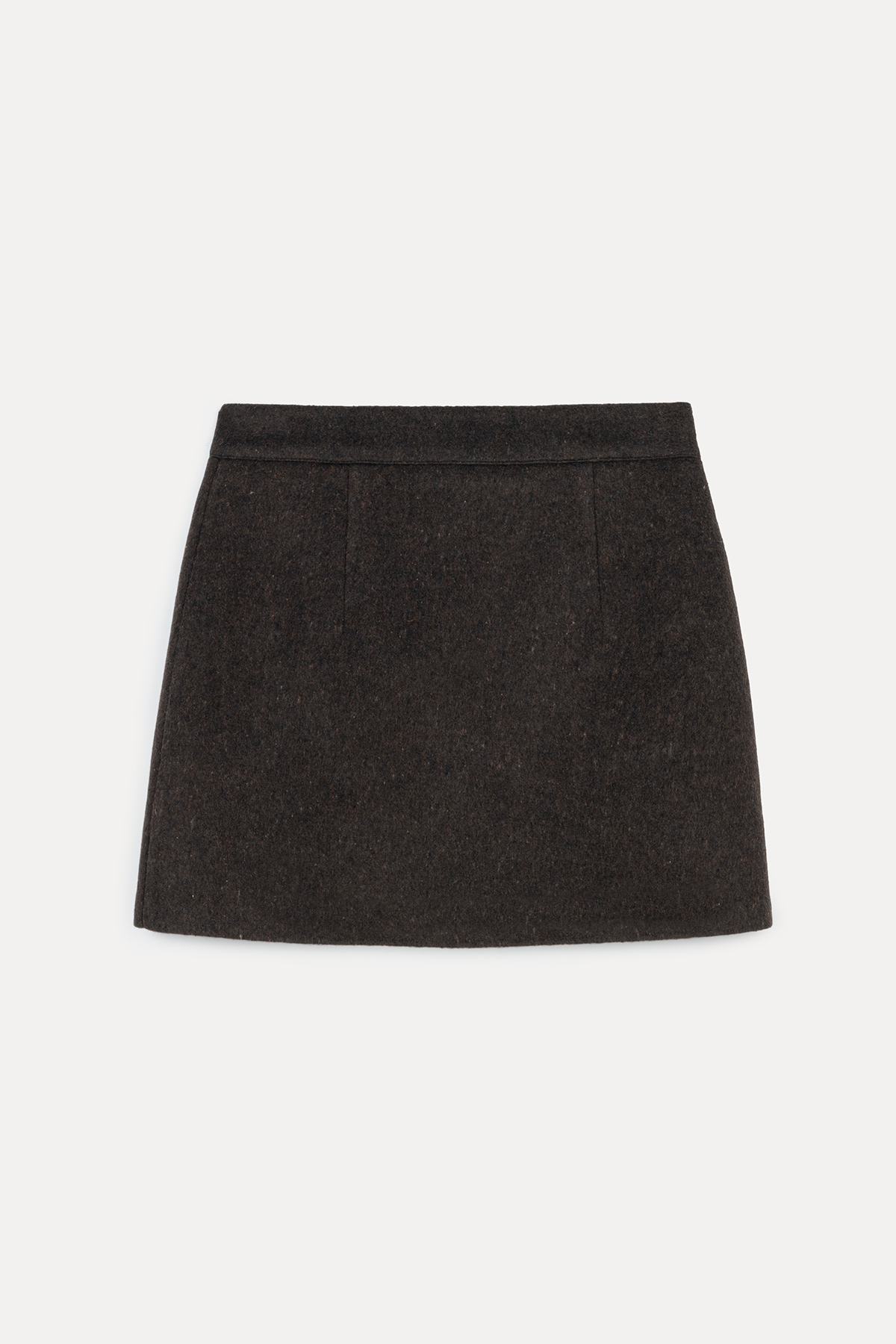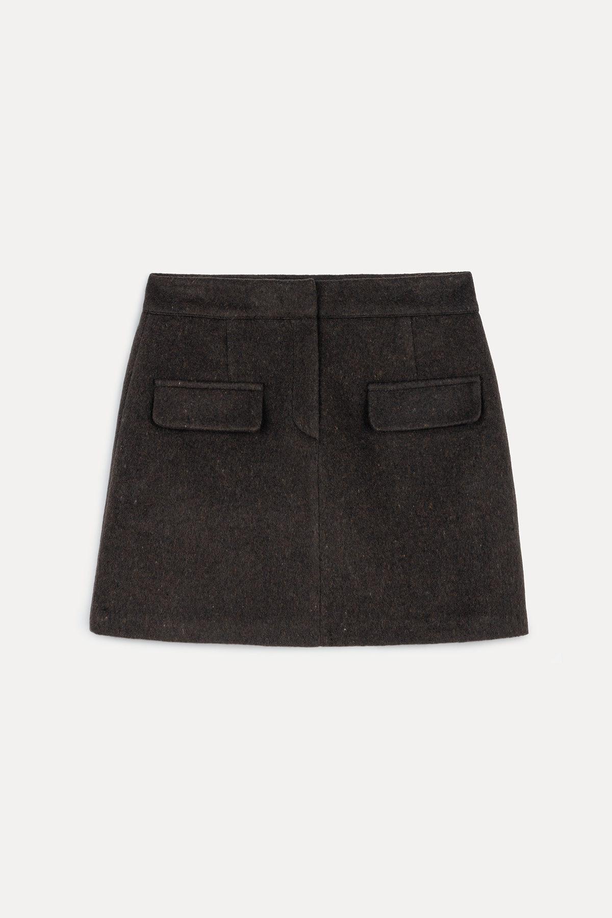 Yüksek bel, cepsiz , kopçalı ve fermuarlı,tam kalıp, mini kaşe etek.