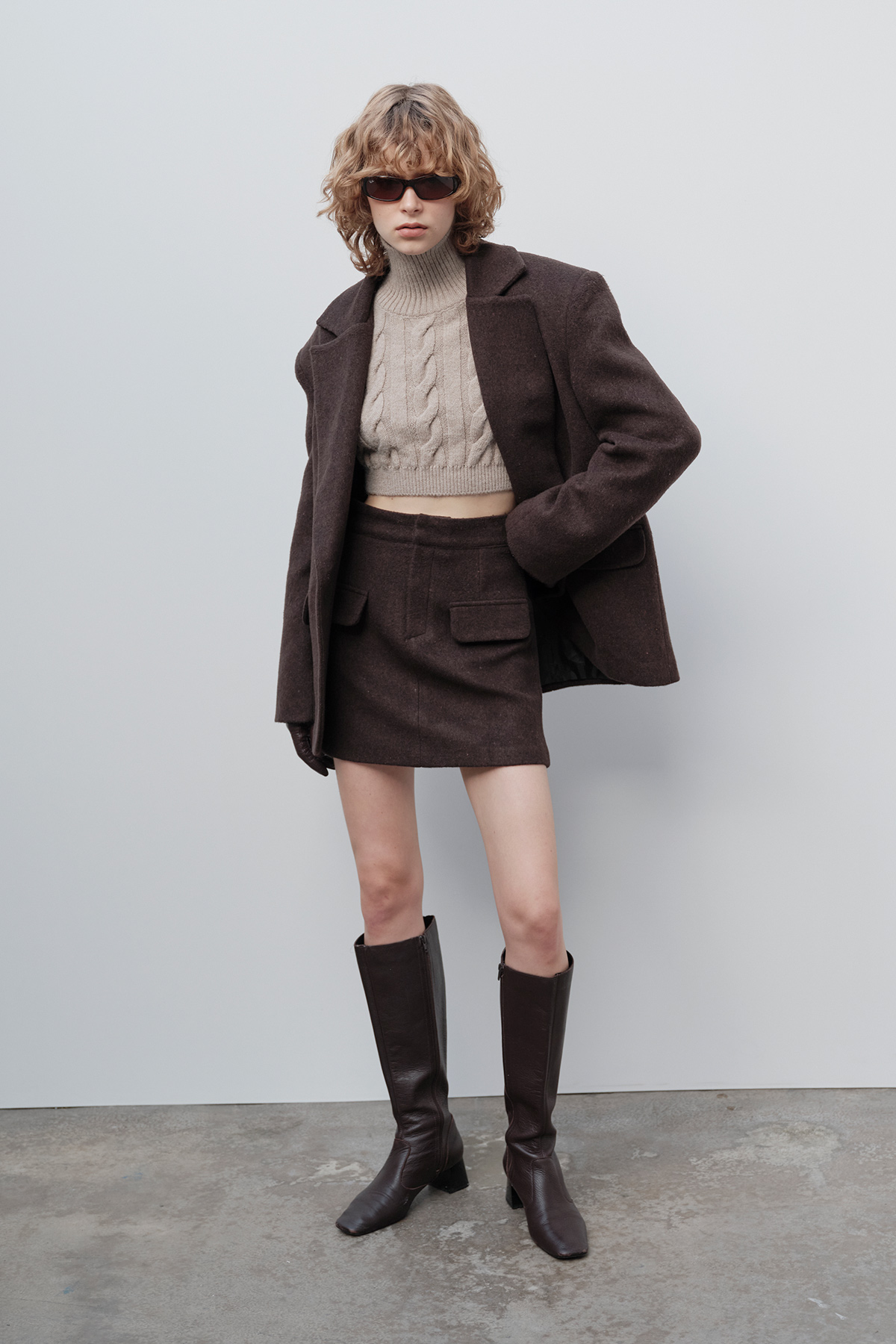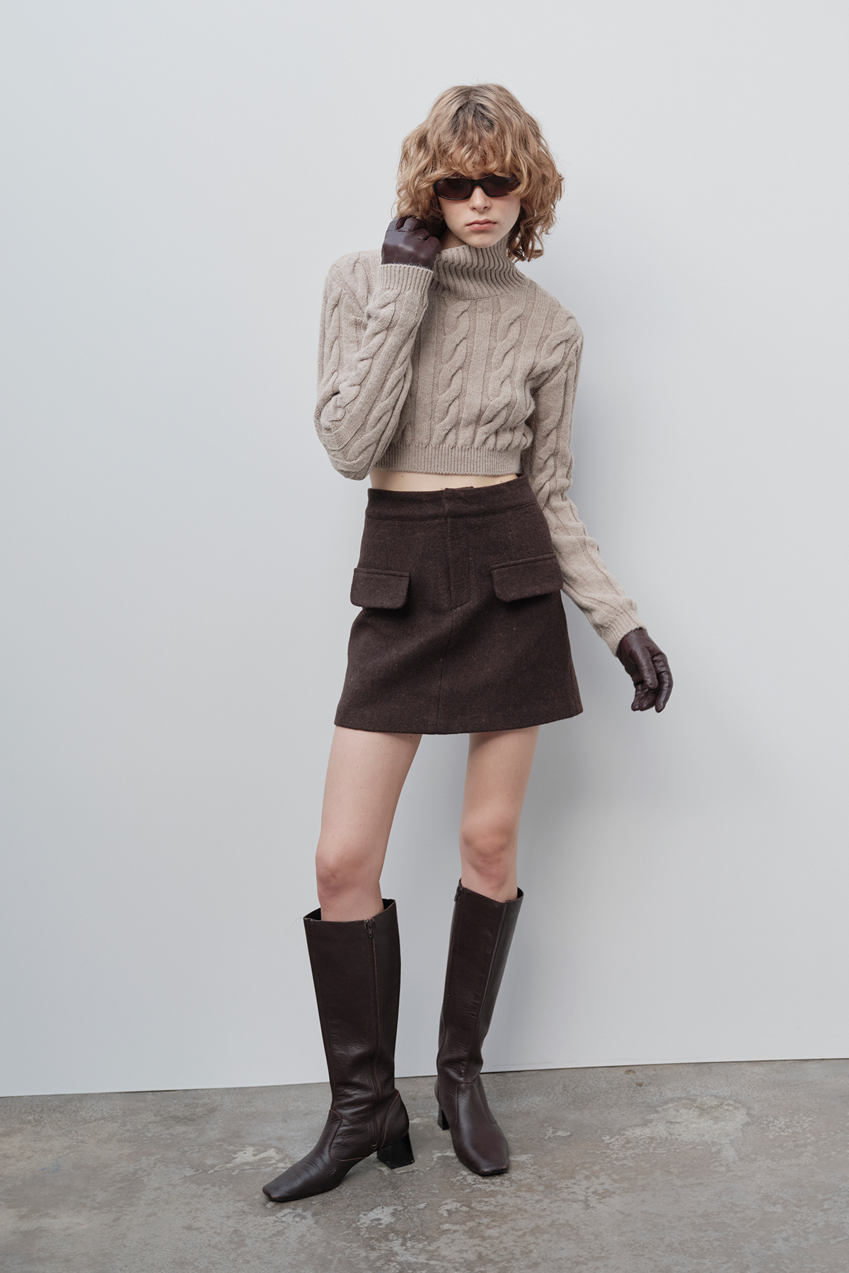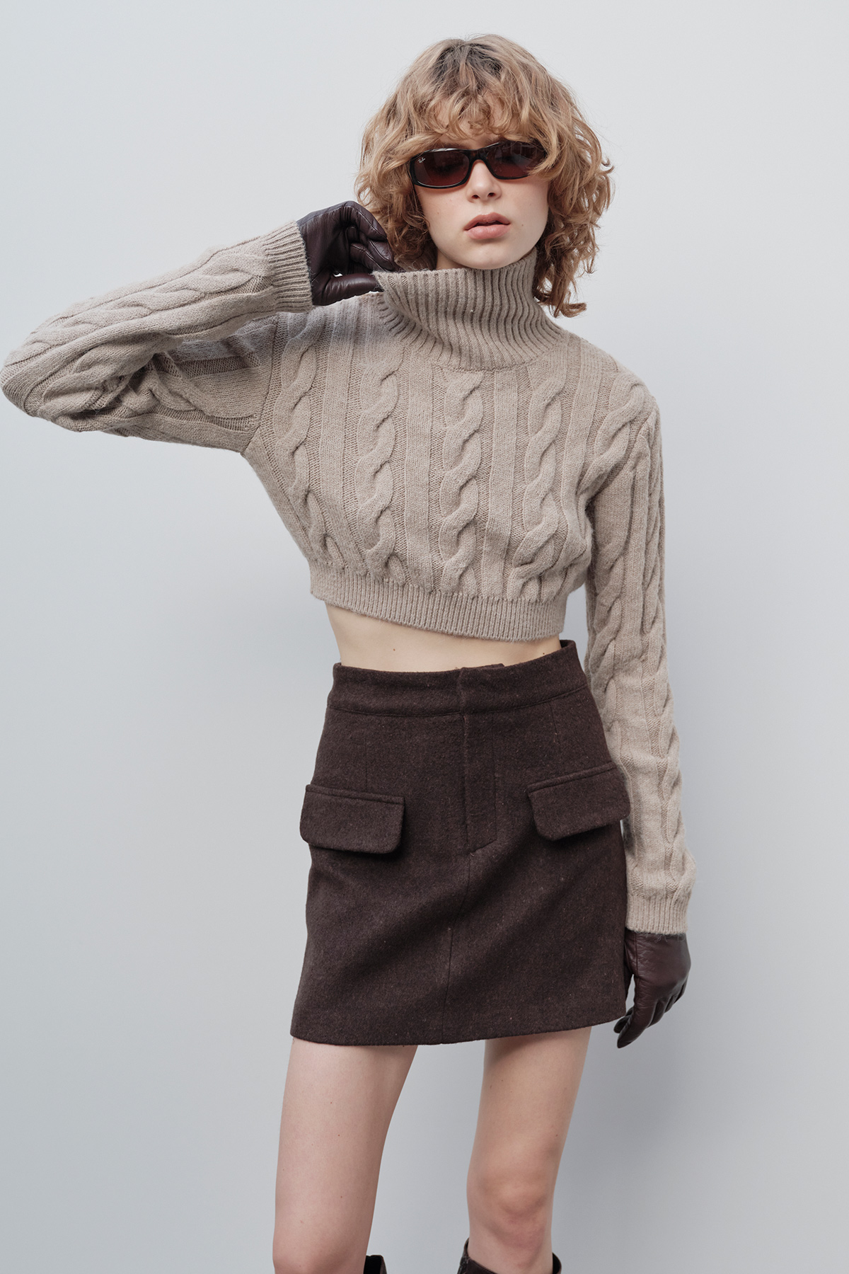 Yüksek bel, cepsiz , kopçalı ve fermuarlı,tam kalıp, mini kaşe etek.
